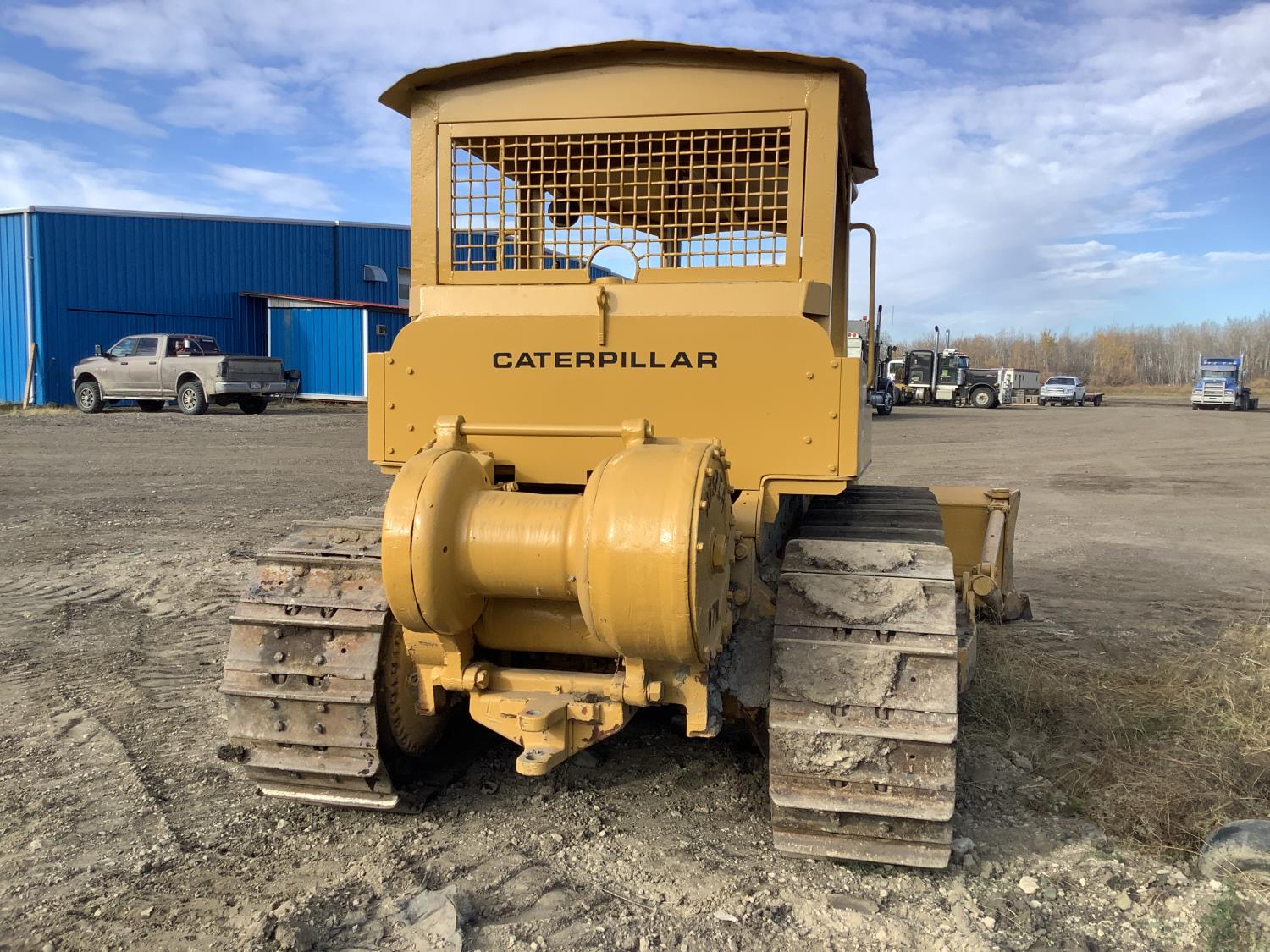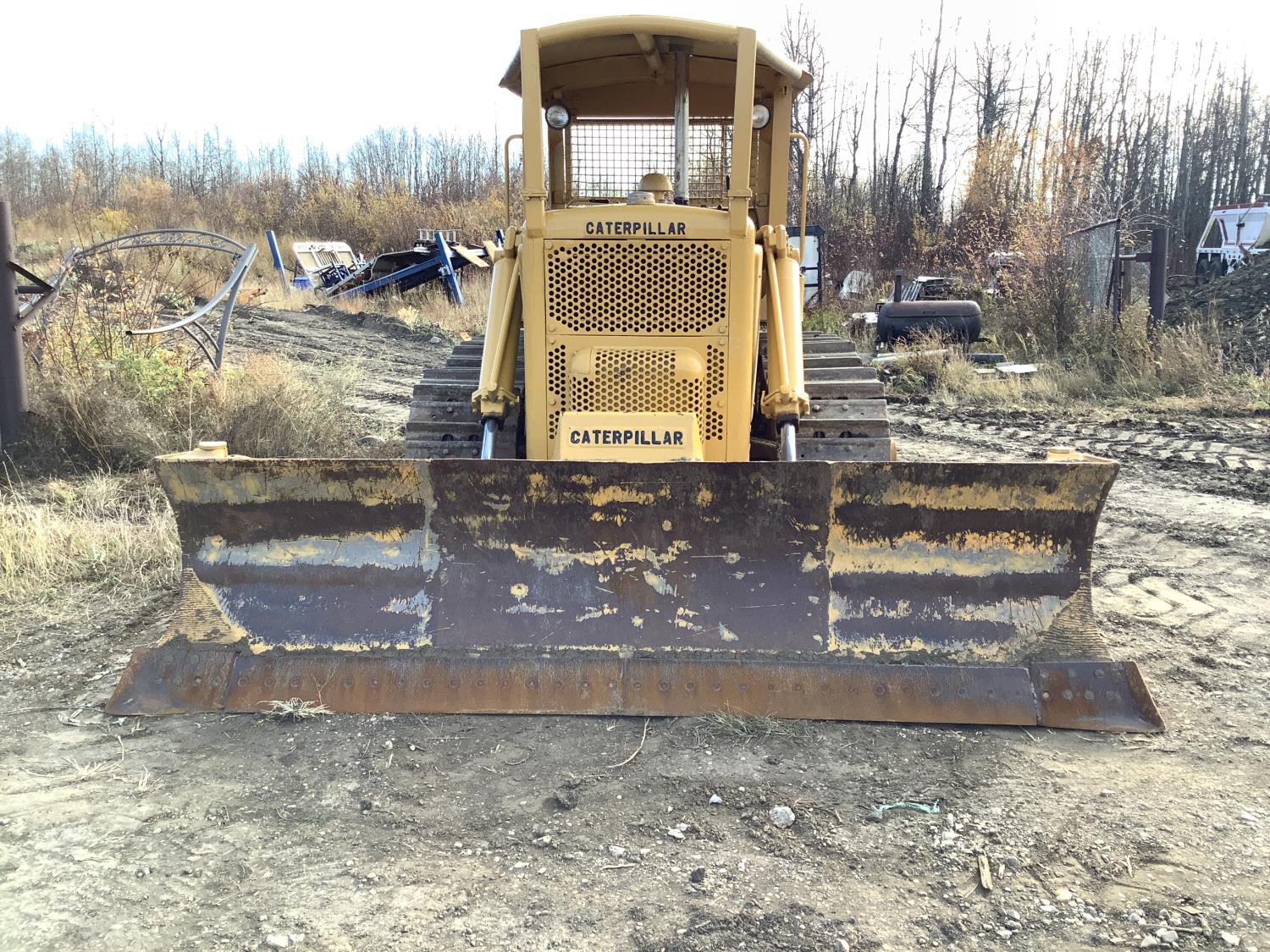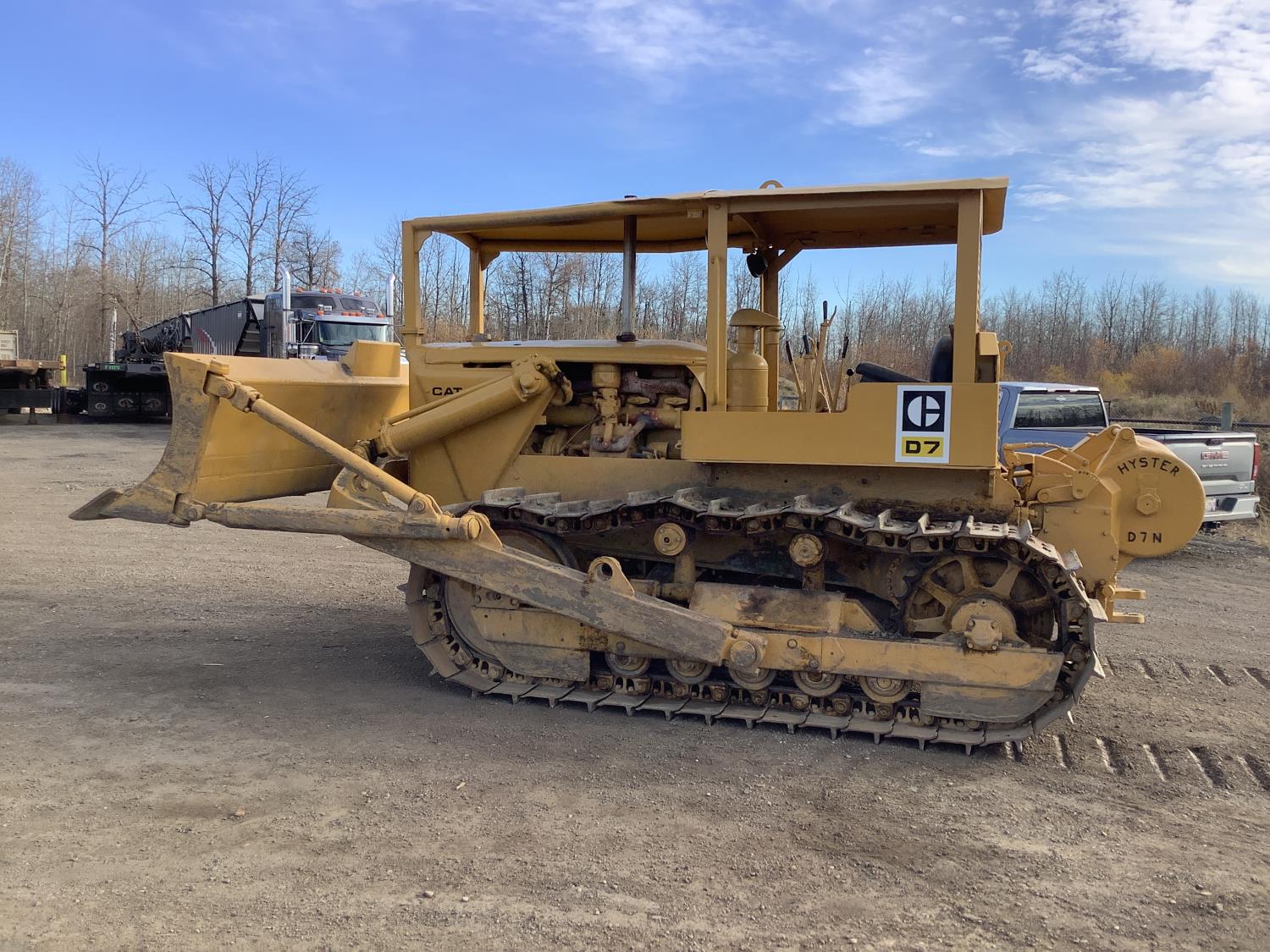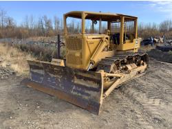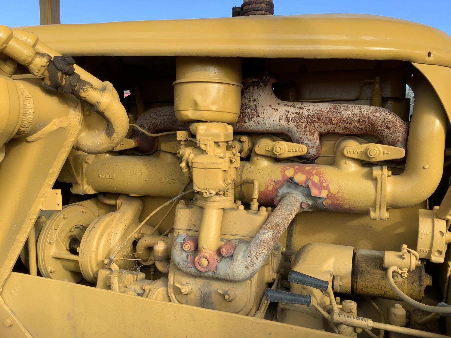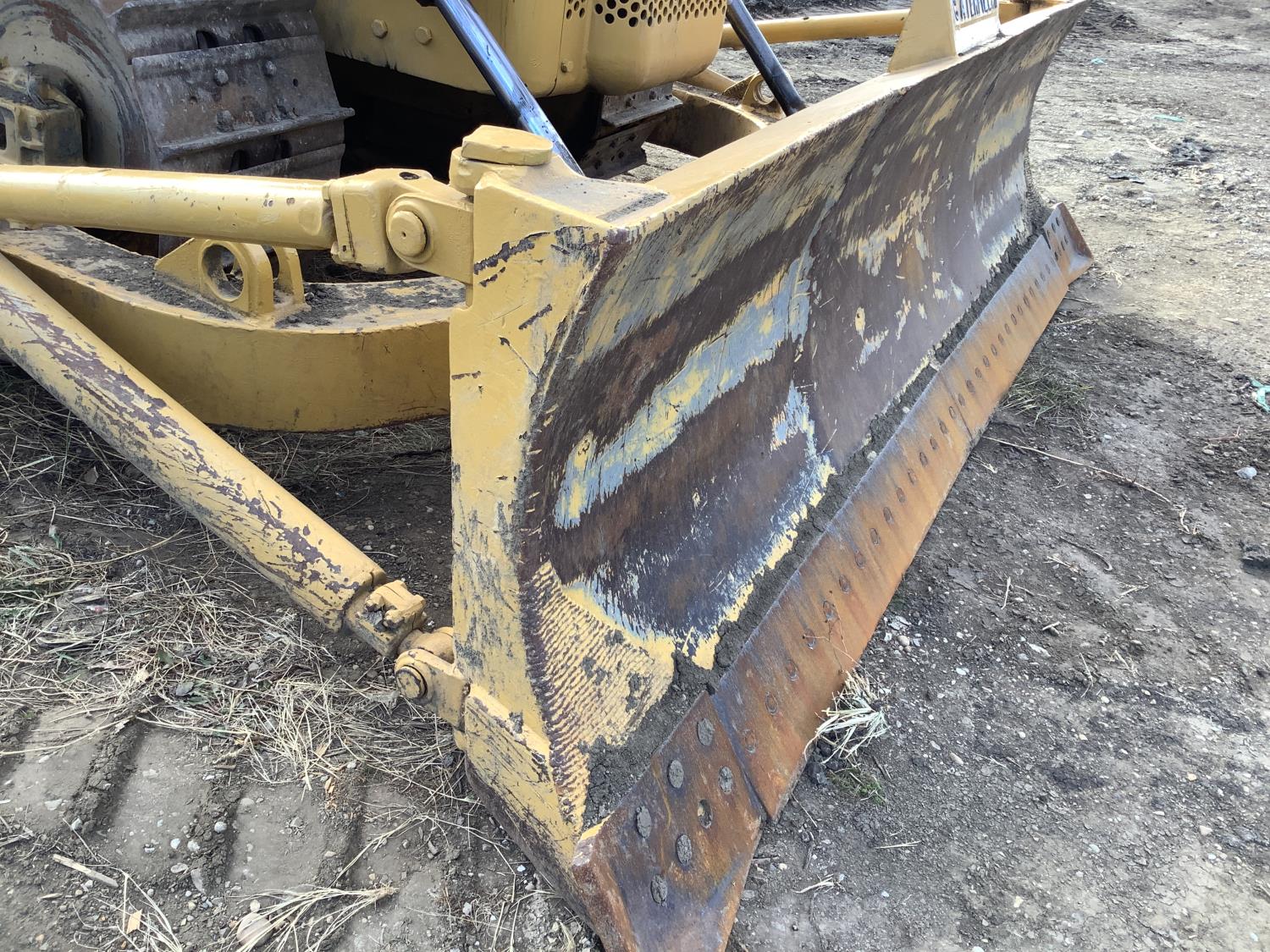 Open station with canopy, gas pup starting motor, 4 cylinder diesel engine, standard transmission with oil clutch and Johnston bar forward and reverse, hydraulic manual angle C Frame blade, rear Hyster winch, drawbar
