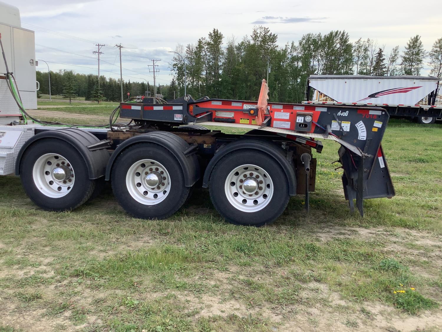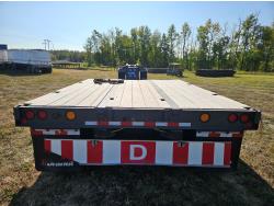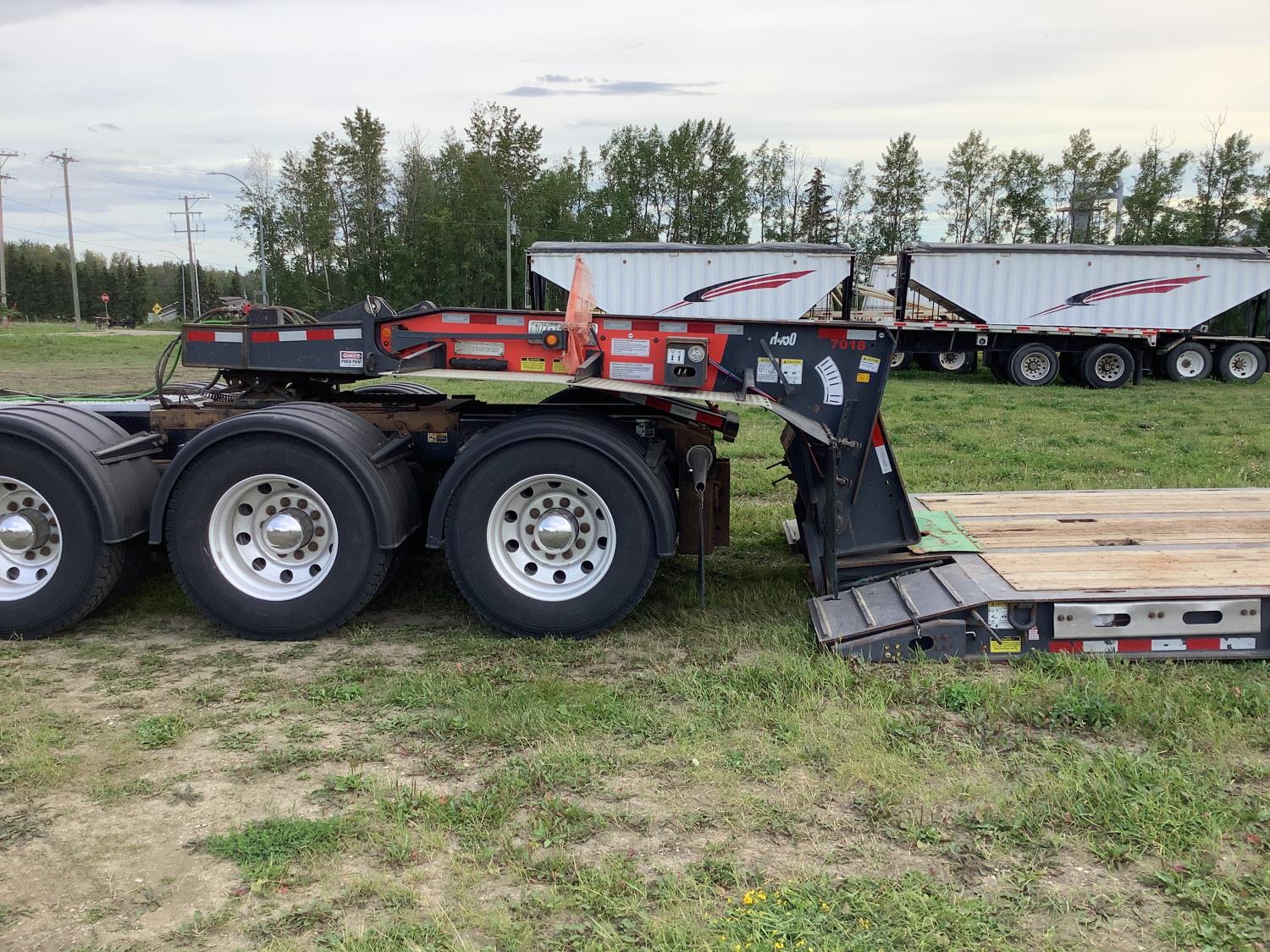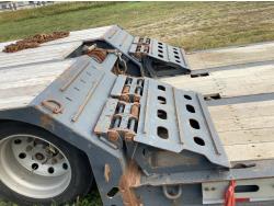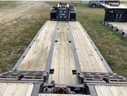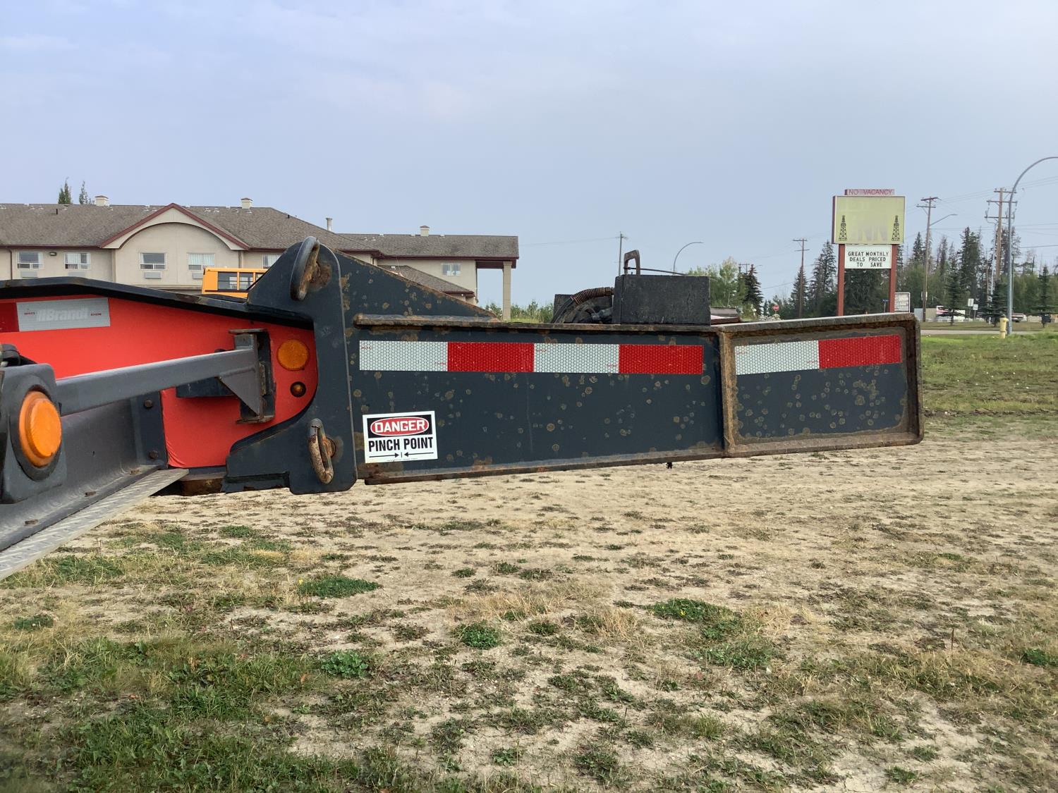 10 ft wide, aluminum pull out extensions to 15 ft wide on main deck, 30 ft long main deck and 13 ft long rear deck. wide load and rear strobe lights, flip neck extension for tandem jeep and removable pin with 3 hole location, 3 bar winch’s, in floor chain tie downs, hydraulic stinger arm on removable neck, rear mounted hydraulic winch, flip up ramps for rear deck loading, air ride, all aluminum rims, 225/70R22.5