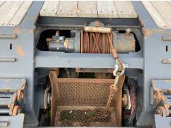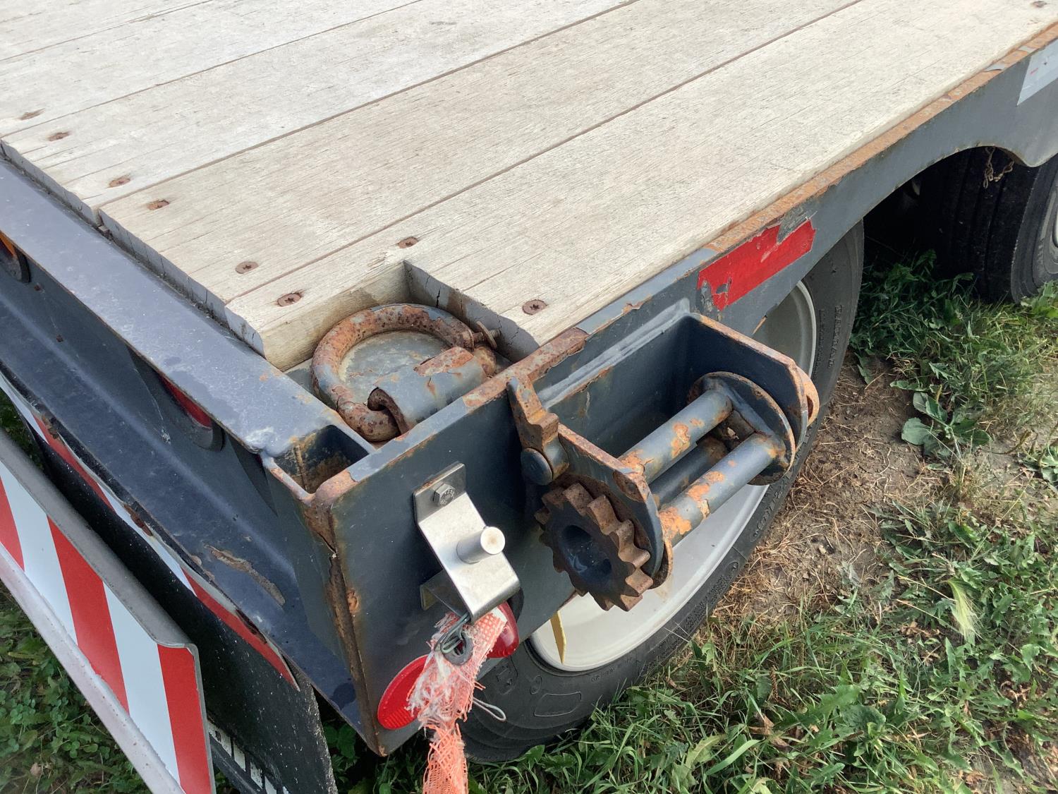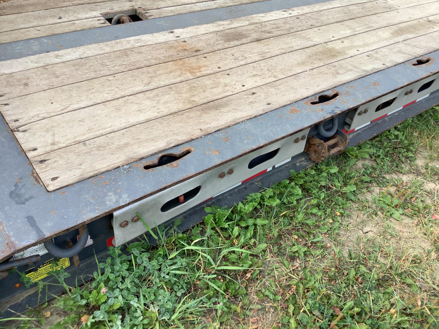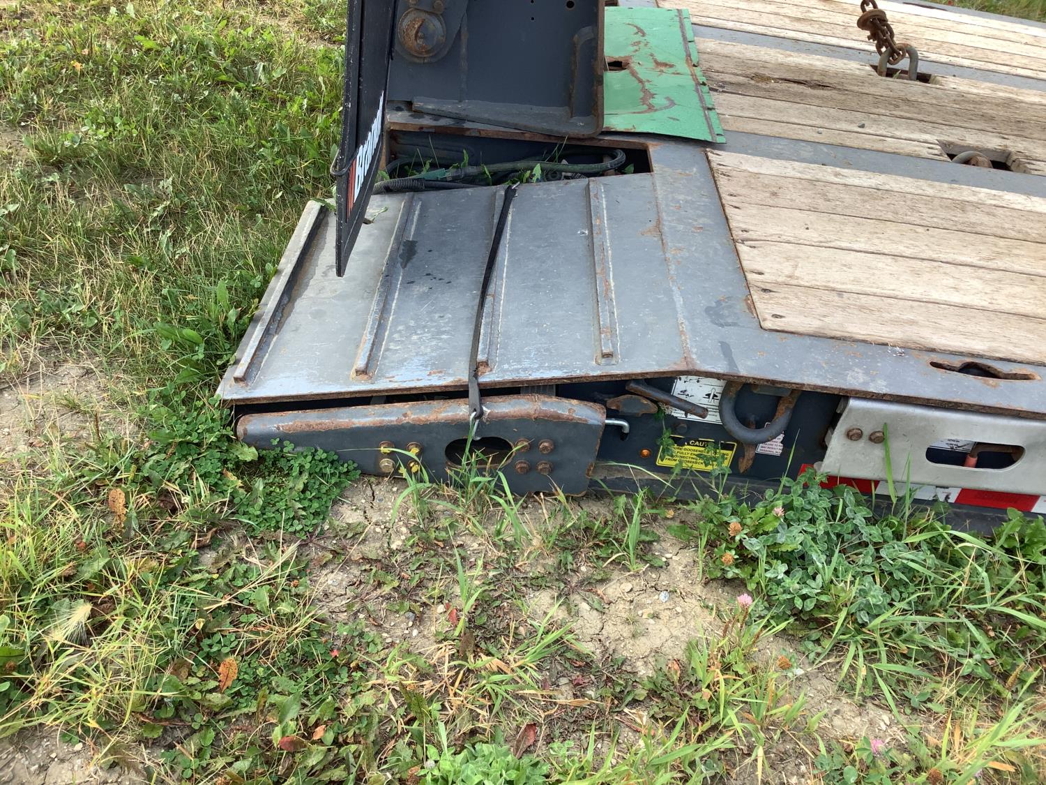 10 ft wide, aluminum pull out extensions to 15 ft wide on main deck, 30 ft long main deck and 13 ft long rear deck. wide load and rear strobe lights, flip neck extension for tandem jeep and removable pin with 3 hole location, 3 bar winch’s, in floor chain tie downs, hydraulic stinger arm on removable neck, rear mounted hydraulic winch, flip up ramps for rear deck loading, air ride, all aluminum rims, 225/70R22.5