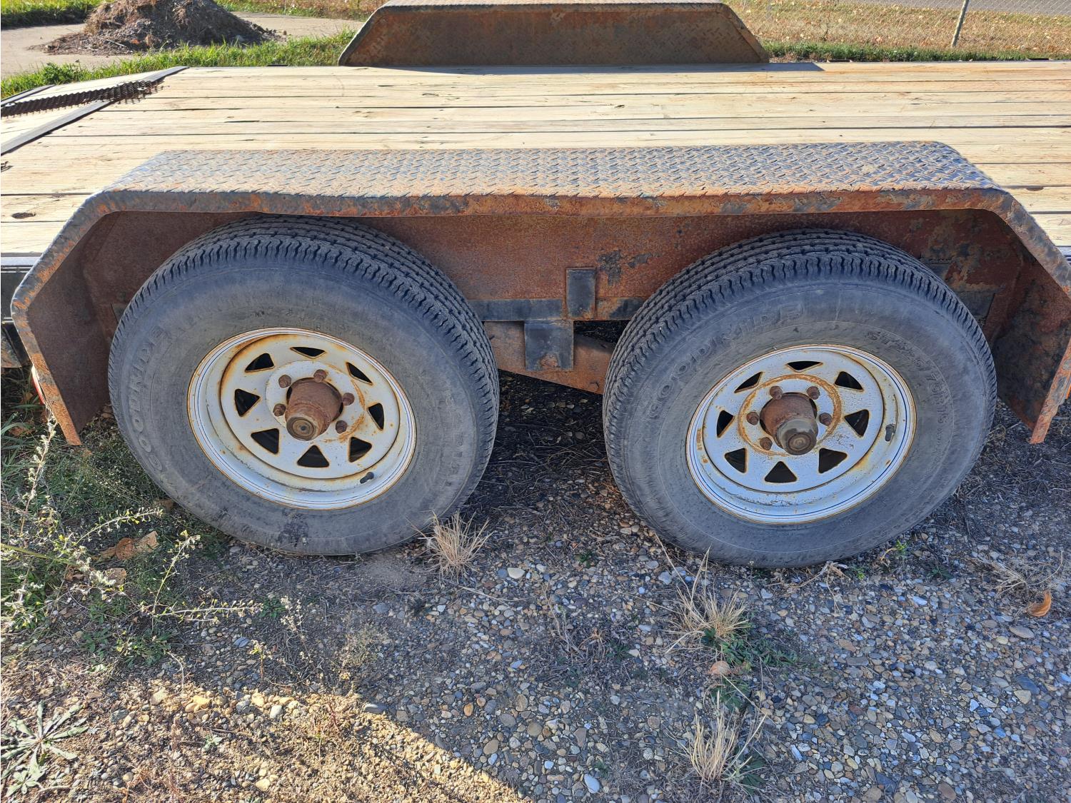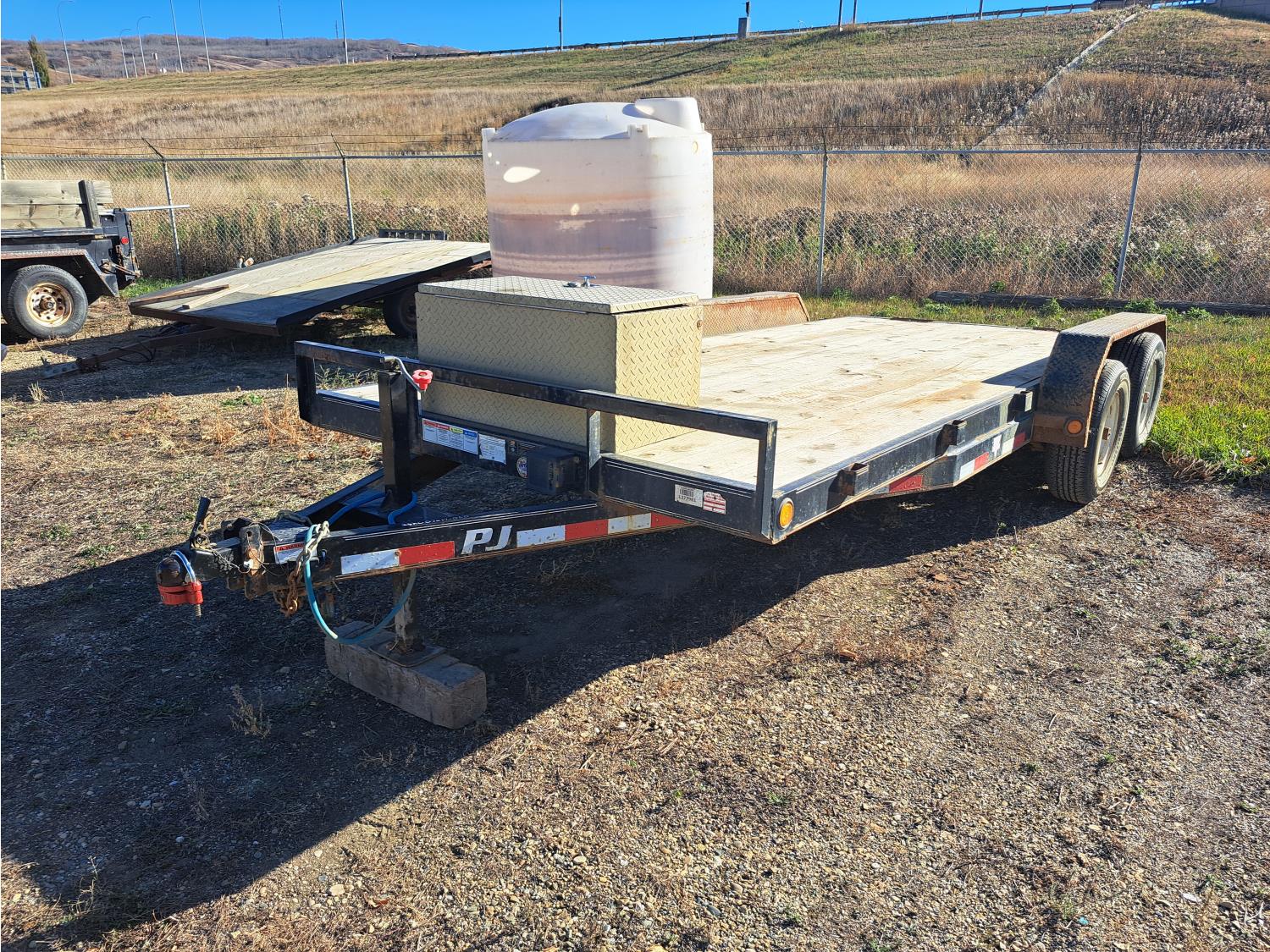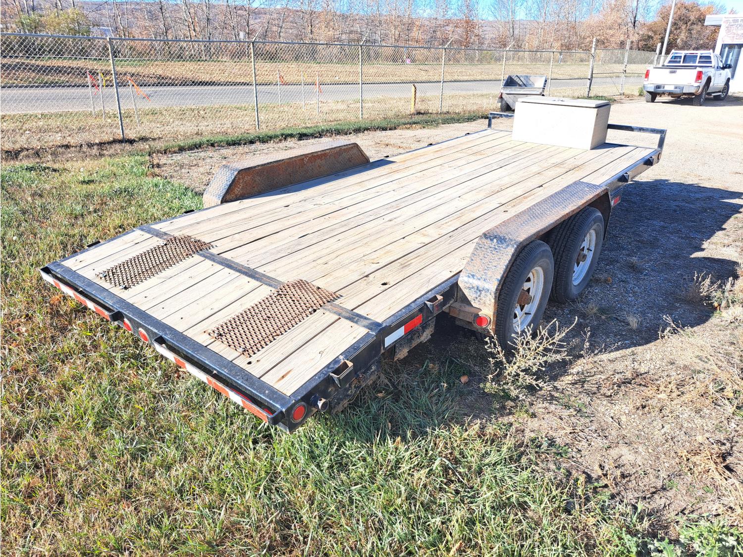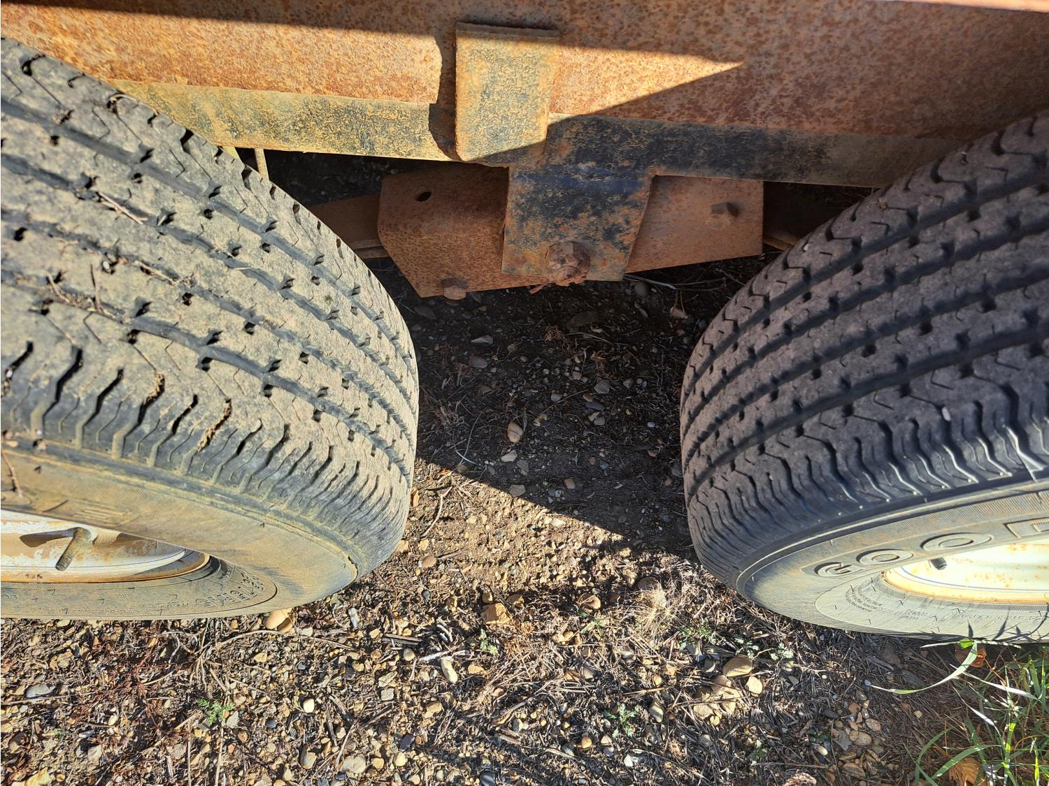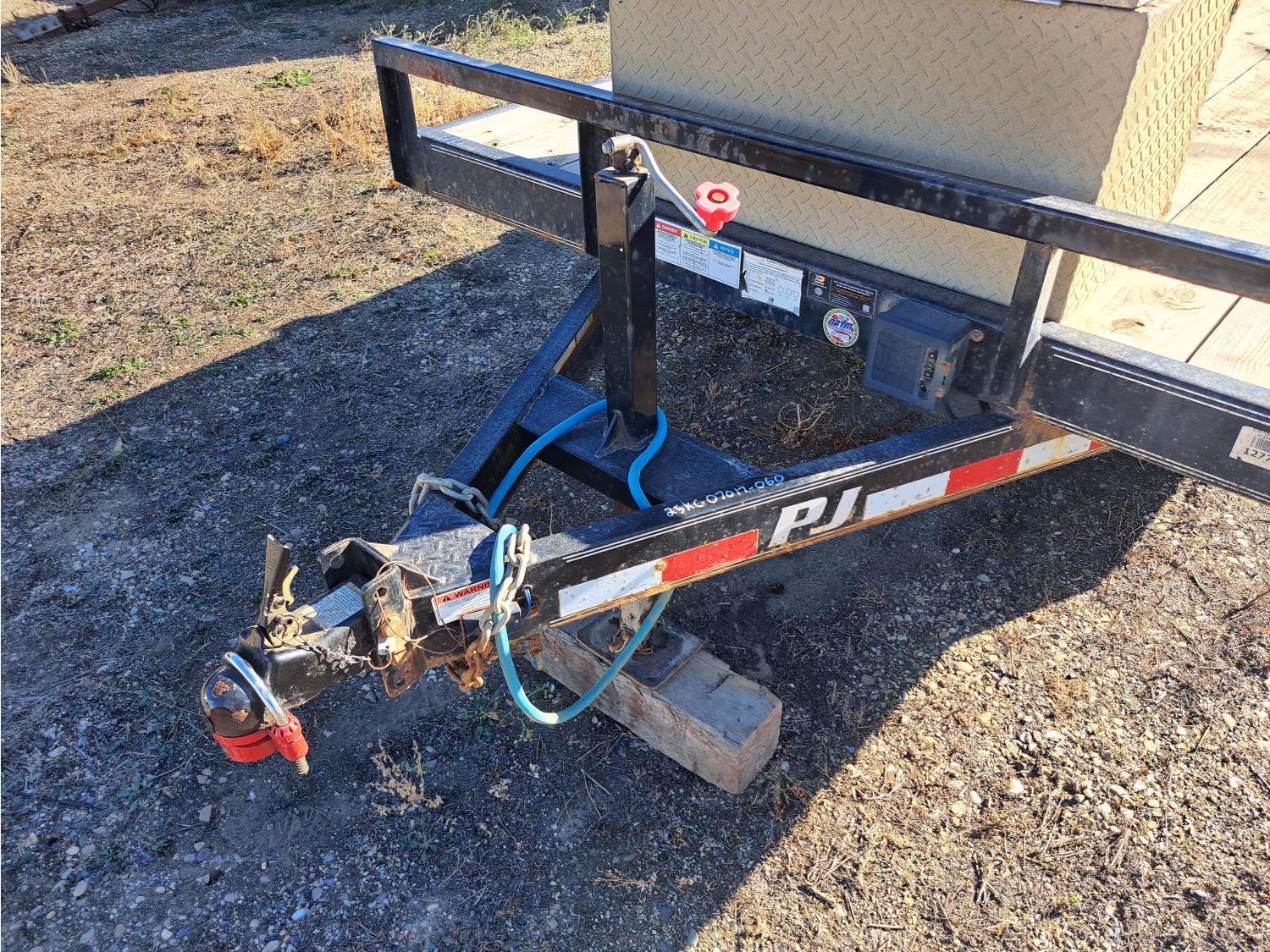 86 inch wide deck, wood deck, spring suspension, ball hitch, tool / storage box, stake pockets, 5000 lb axles, 225/75R15 tires
