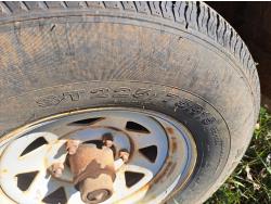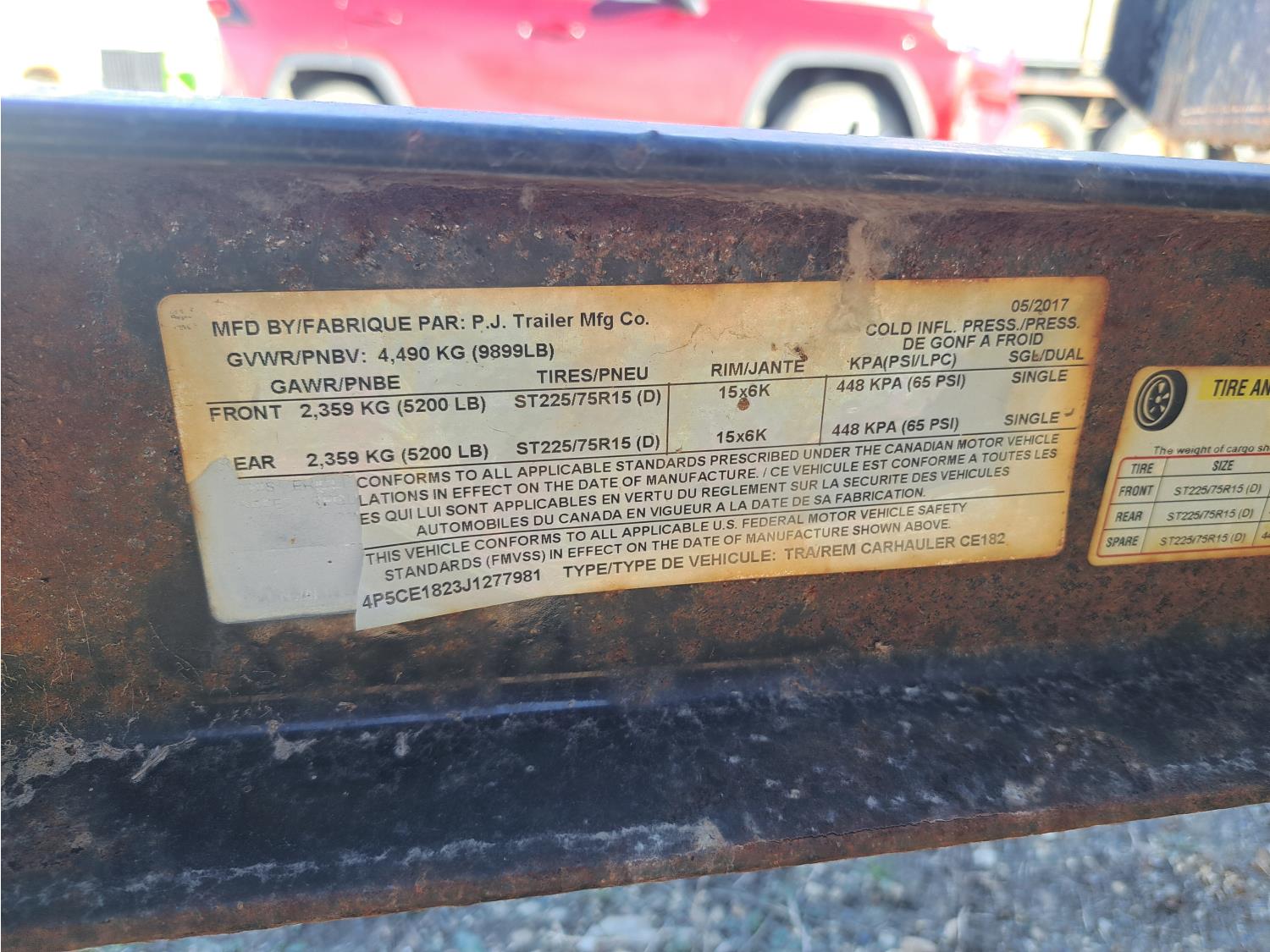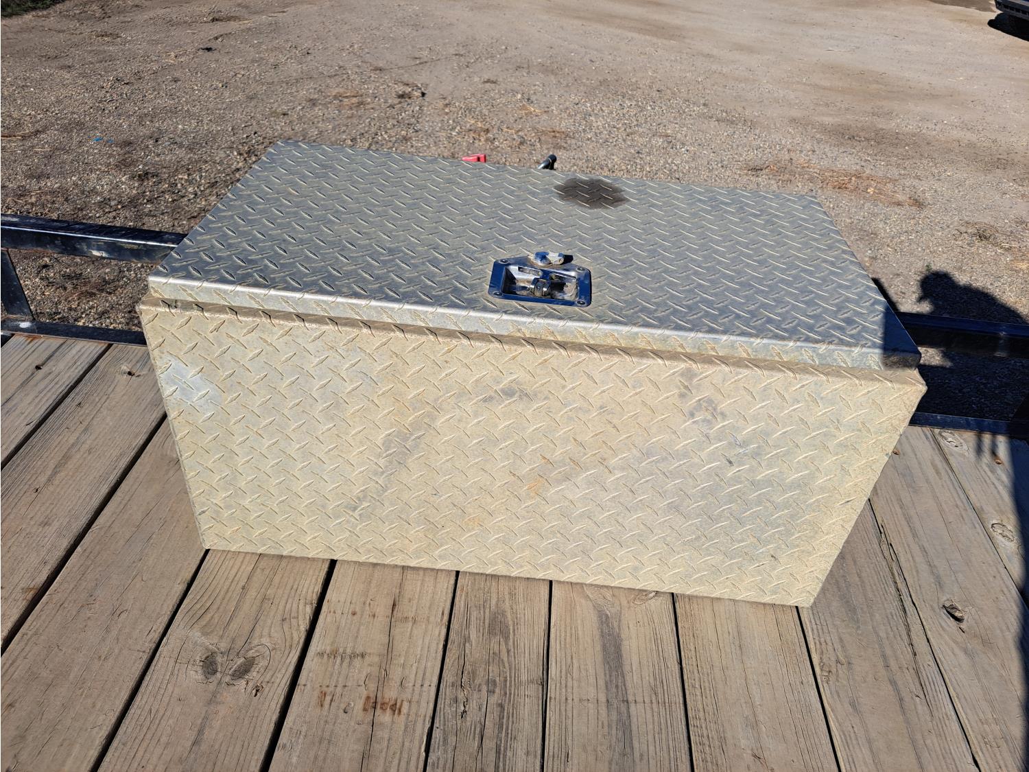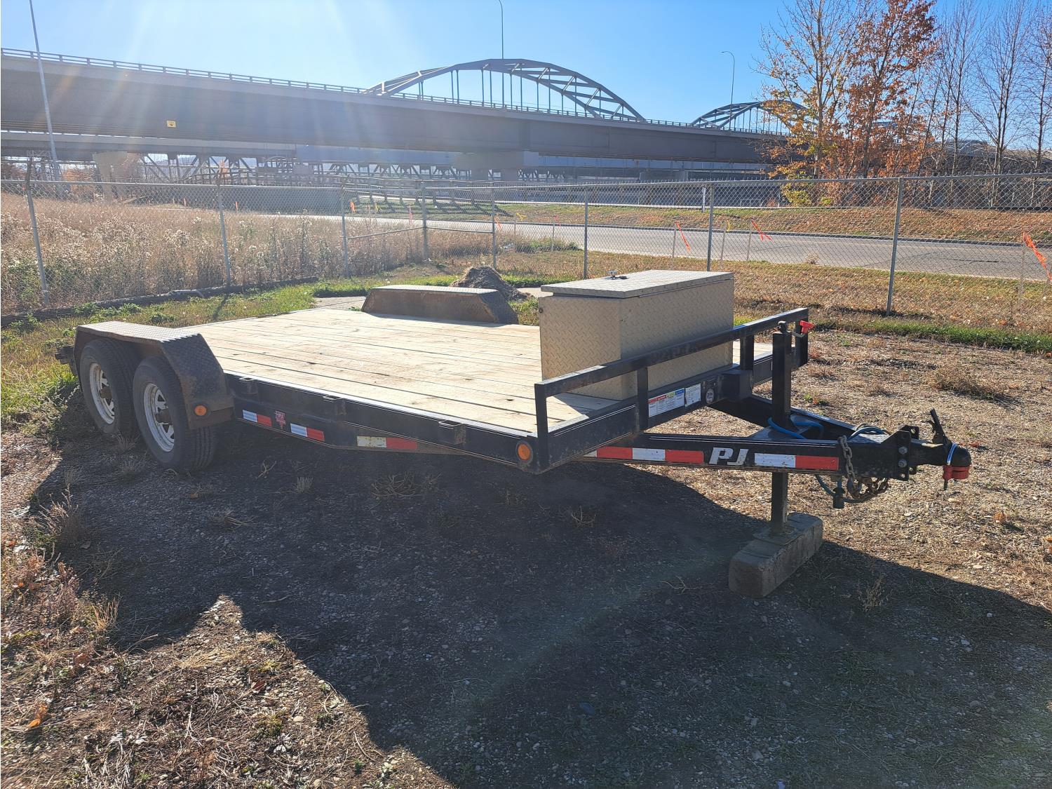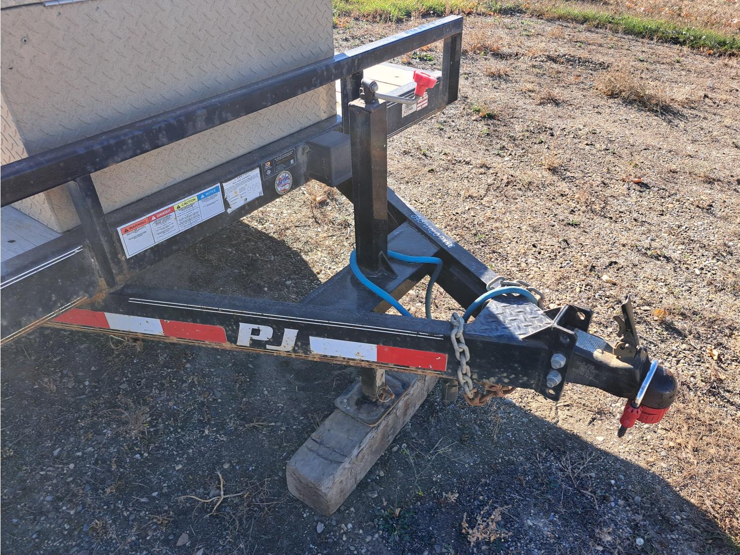 86 inch wide deck, wood deck, spring suspension, ball hitch, tool / storage box, stake pockets, 5000 lb axles, 225/75R15 tires