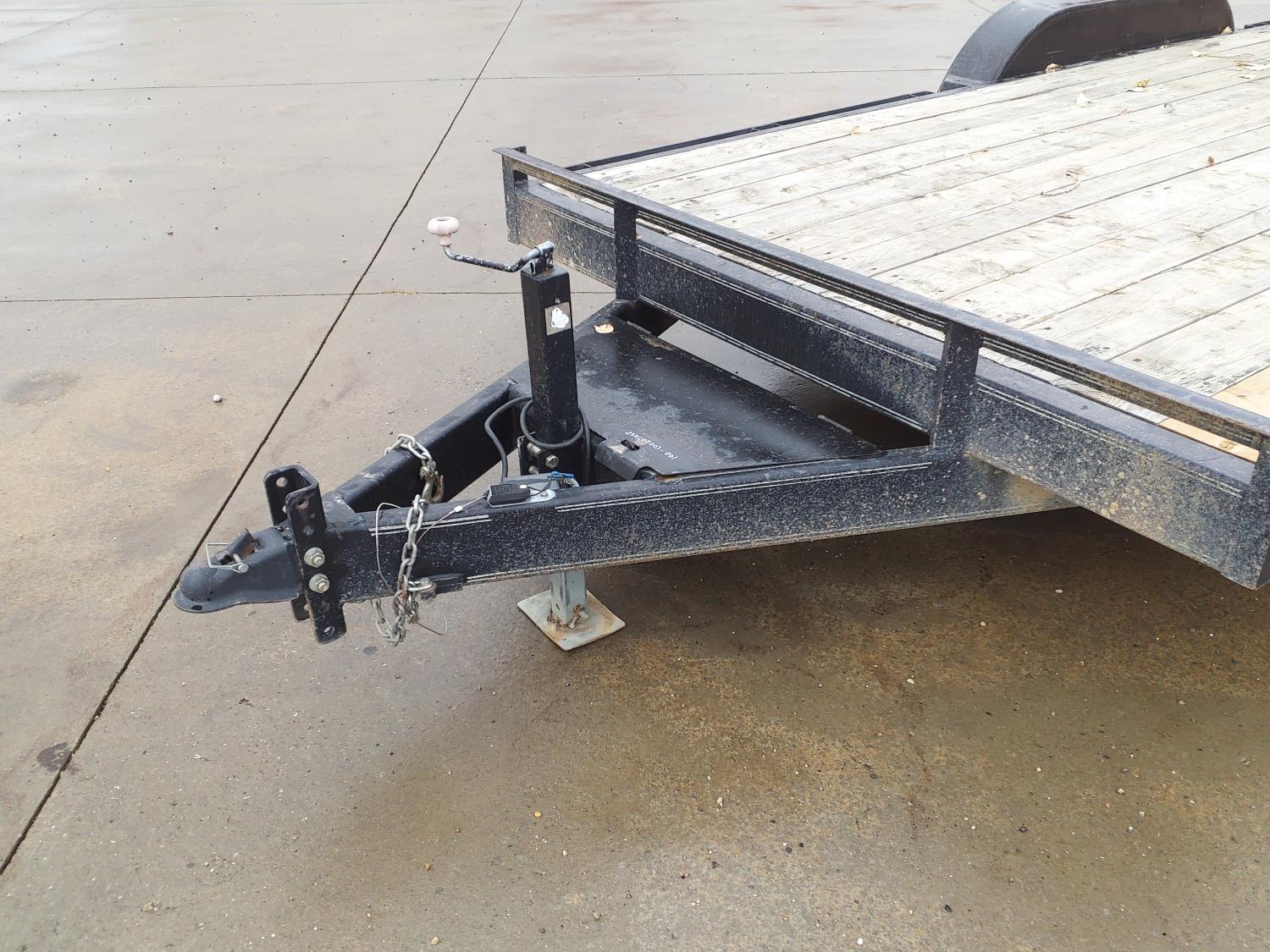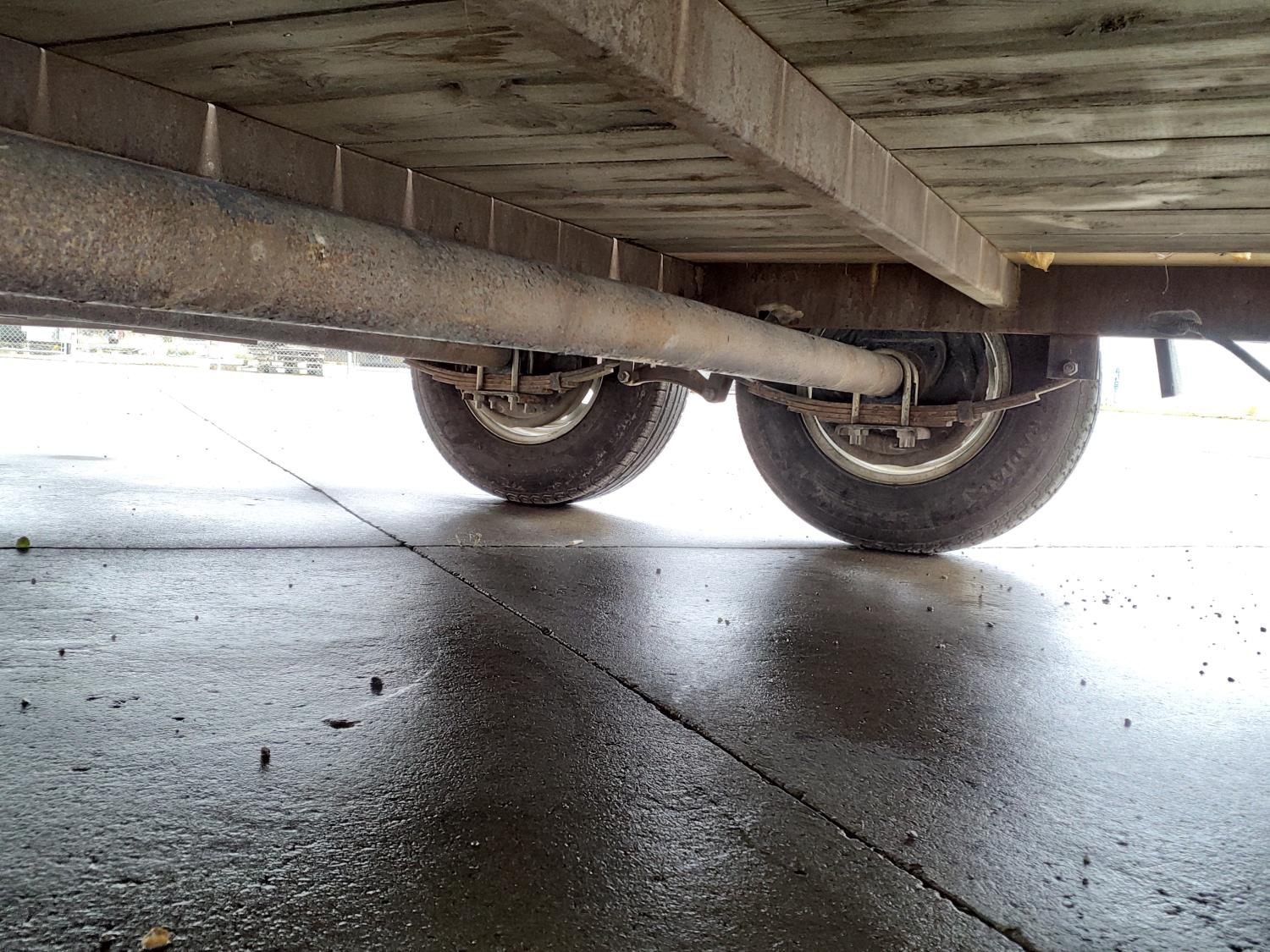 82 inch wide deck, wood deck, slide in ramps, spring suspension, ball hitch, tool / storage box, rub rails, stake pockets, 5000 lb axles, 225/75R15 tires