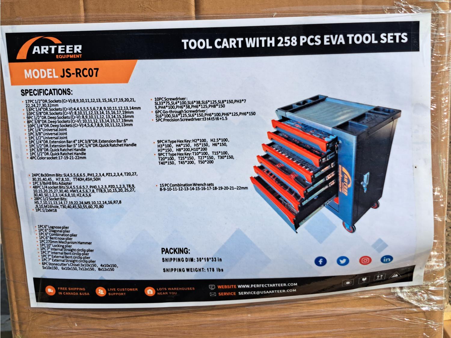 89 Arteer JS-RC07 Tool Cart with 258 Pieces Eva Tool Set (Unused)