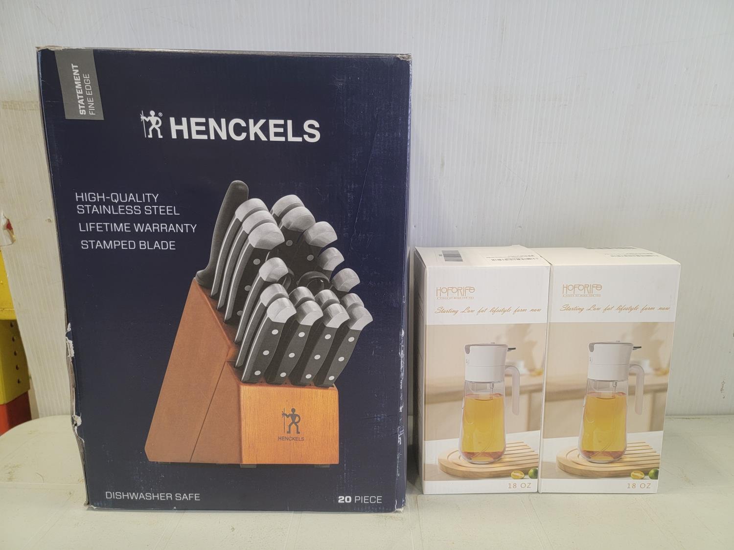 5308 (2) 2-in-1 Oil Spray Bottles and Henckels 20 Piece Knife Set (Unused)