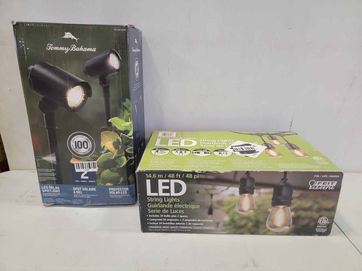 48 Ft LED String Lights and 2 Piece LED Solar Spotlights (Unused)