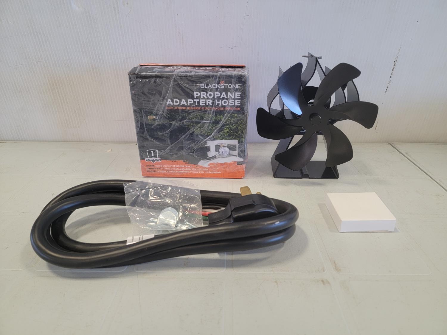 5297 Blackstone Propane Adapter Hose, (2) 30A 125/250V Power Cords and Wood Stove Fan (Unused)