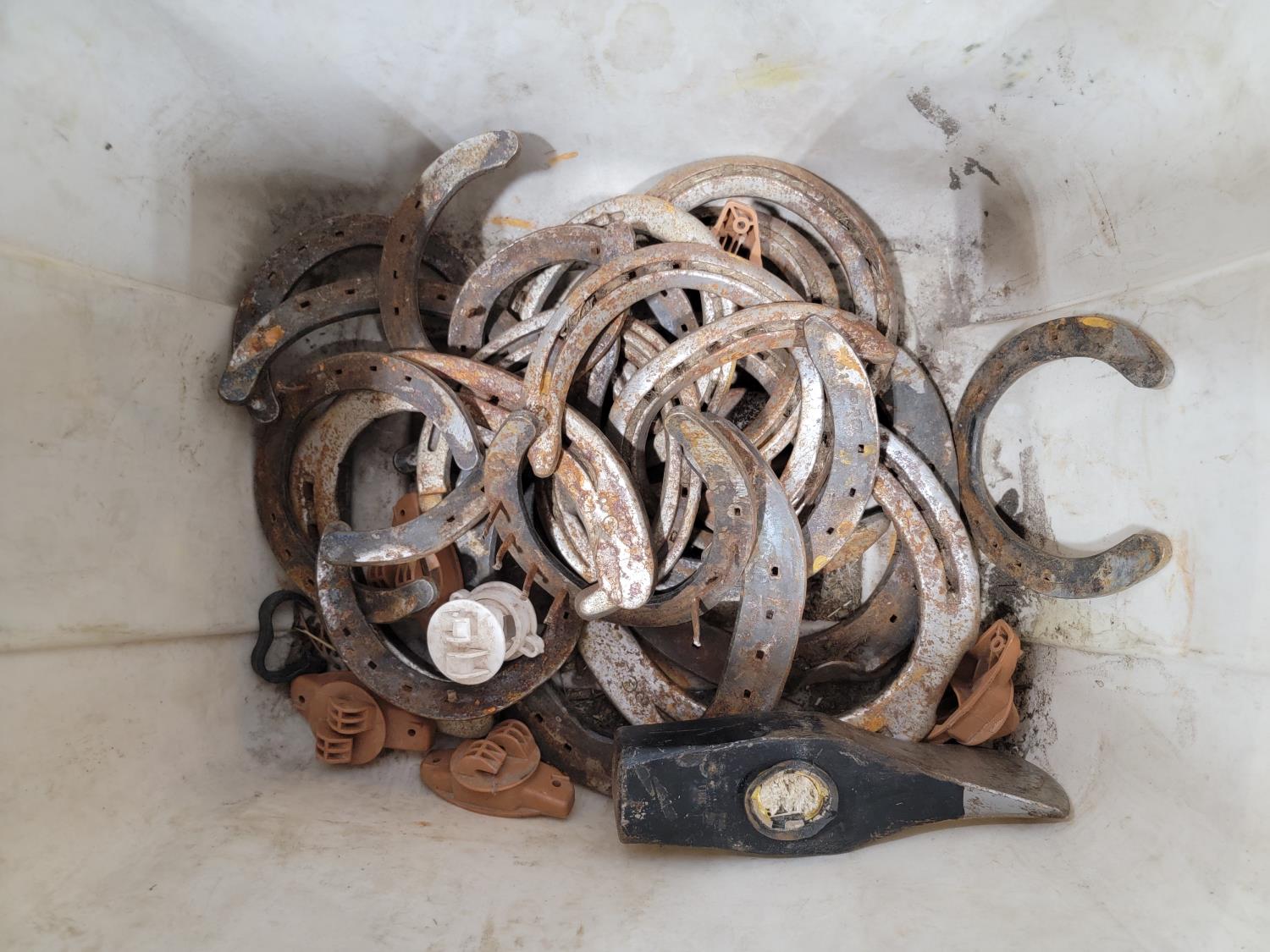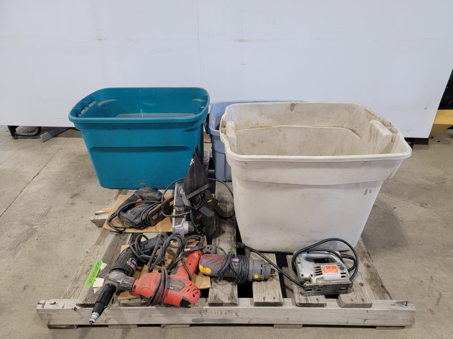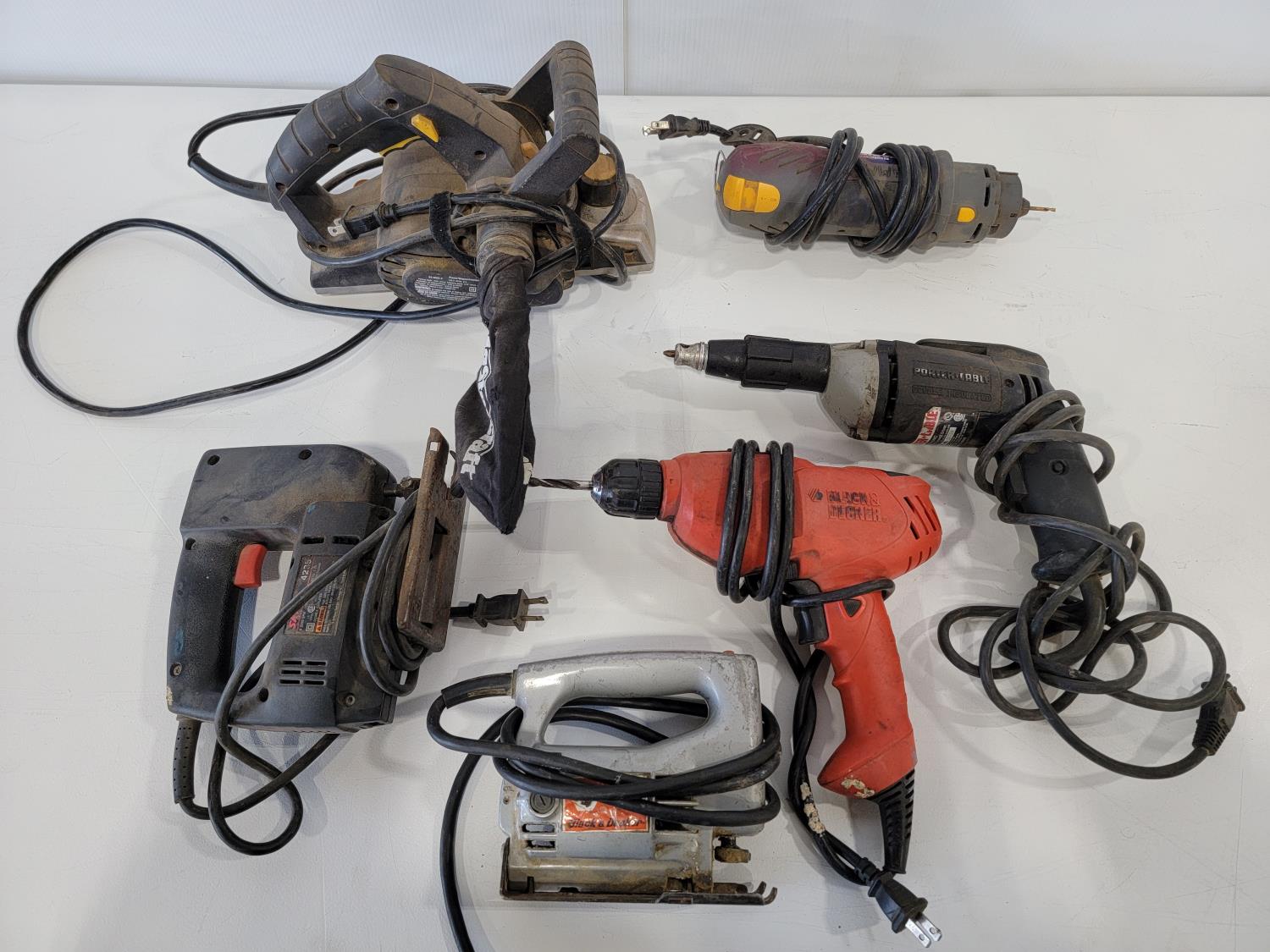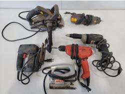 Horse shoes, caster wheels, Mastercraft planer, Mastercraft rotary trim saw, Porter Cable drywall driver, Black & Decker drill, Skil jig saw, Black & Decker jig saw