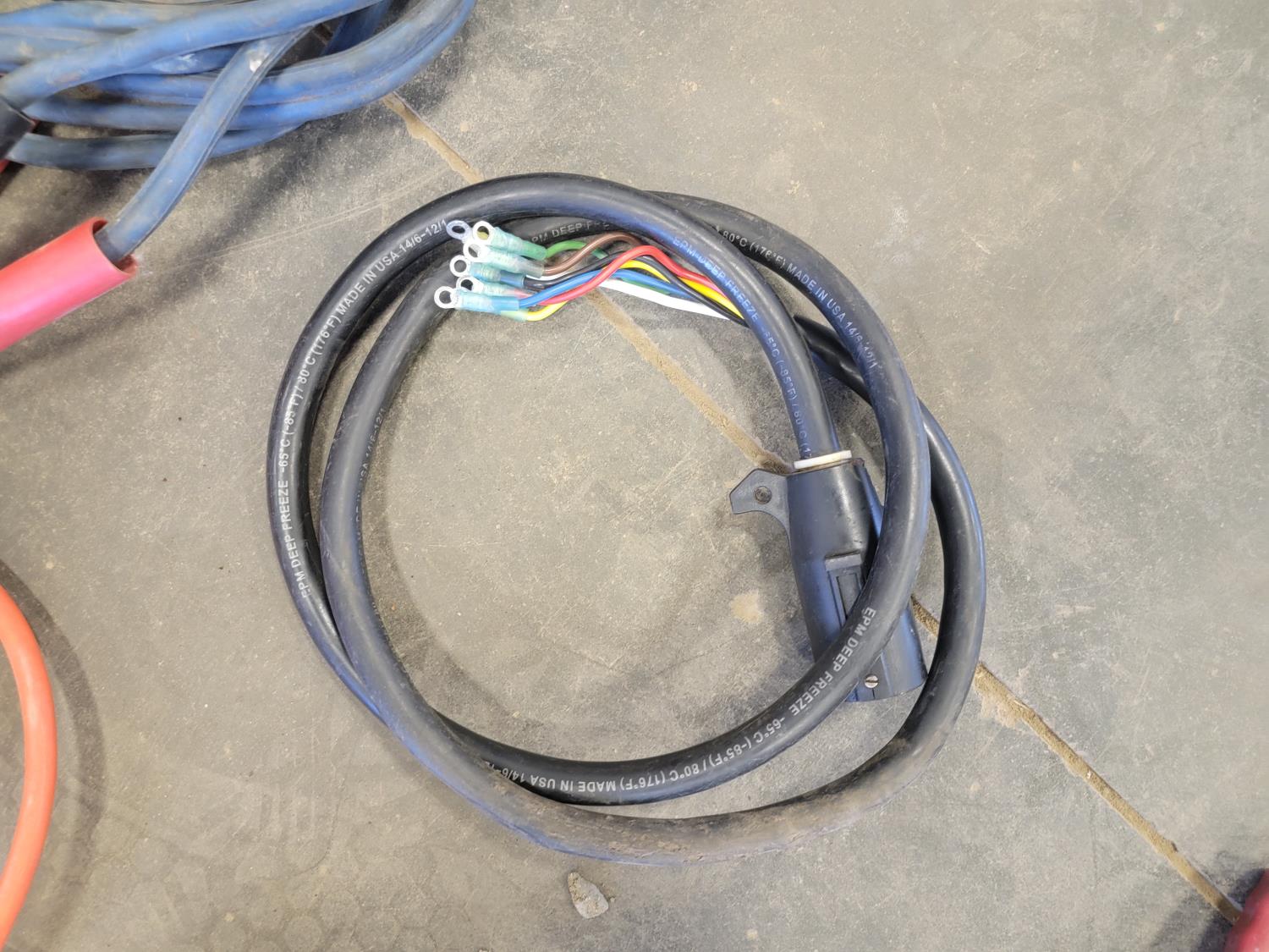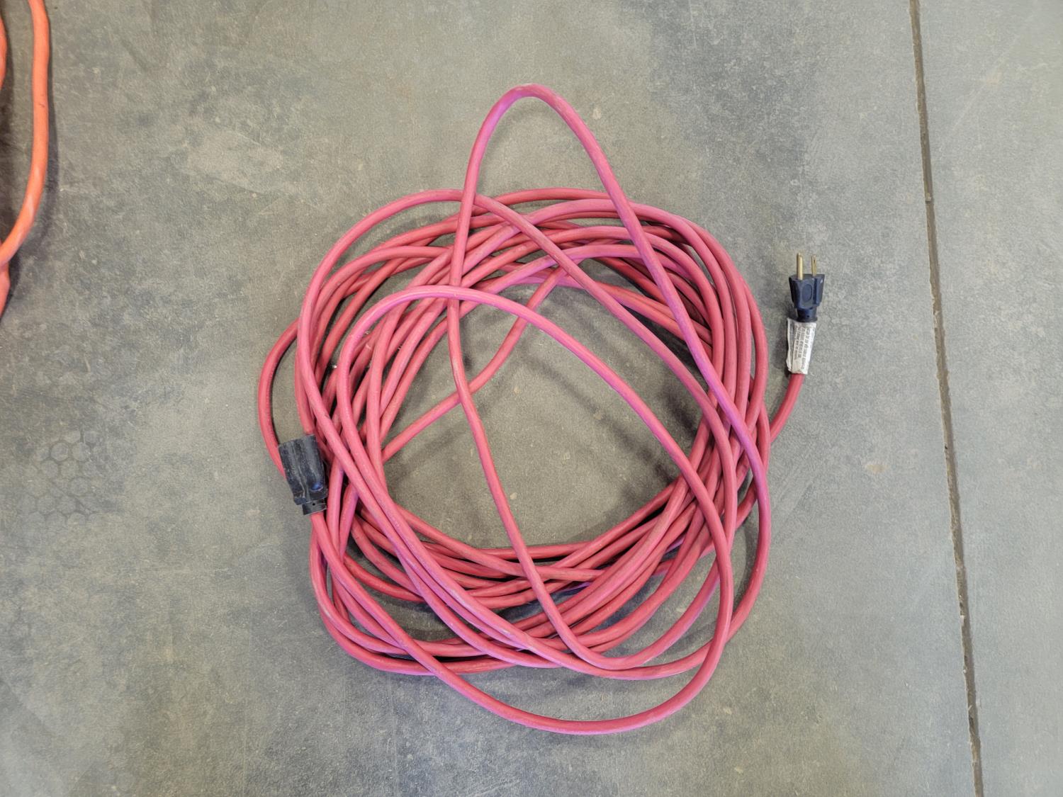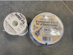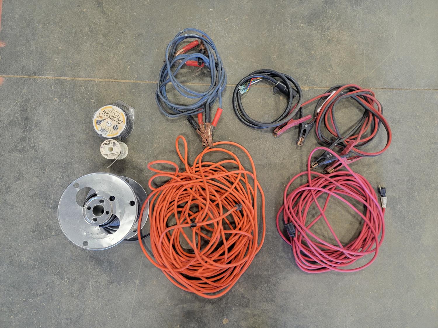 extension cords, booster cables, partial roll of electrical wire
