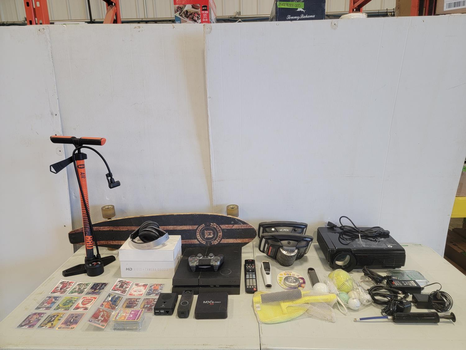 (115±) Pokemon cards, Zeal Optics video camera goggles, LED projector, hovershoes, skateboard, manual air pump