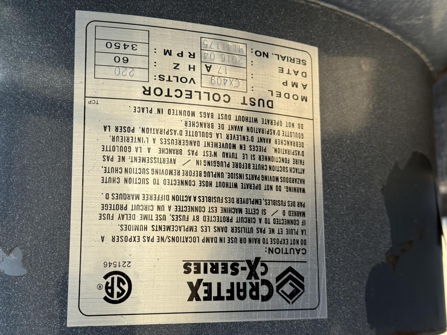 201 2016 Craftex CX409 Industrial Dust Collector