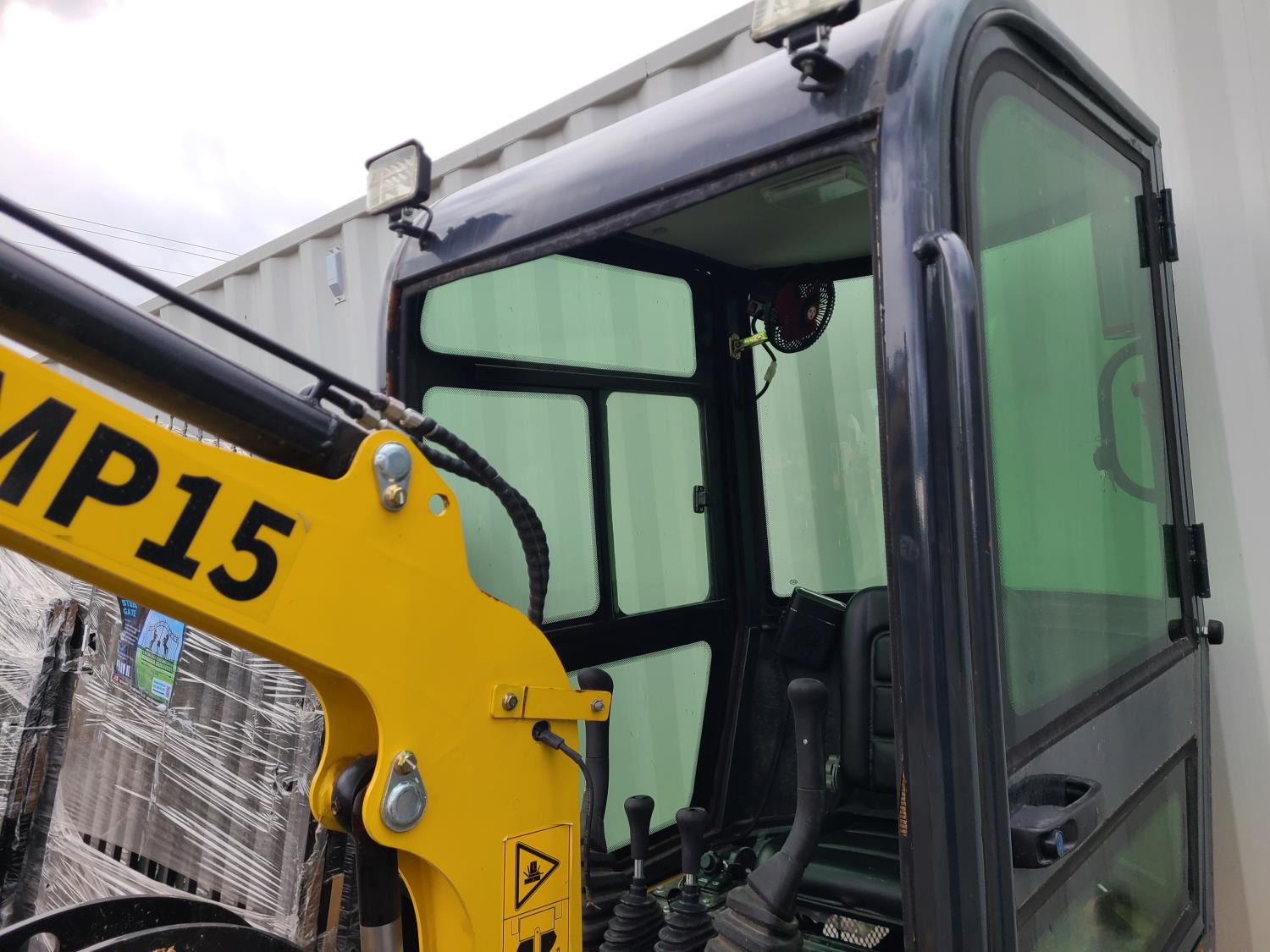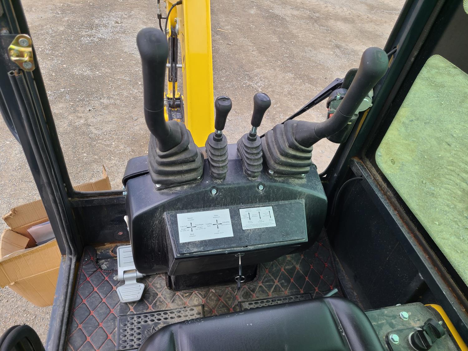 Enclosed cab, gas engine, EPA, Rato engine, 10 inch dig bucket, manual thumb, 1 auxiliary hydraulics, (*DAMAGED, See Images: Missing front window, Lower Cab door damage, boom light missing.*), 7 inch track pads