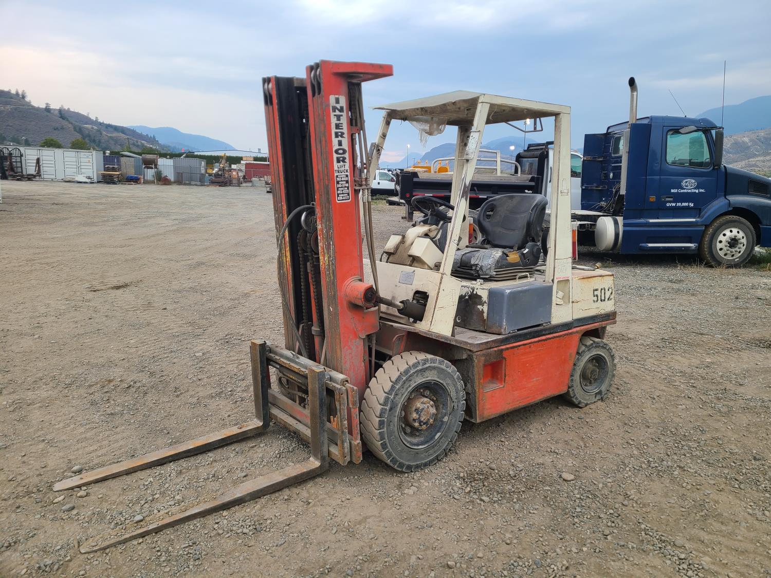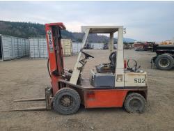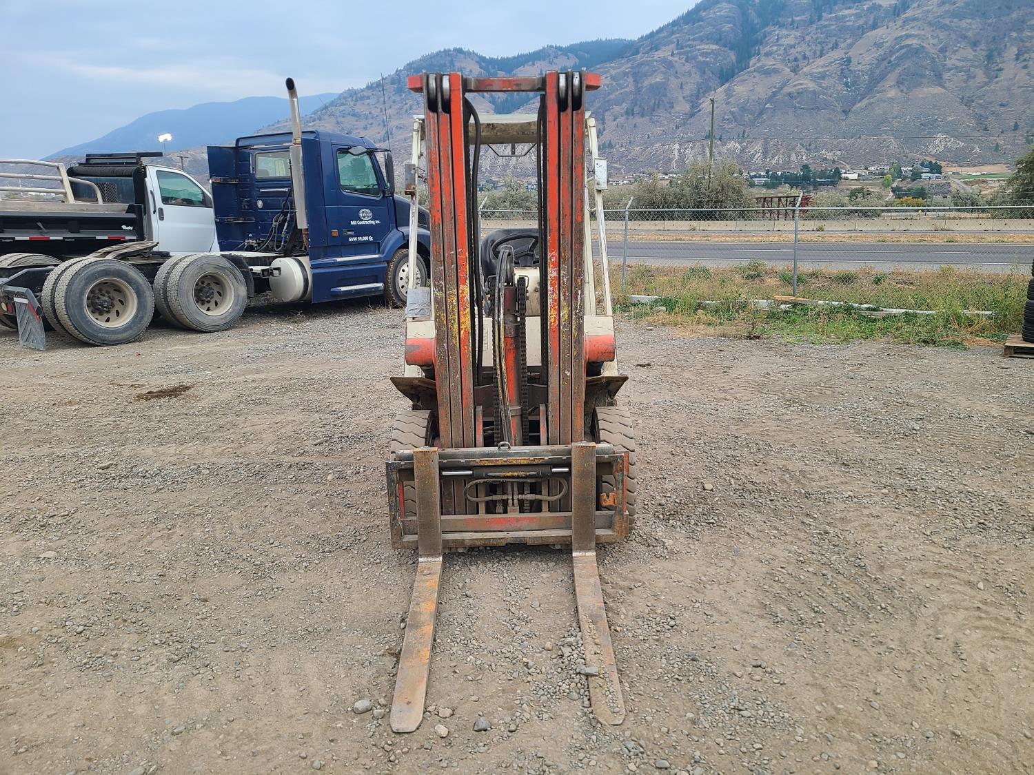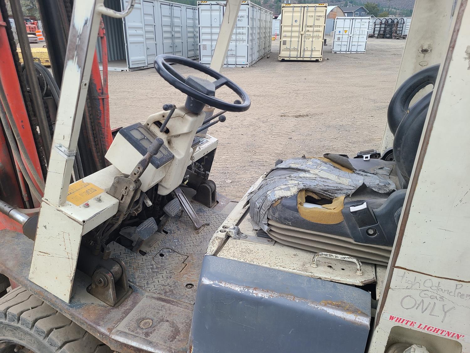 propane, hydro transmission, 80 inch lowered mast height, 187 in max lift height, 2 mast stages, 42 inch pallet forks, side shift, solid rubber 7.00-12 front tires, solid rubber 6.00-9 rear tires
