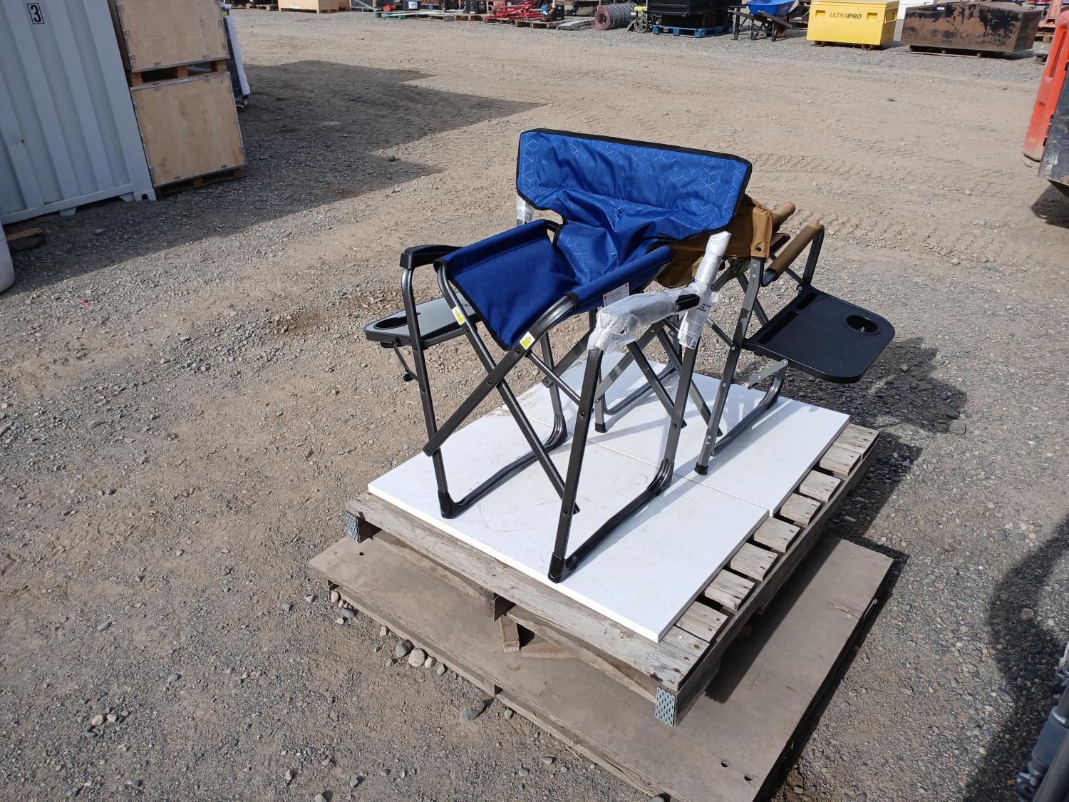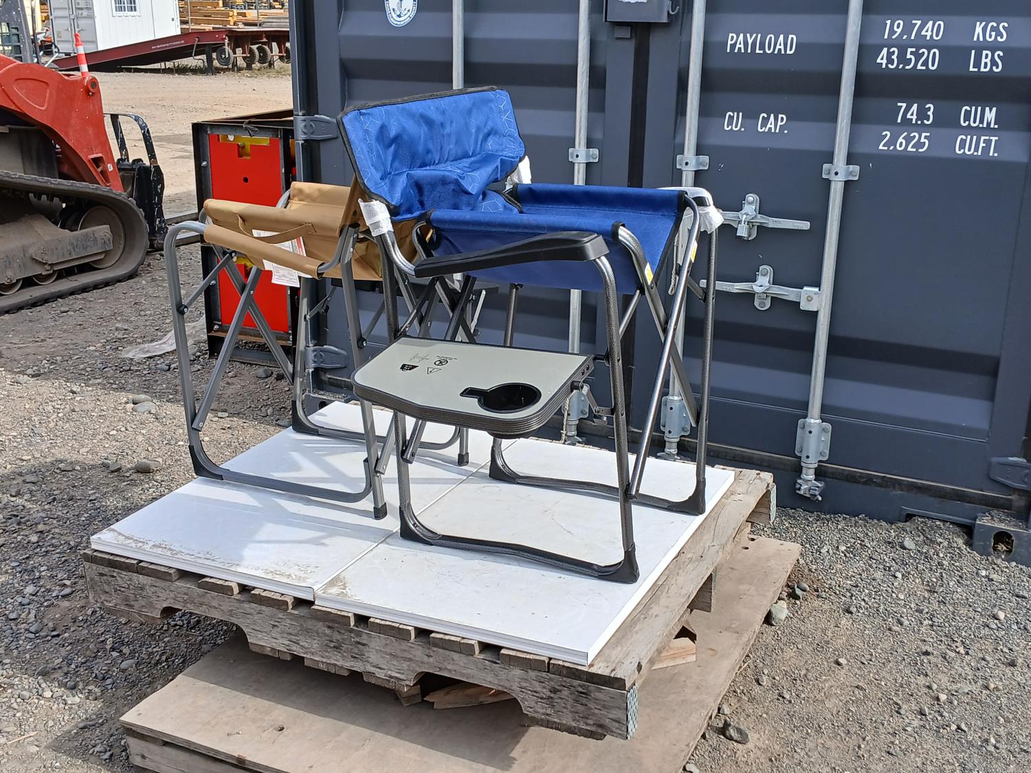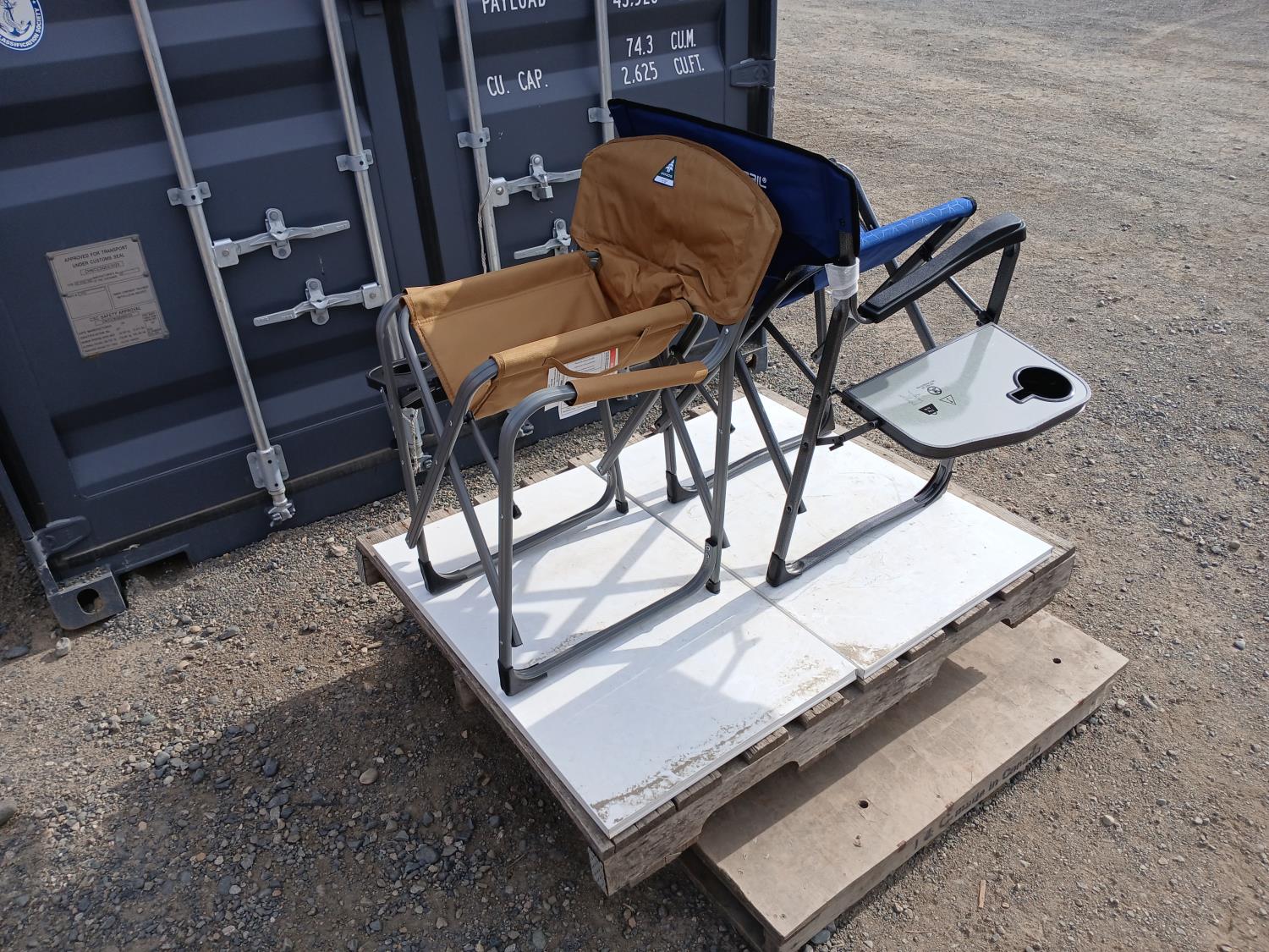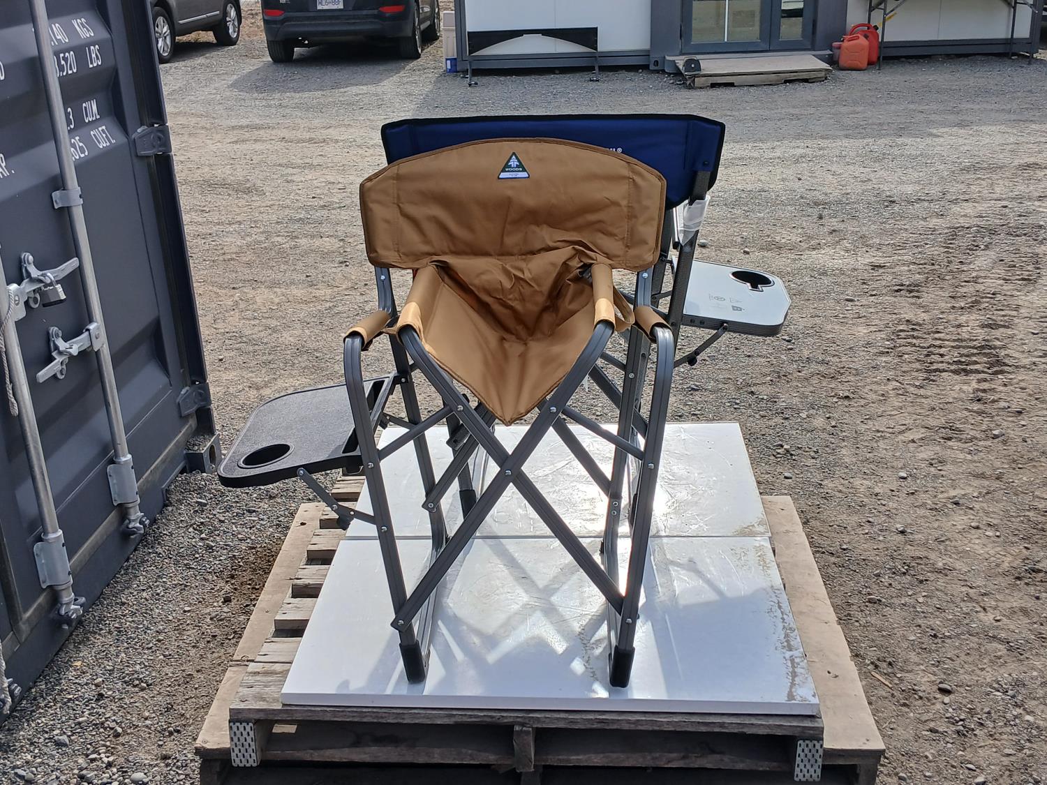 (1) Tan colored Woods camp chai, (1) Blue colored Ozark camp chair. Both have flip up side tables.