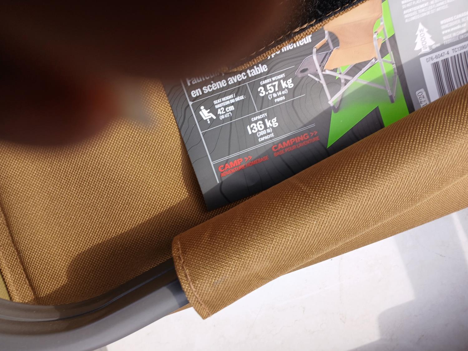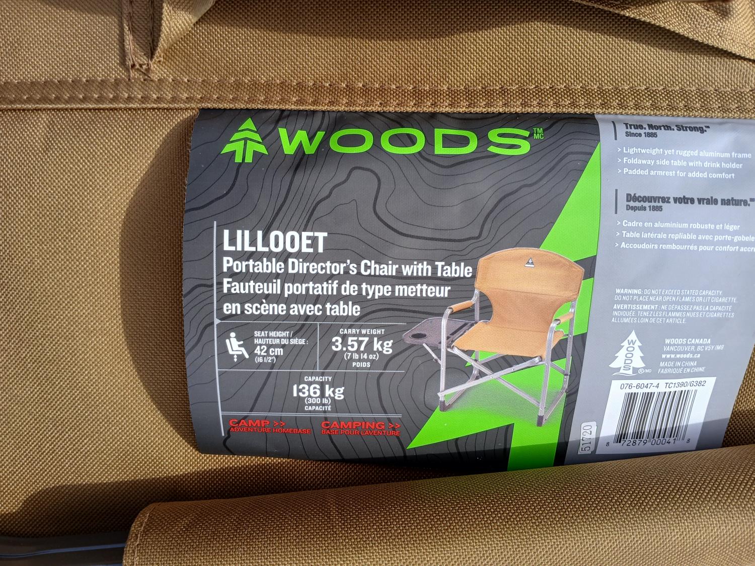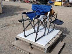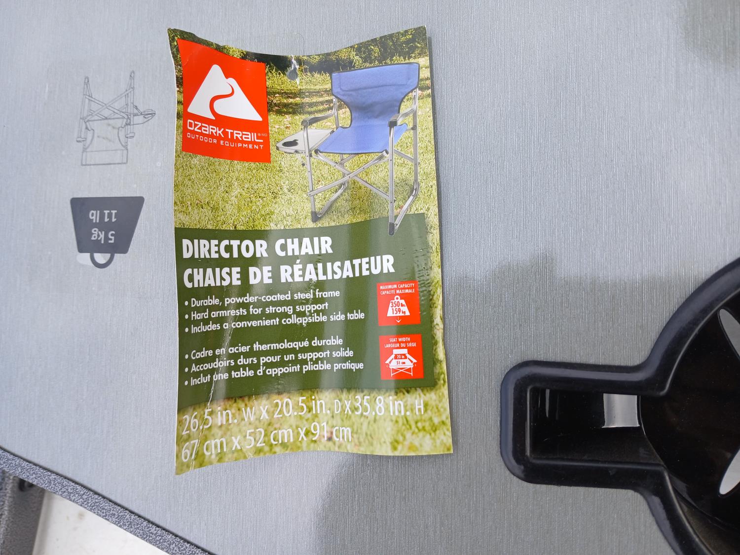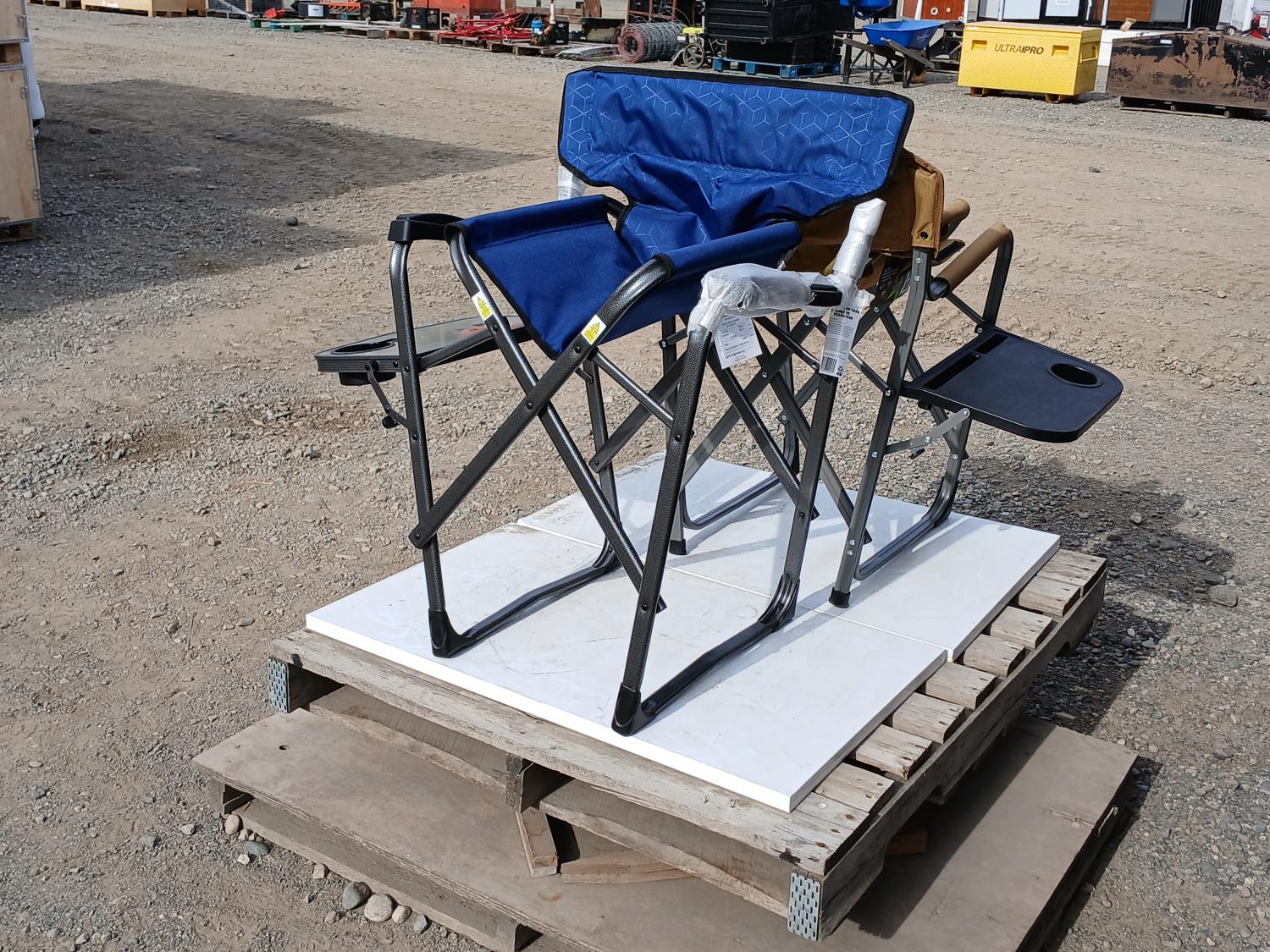 (1) Tan colored Woods camp chai, (1) Blue colored Ozark camp chair. Both have flip up side tables.