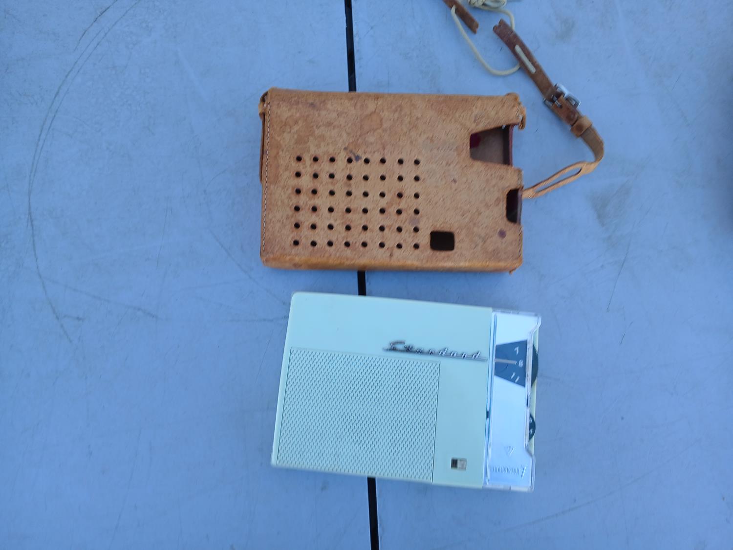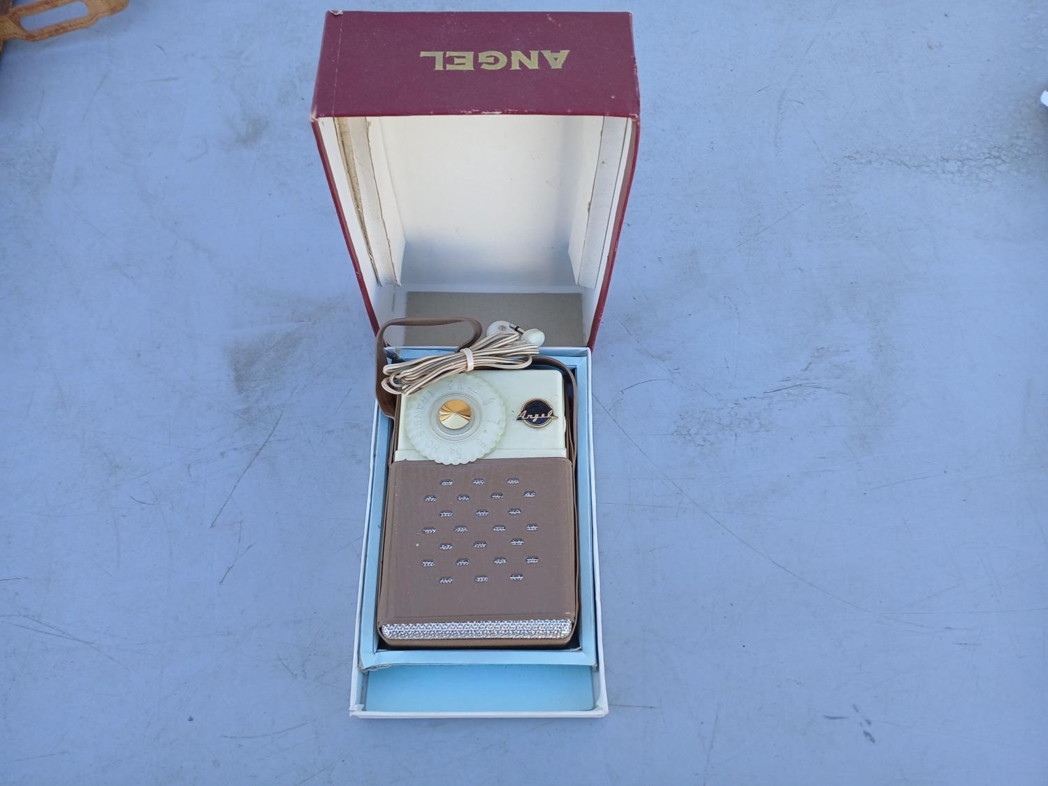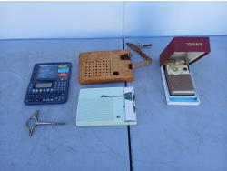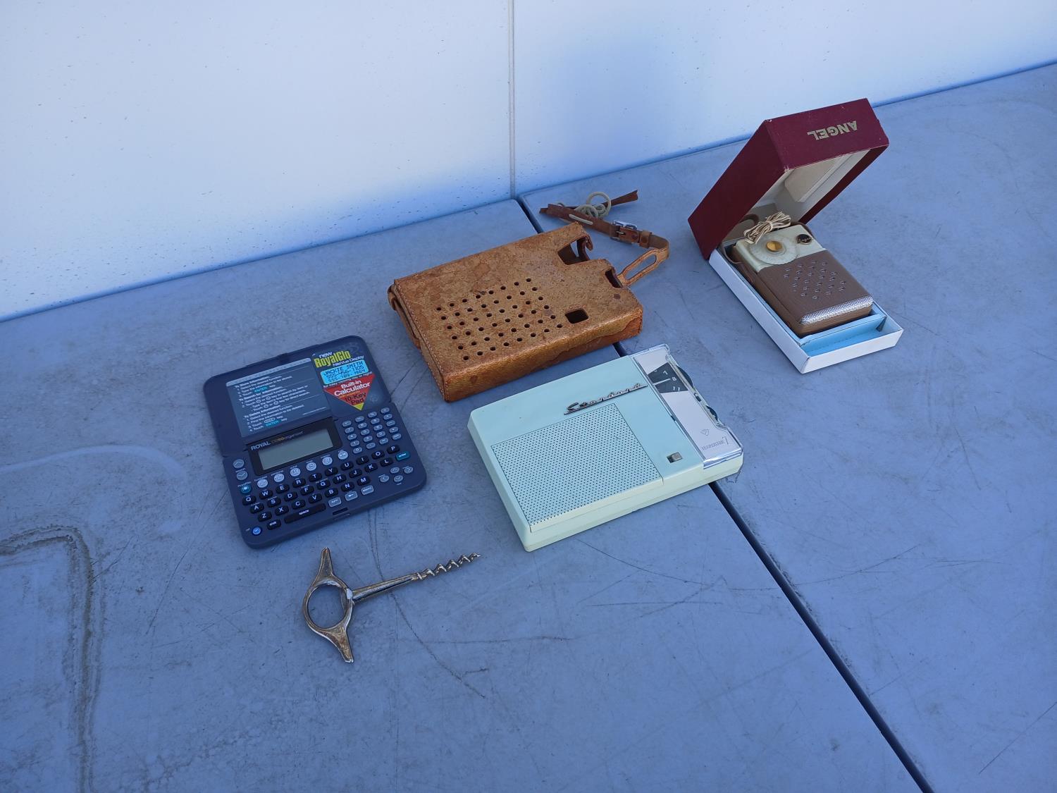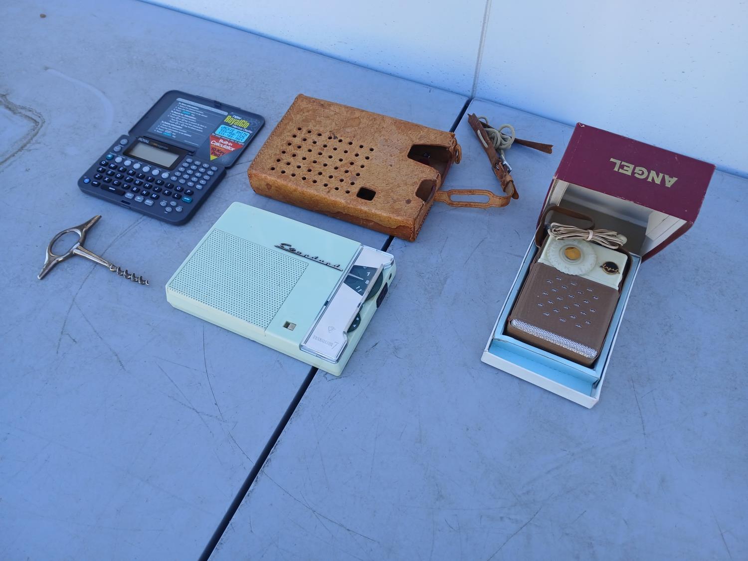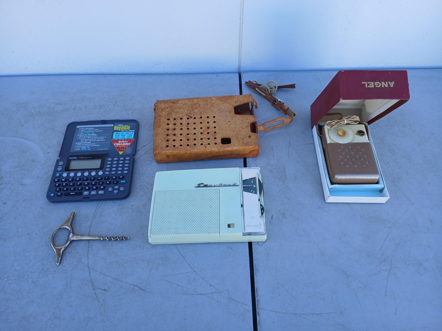 (1) 1950-1960s Angel transistor radio, with original case, and ear piece (9V), (1) 1959-1970 Standard transistor radio, with original leather case, (AA battery compartment shows corrosion) does not have cord. (1) Silver Cork screw. (1) Royal DB90 pocket organizer.