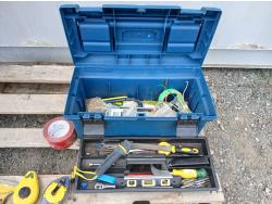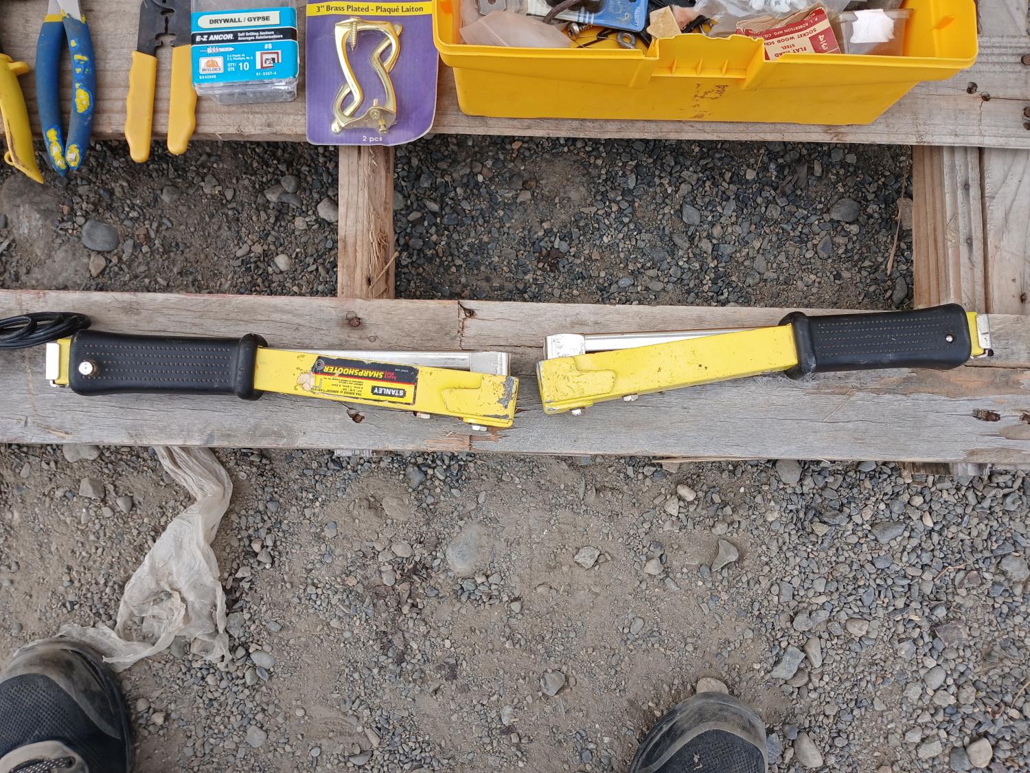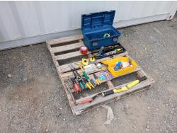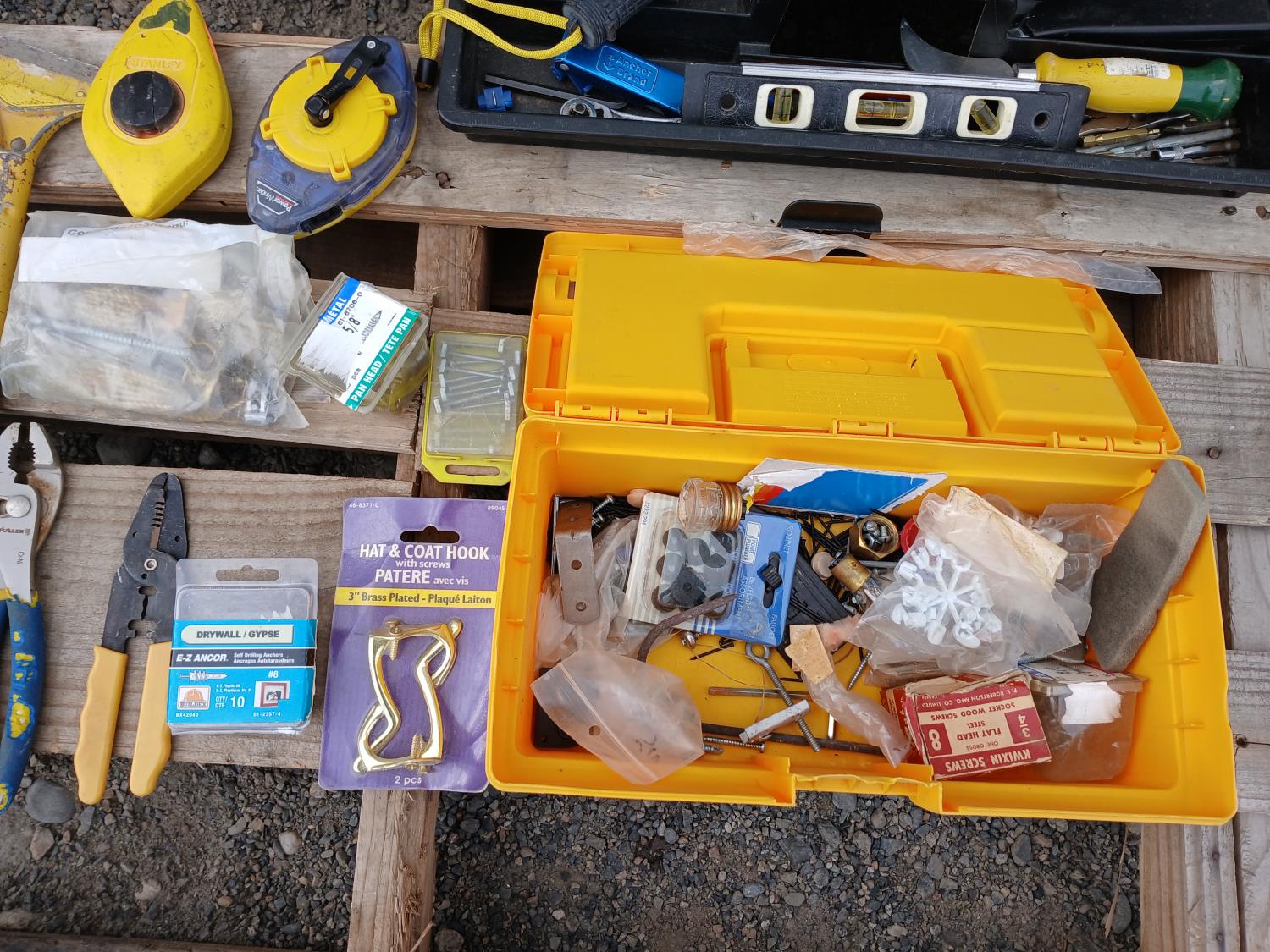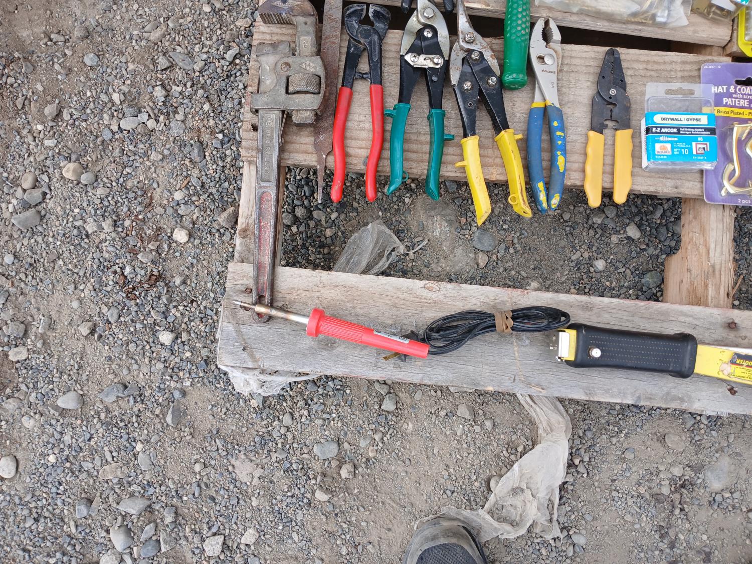 Snips, chalk line, scrappers, level, pliers, flash light, and multiple accessories.