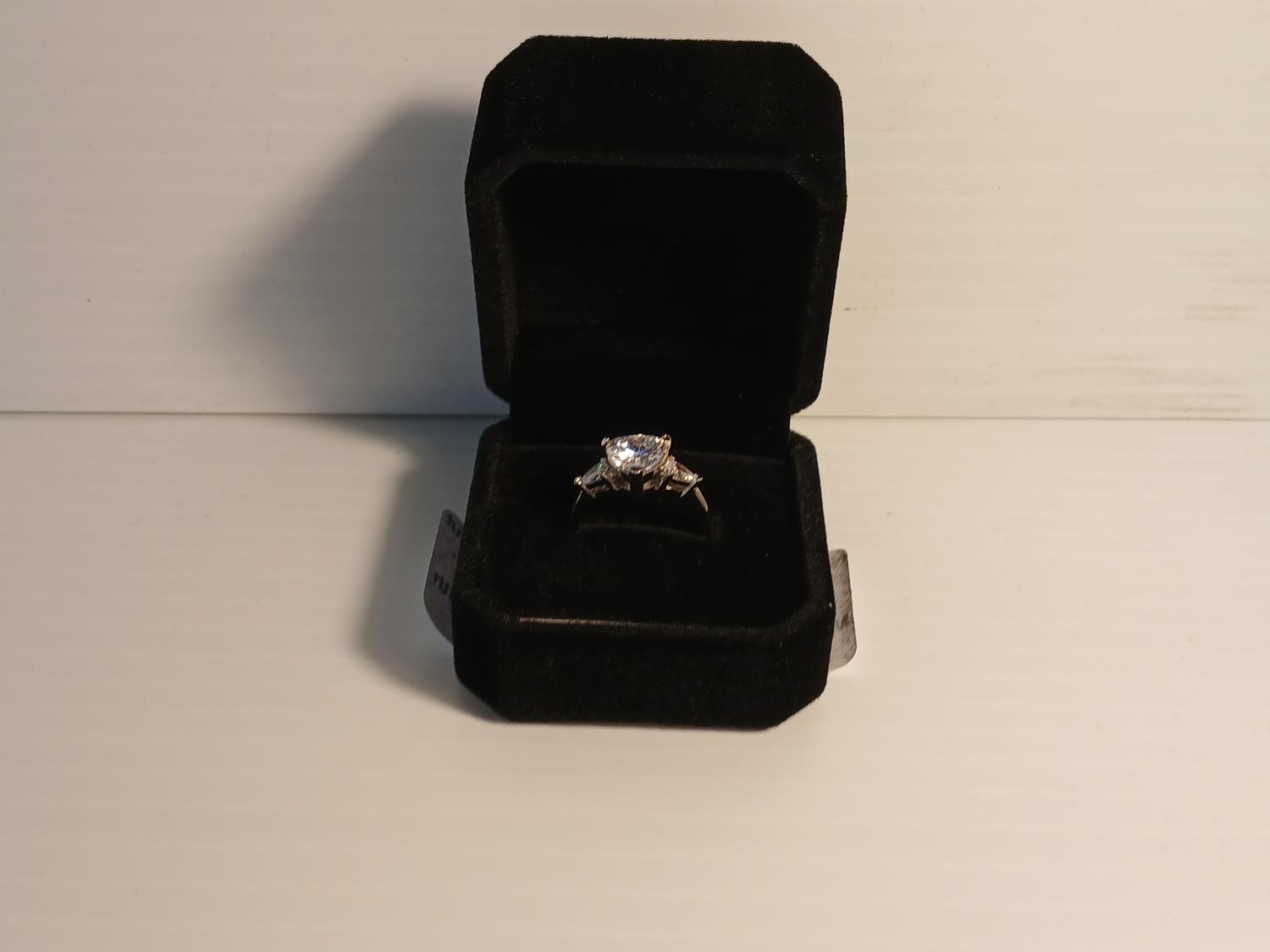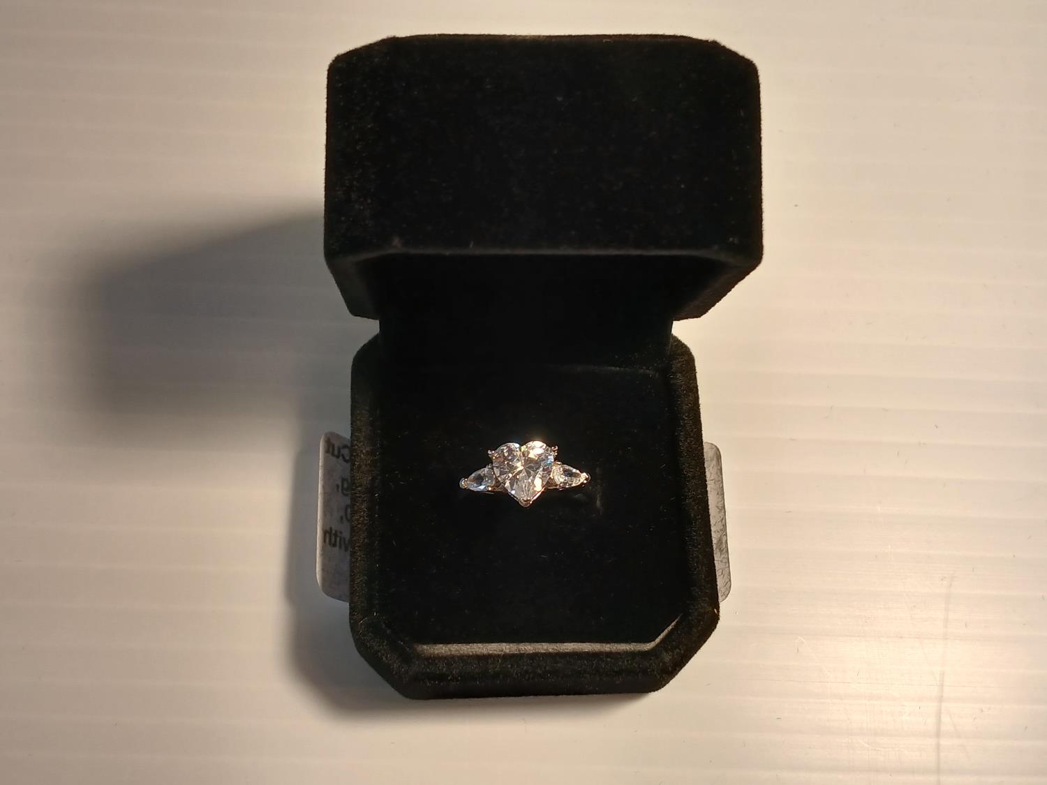 A heart cut simulate diamond, accented with pear cut stones, mounted in 925 sterling silver with white gold gold overlay. Size 7.0