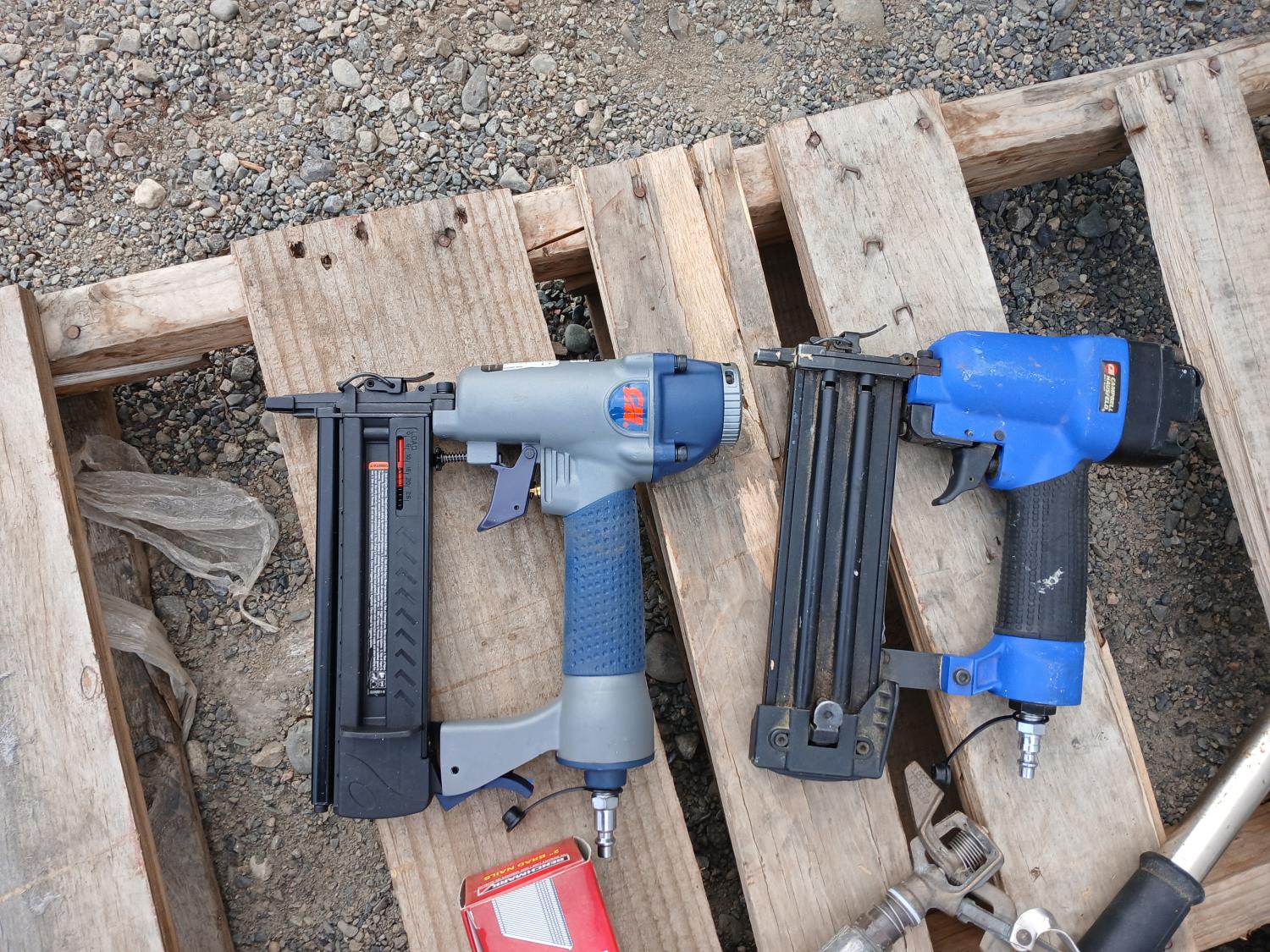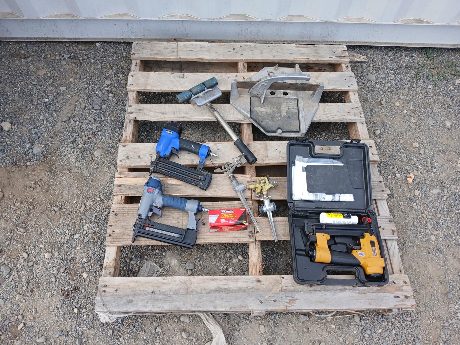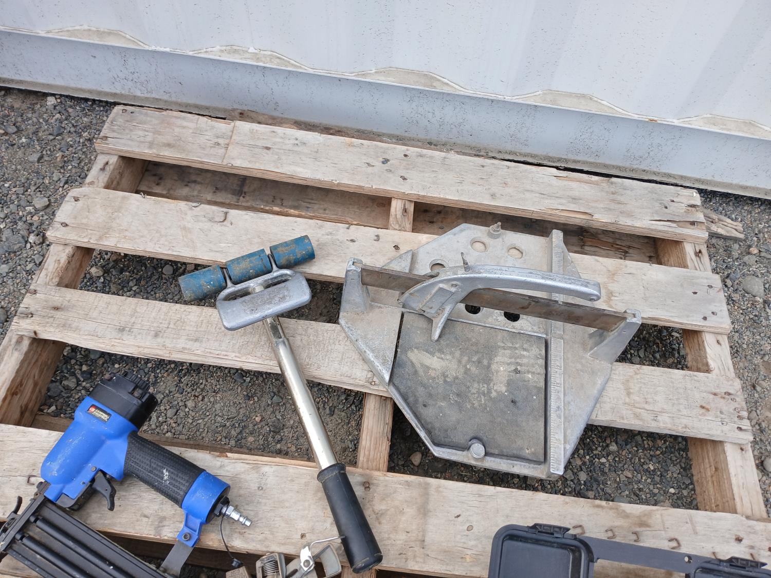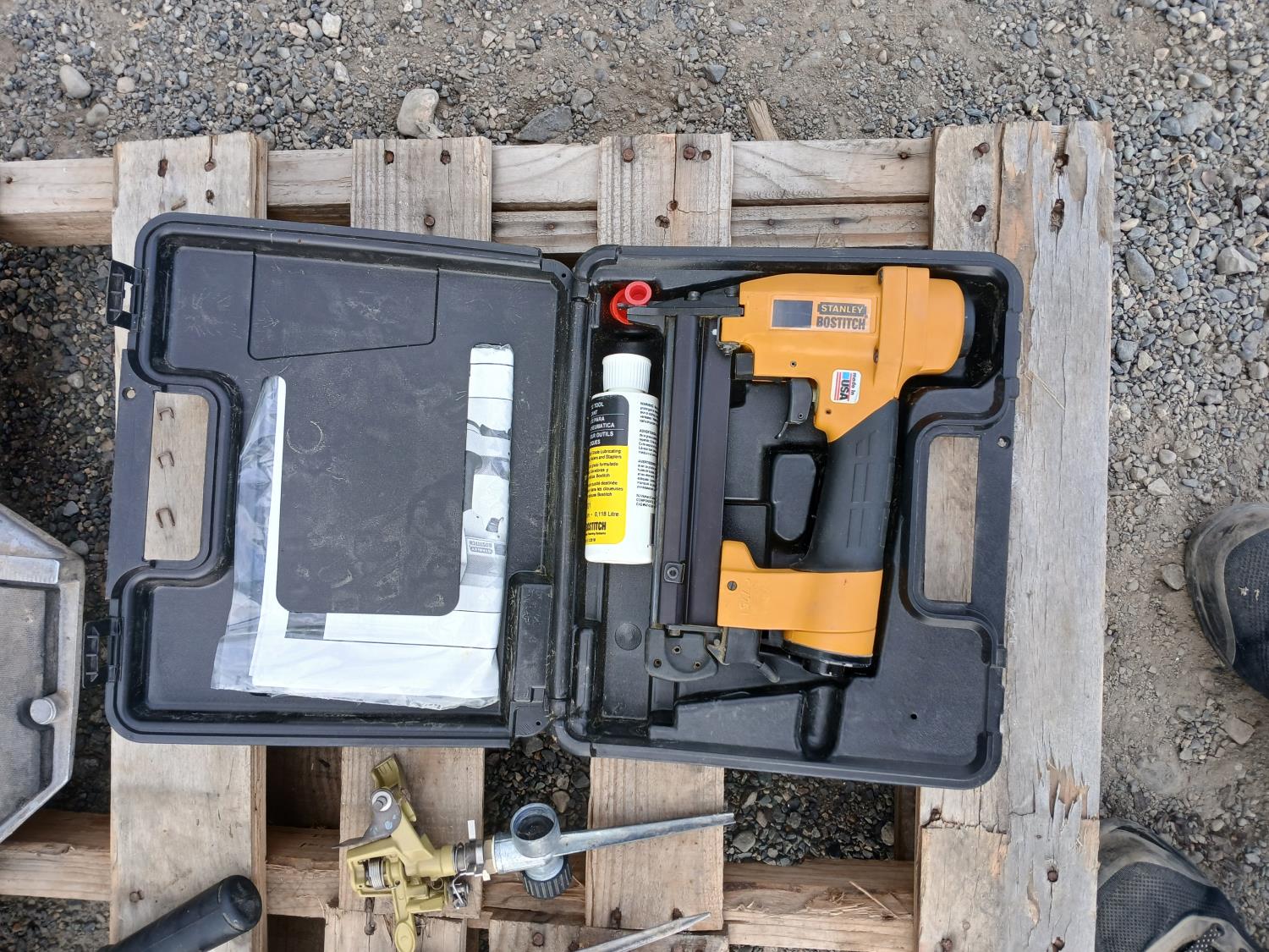 (1) Stanley Bostitch brad nailer, (2) Campbell Hausfeld Brad nailers, (1) carpet stretcher, (1) tile cutter, (2) Oscillating sprinkler heads.