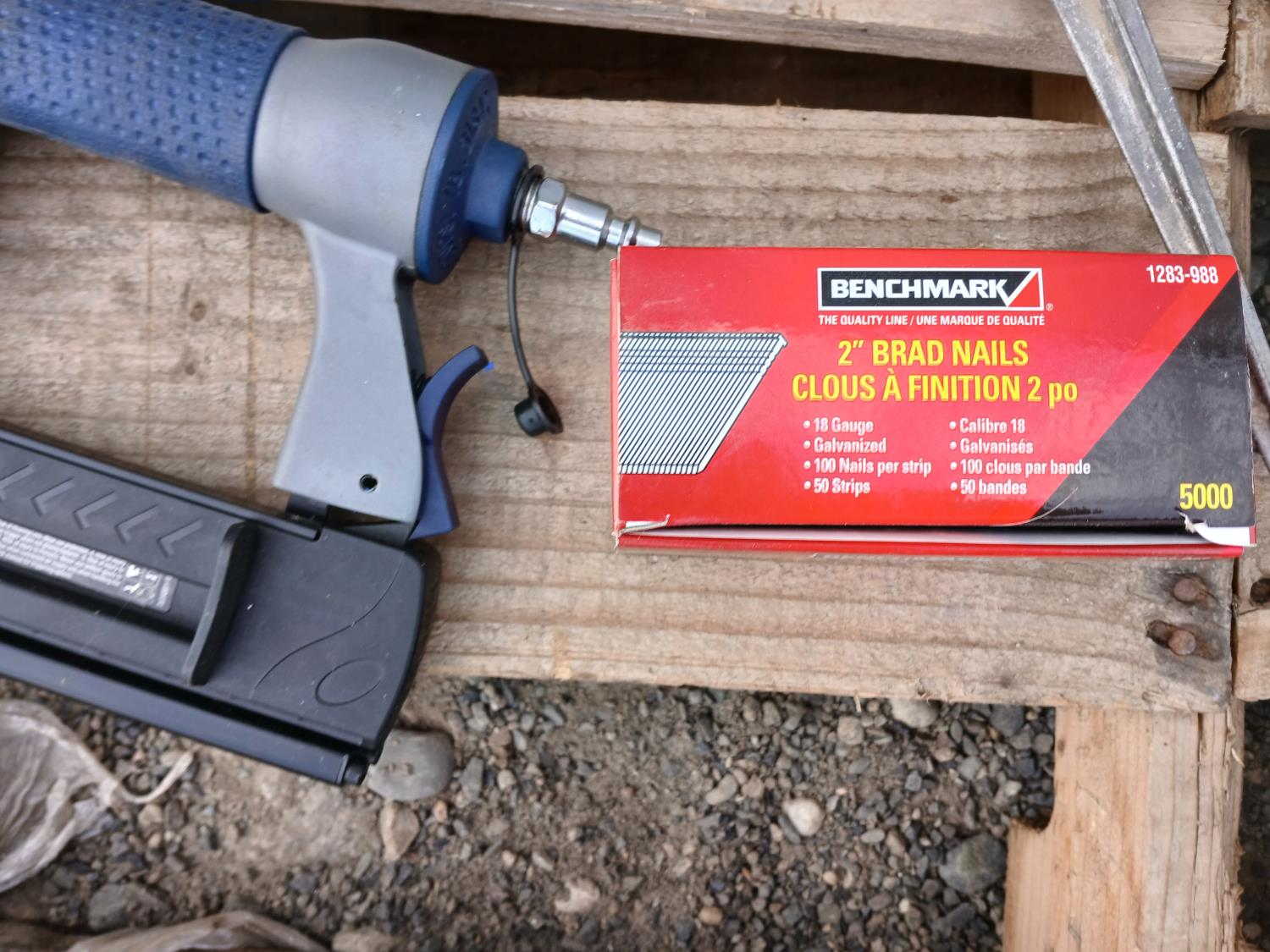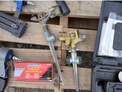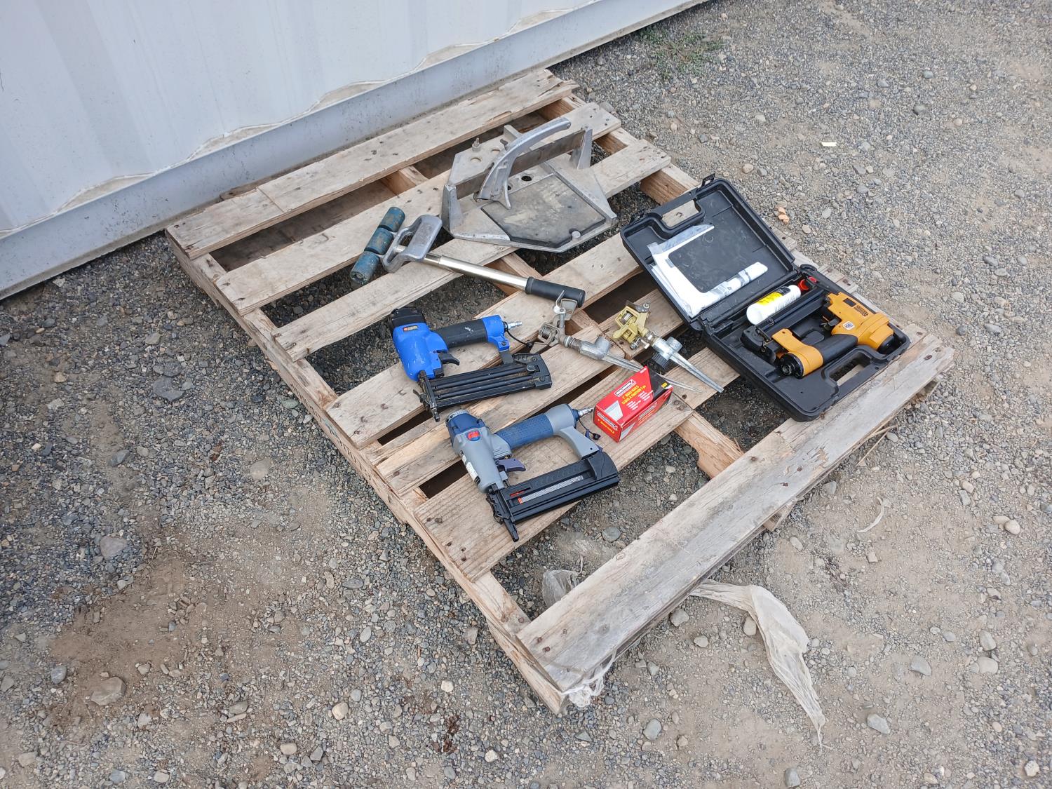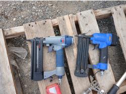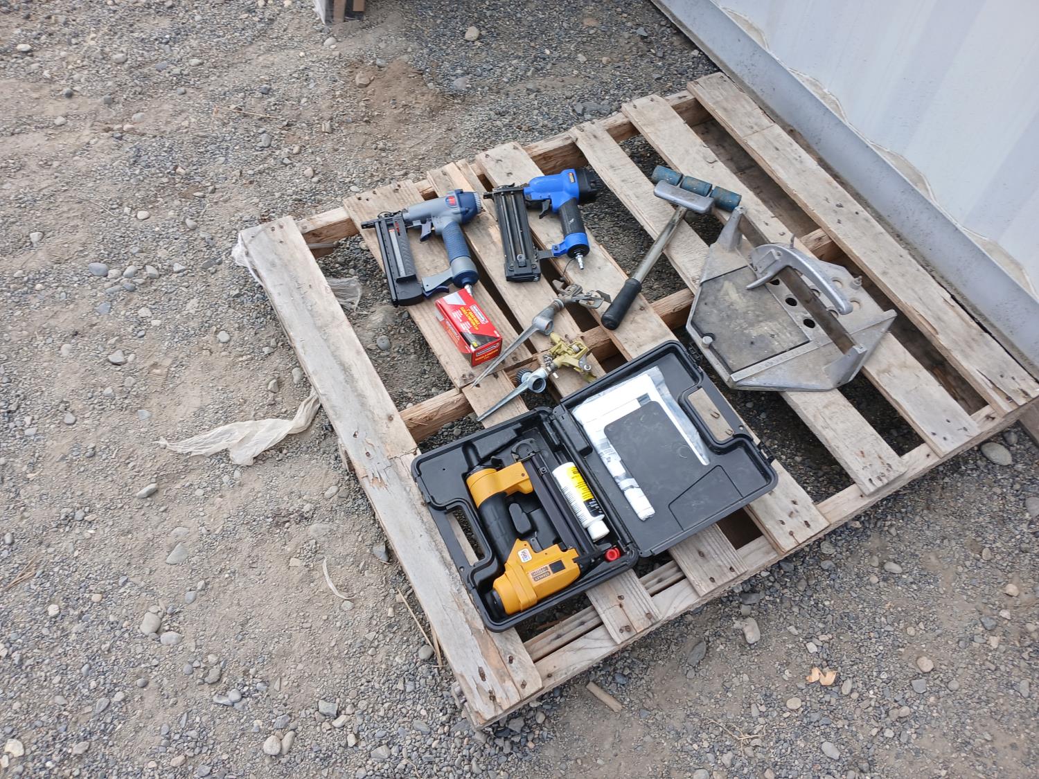 (1) Stanley Bostitch brad nailer, (2) Campbell Hausfeld Brad nailers, (1) carpet stretcher, (1) tile cutter, (2) Oscillating sprinkler heads.