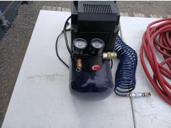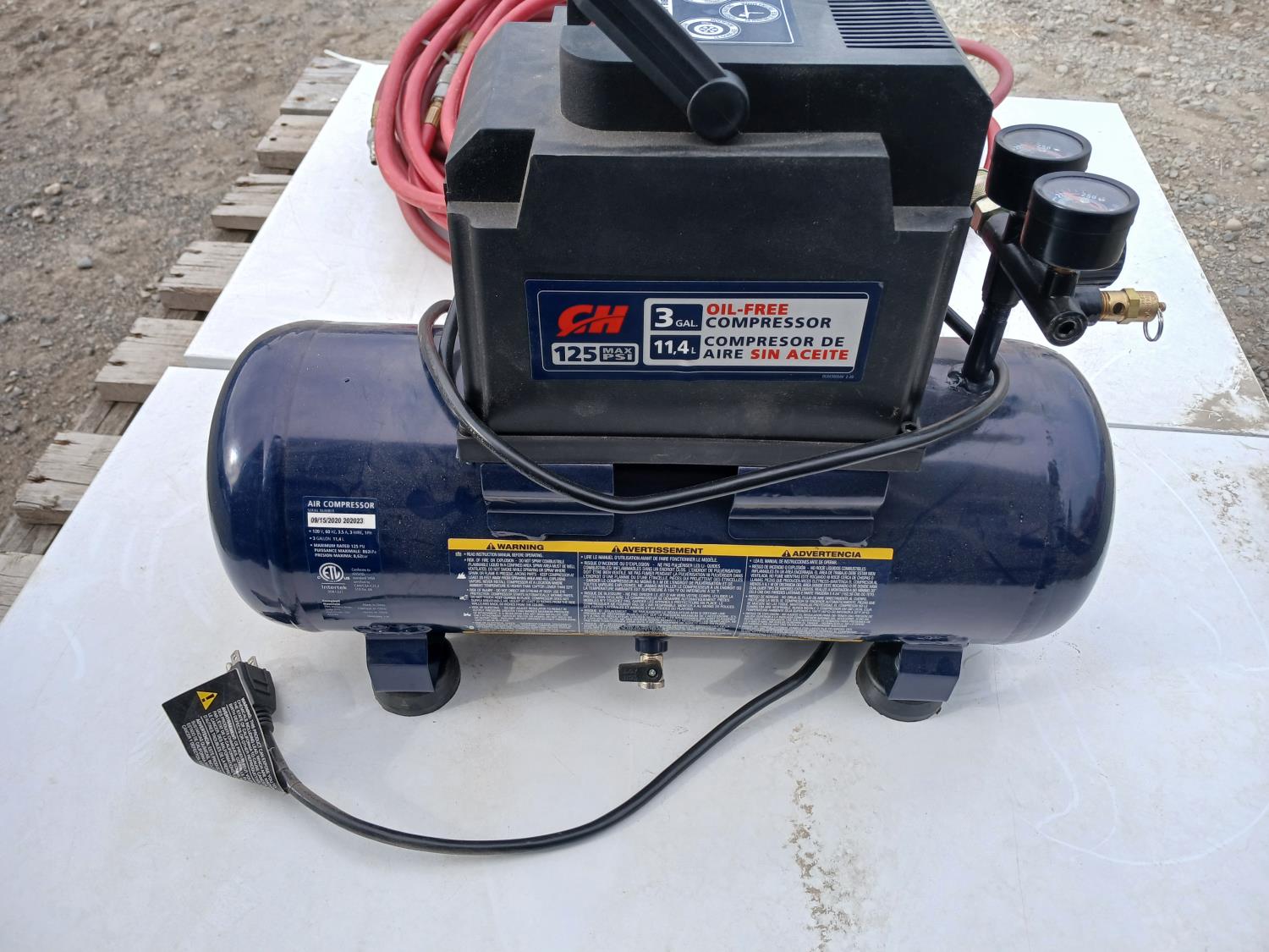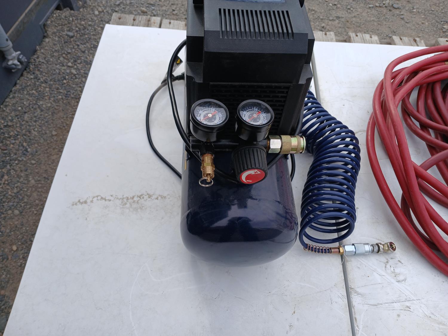3 Gallon (11.4Lt) compressor, 120V, 60 Hz, 3.5A, 125psi. Serial number: 202023 (1) small air hose, (2) 10 ft air hoses.