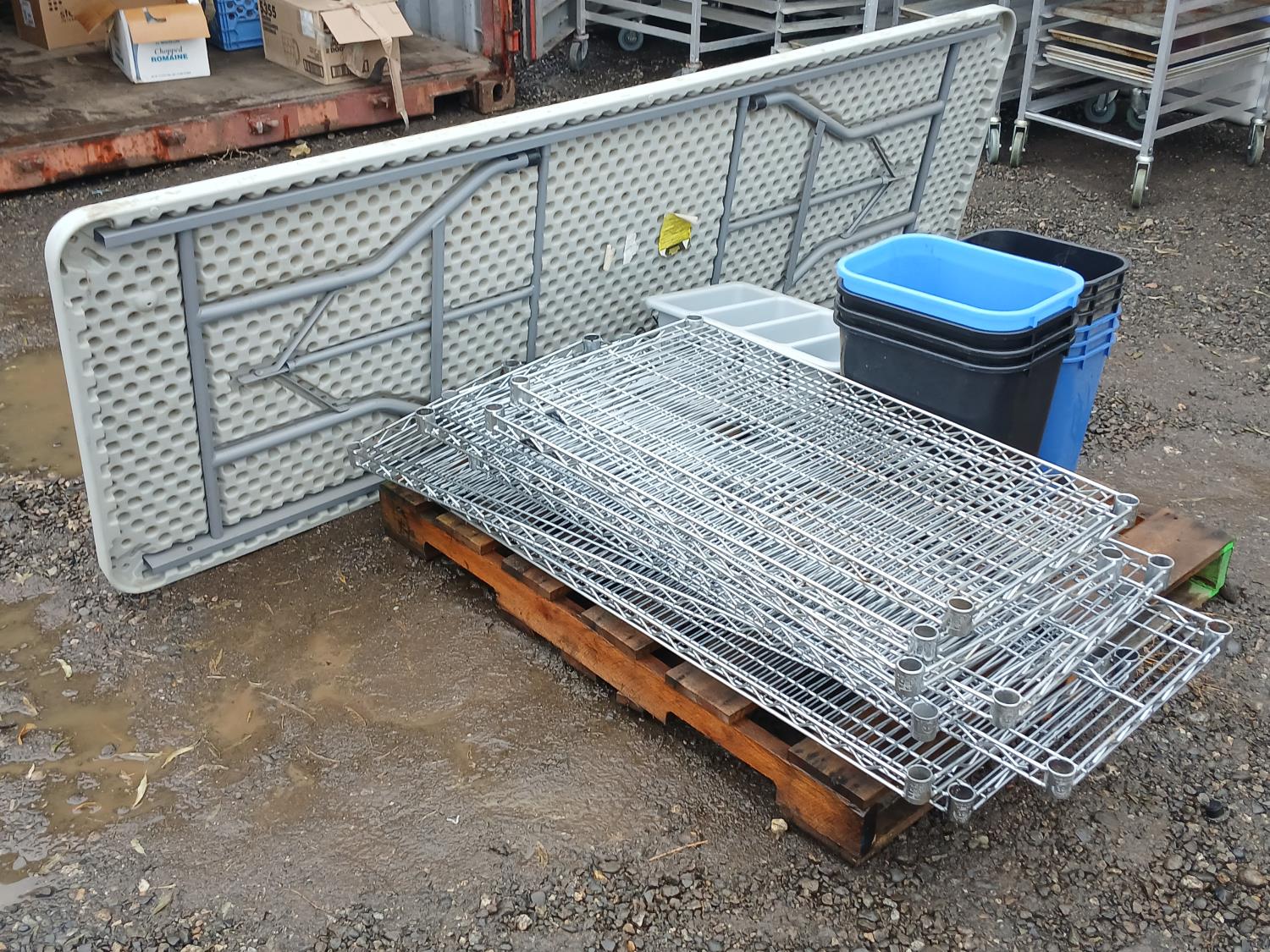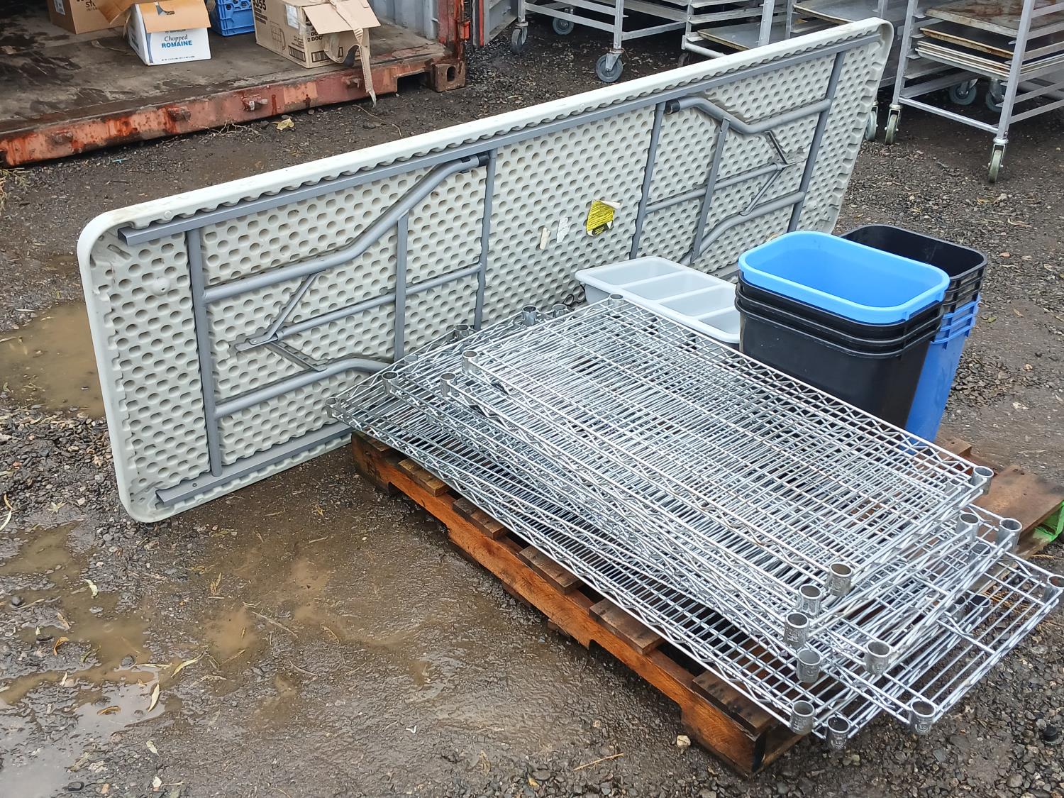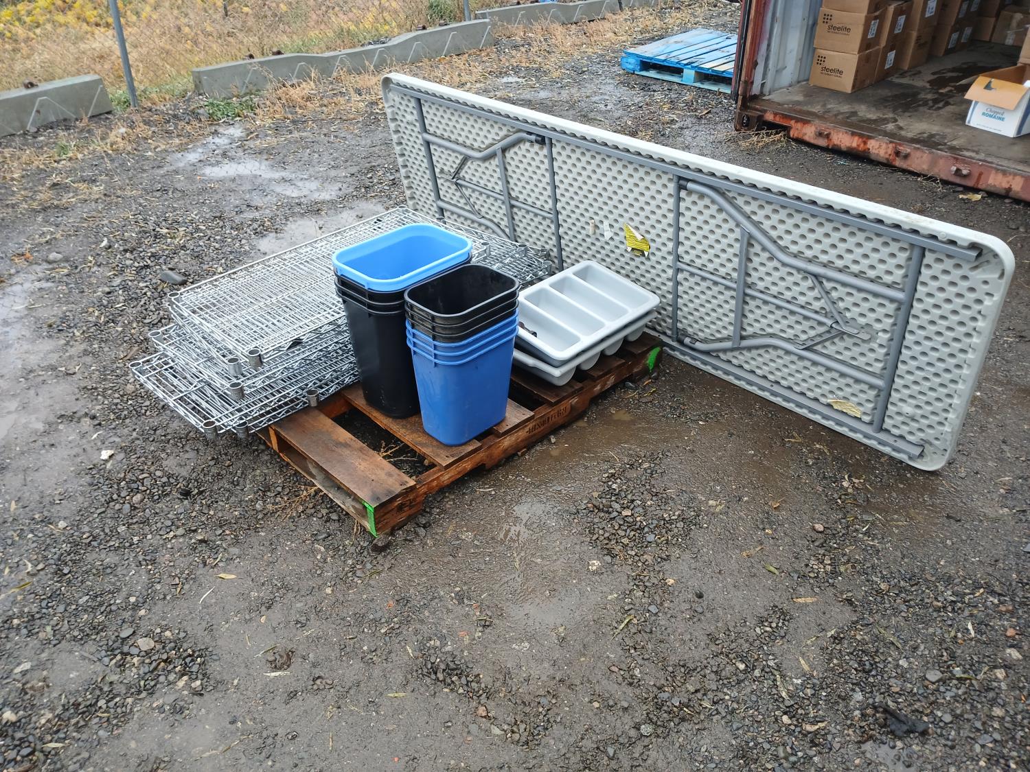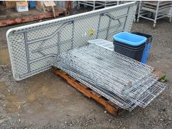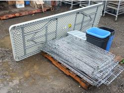 (9) stainless steel shelves, (3 41L Garbage bin, (1) 24L garbage bin, (3) 41L recycle bins, (3) 24L recycle bins, (2) Flatware bins, (1) Collapsible 12 ft table.