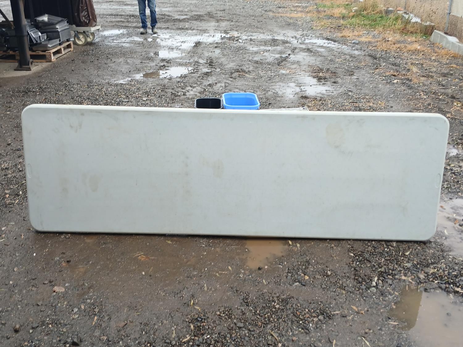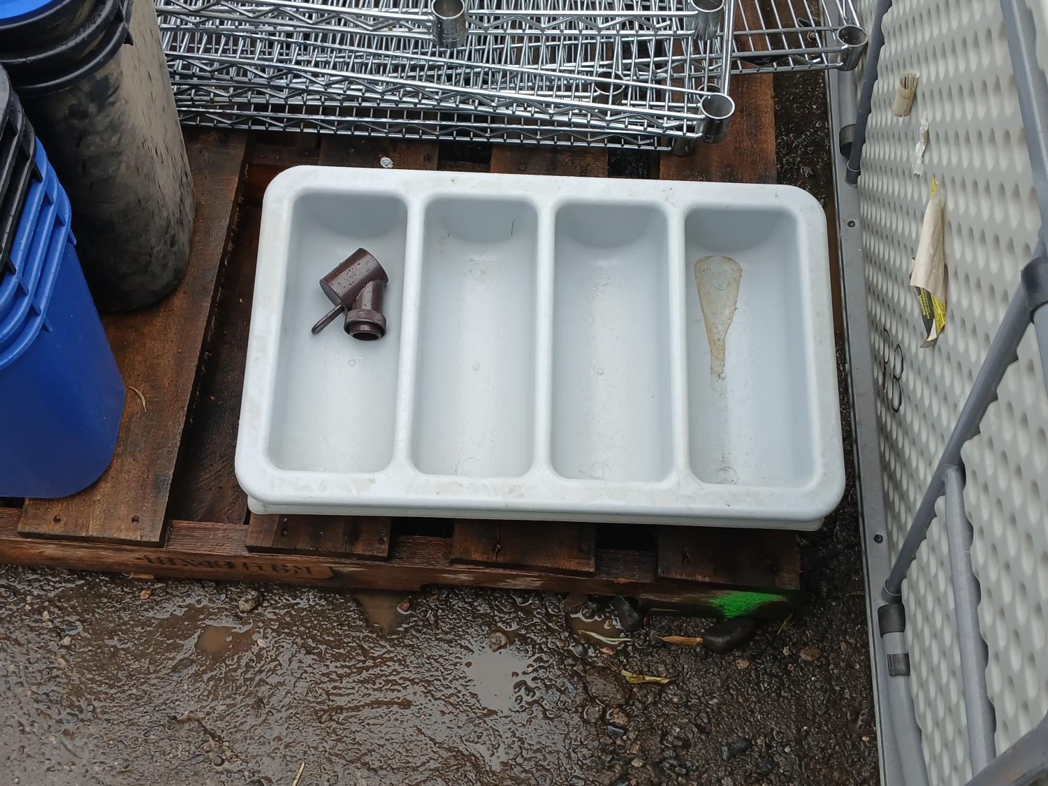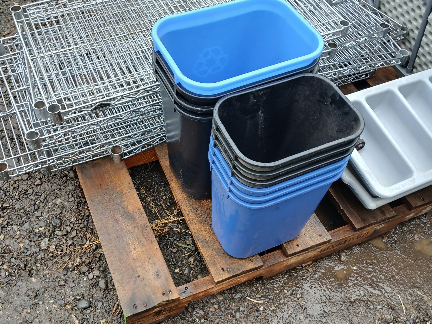 (9) stainless steel shelves, (3 41L Garbage bin, (1) 24L garbage bin, (3) 41L recycle bins, (3) 24L recycle bins, (2) Flatware bins, (1) Collapsible 12 ft table.