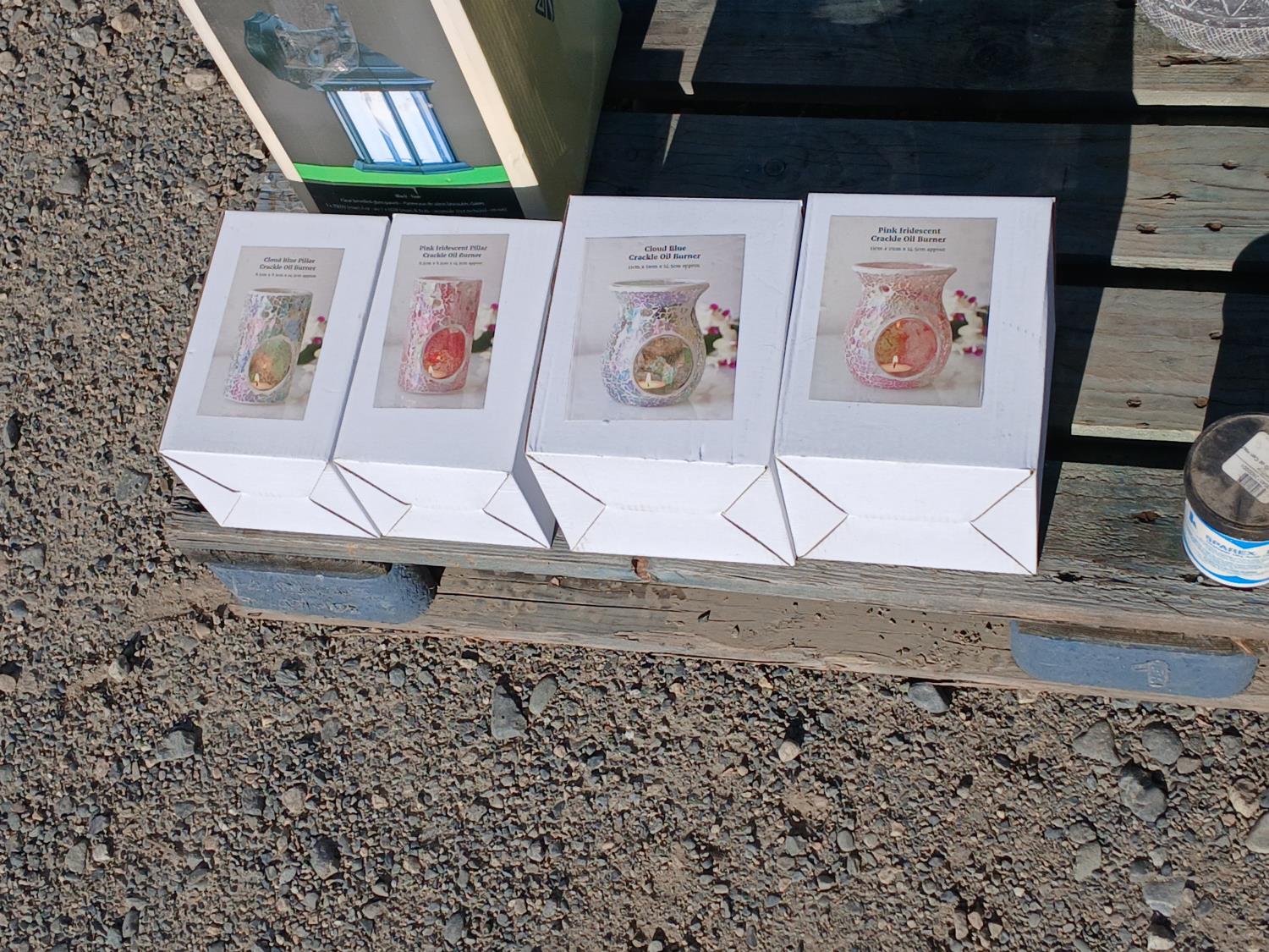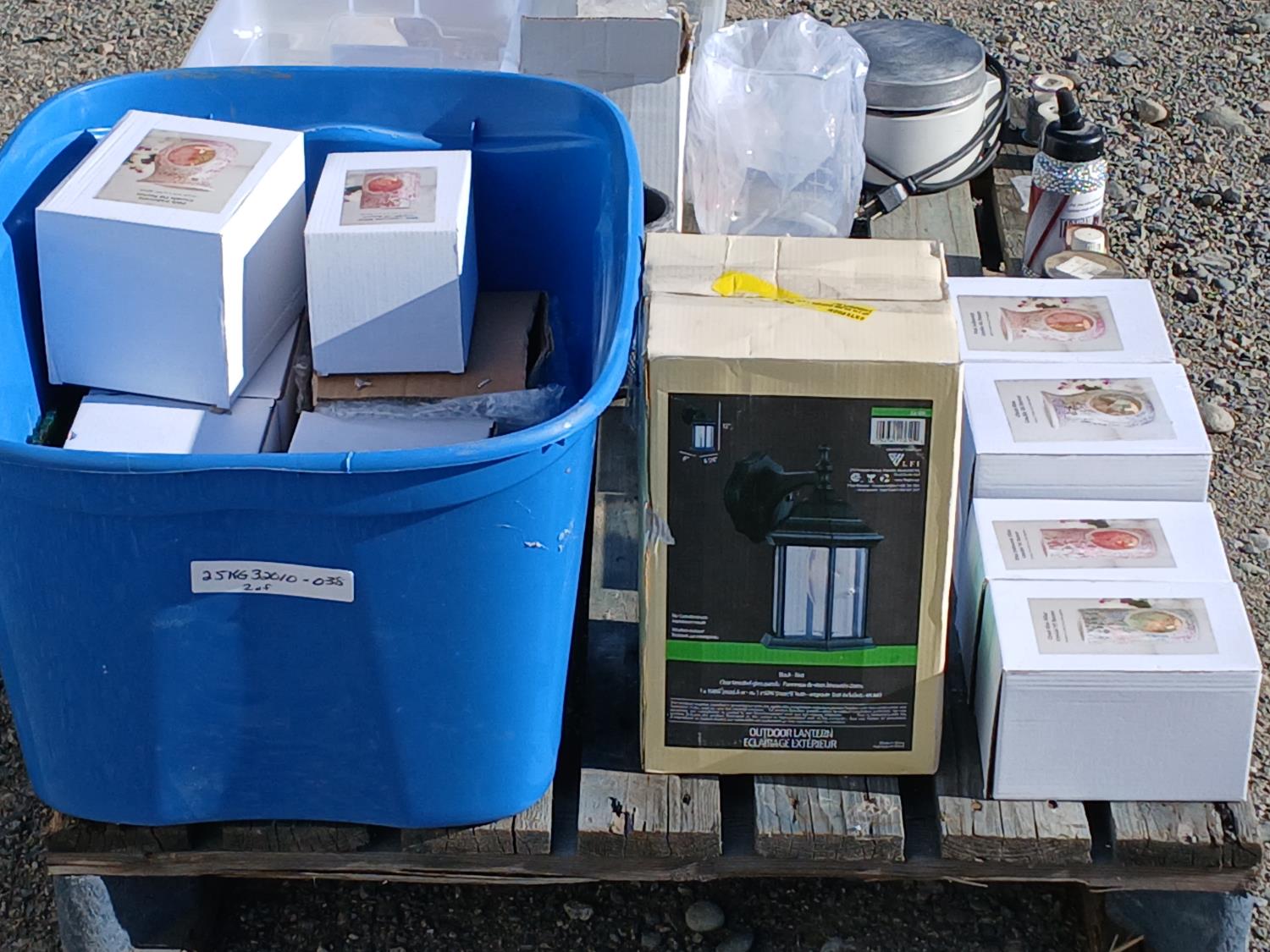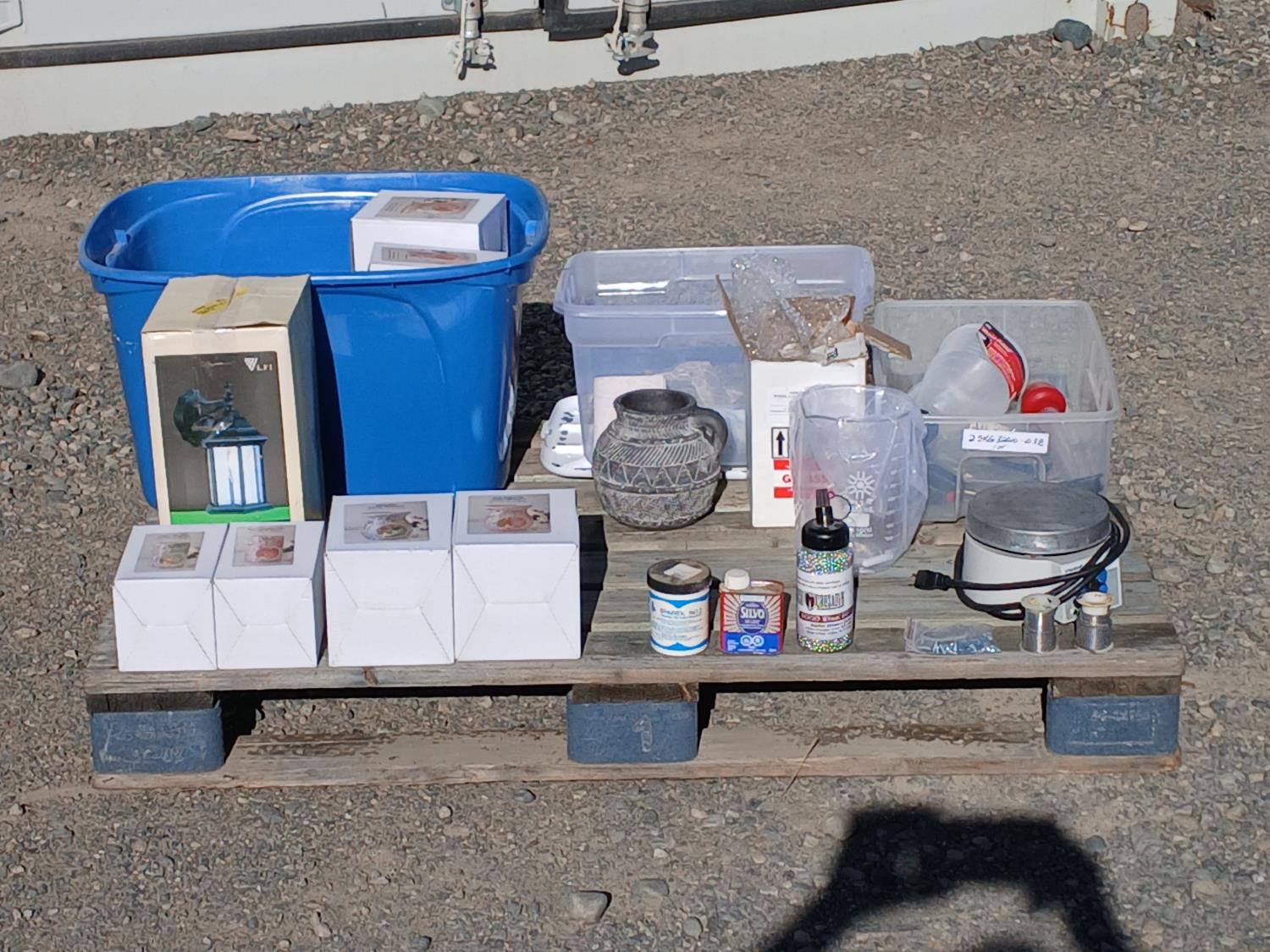 (6) pieces soap stone, (1) 2000ml glass beaker, (2) rolls pewter wire, (i) bottle stainless BBs, (11) ornamental scented oil burners, (1) exterior sconce light, (1) pottery vase, (1) electric burner, other small miscellaneous items.