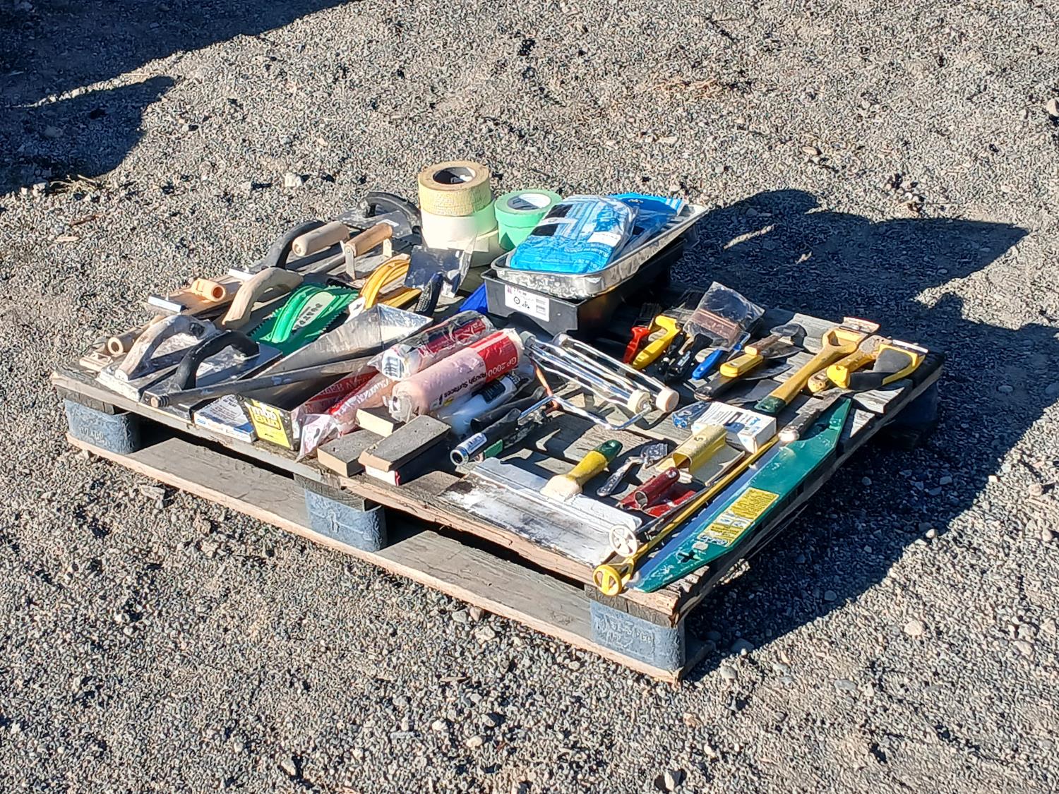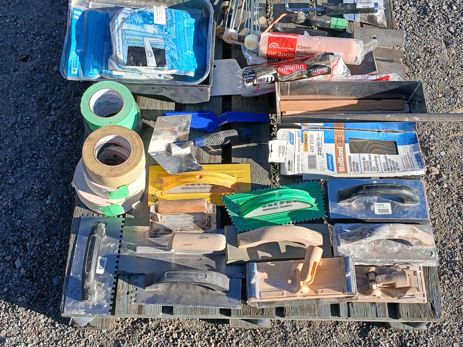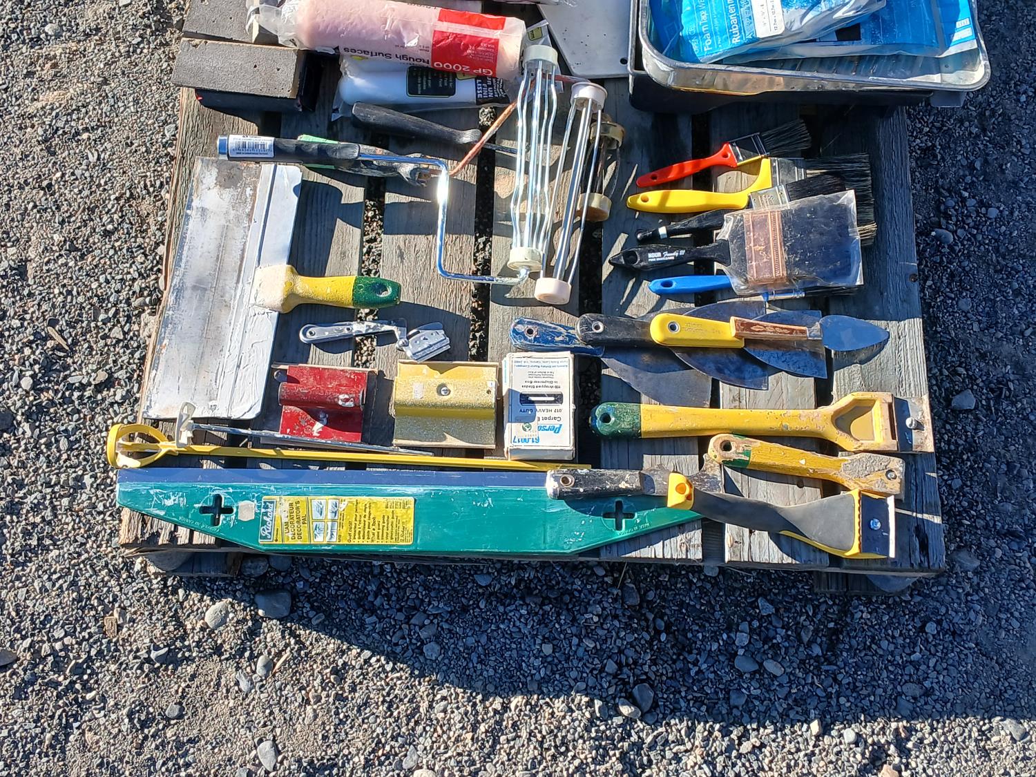 Rollers, roller brushes, paint brushes, mudding trulls, grout trulls, sanding heads, mud tape, paint tape, and multiple other finishing and painting tools.