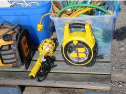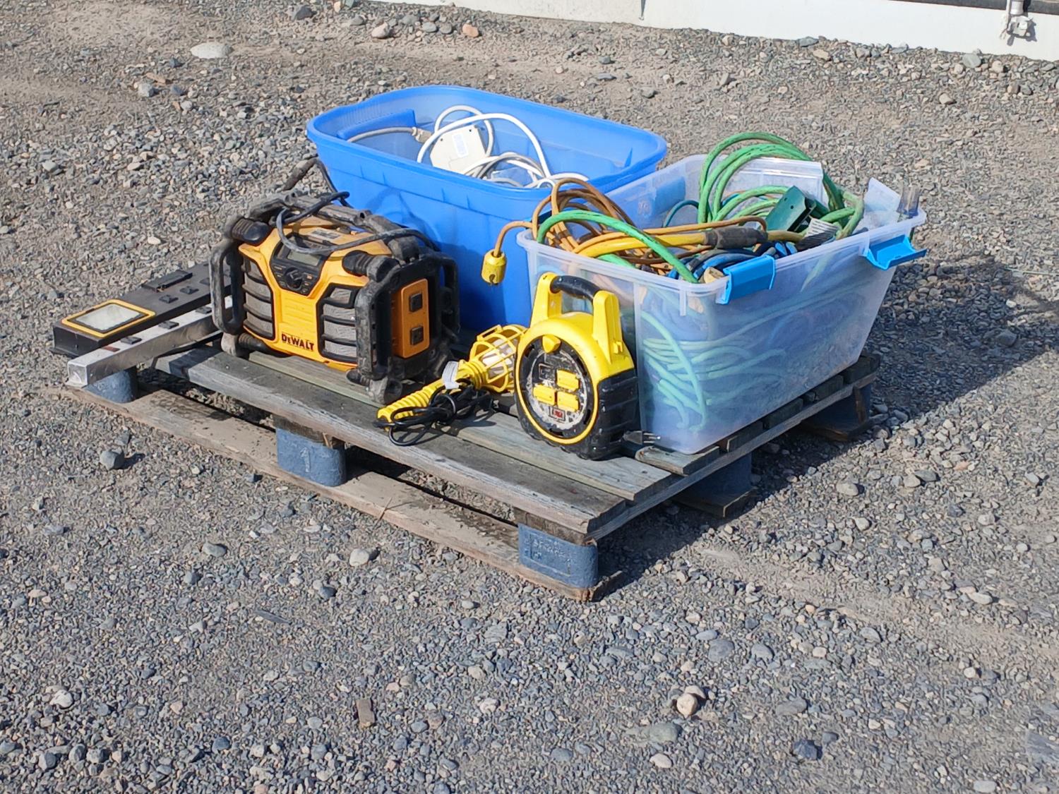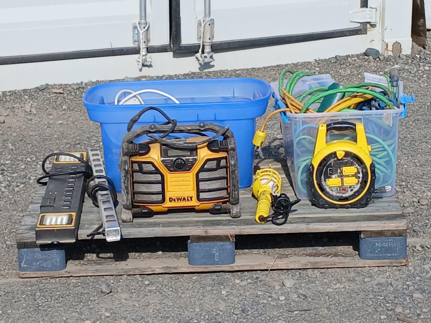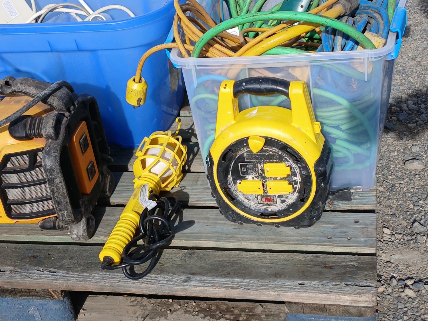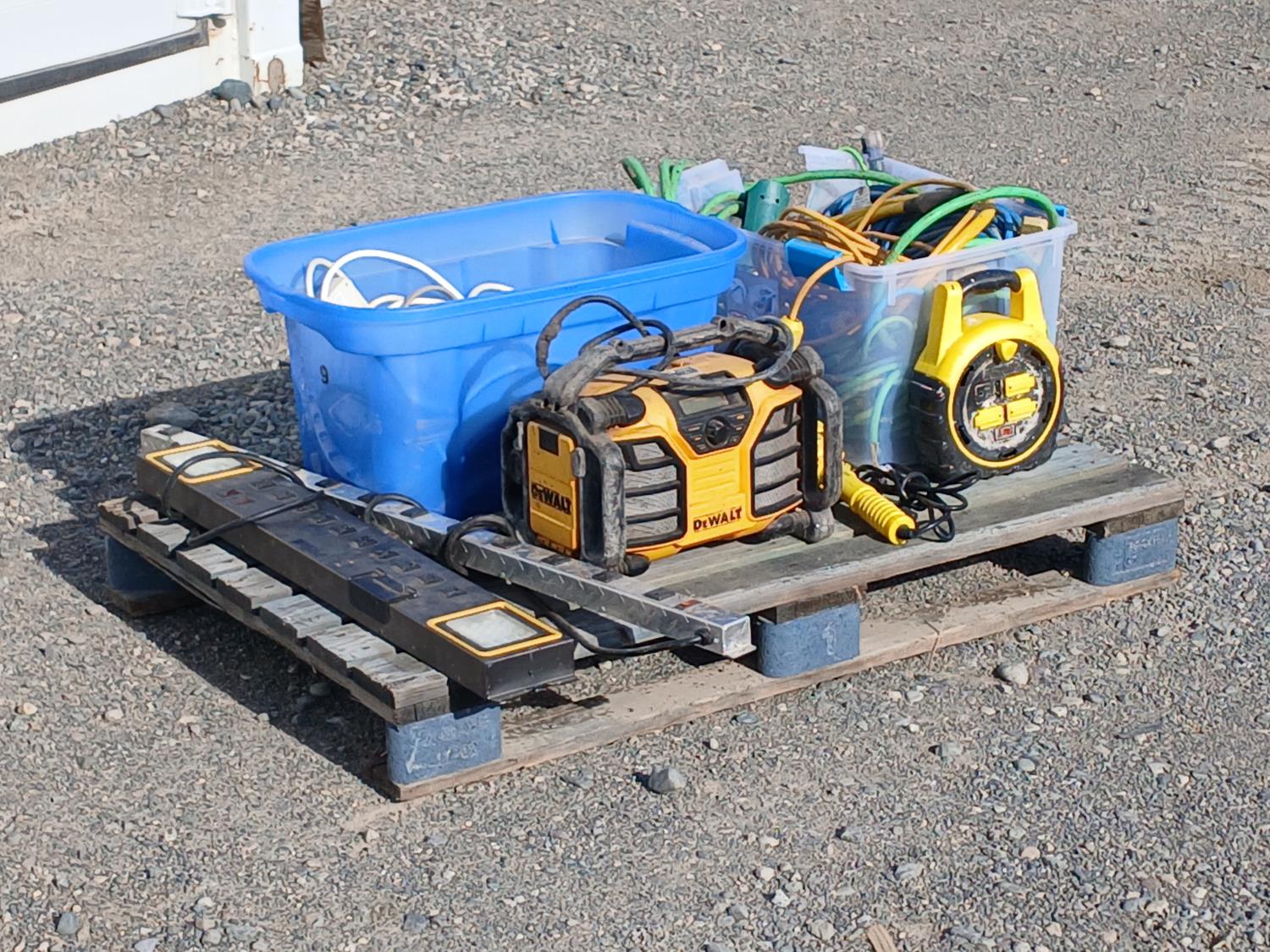 Numerous extension cords, (1) DeWalt shop radio, (1) power bar with LED lights, (1) 3 ft power bar, (1) treble light, (8) household power bars, (1) retractable cord with four outlets.