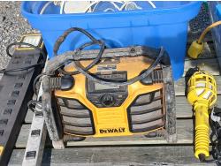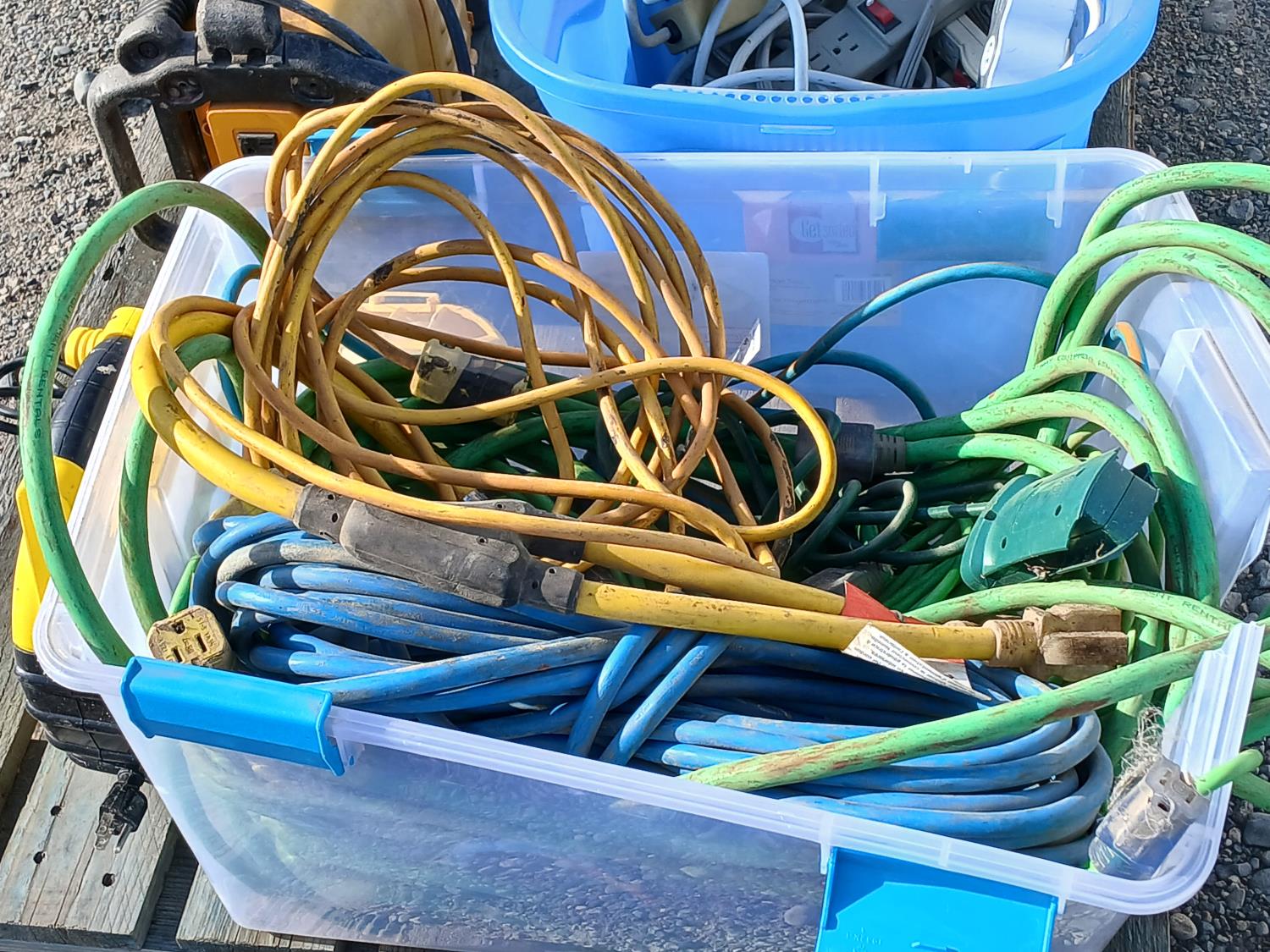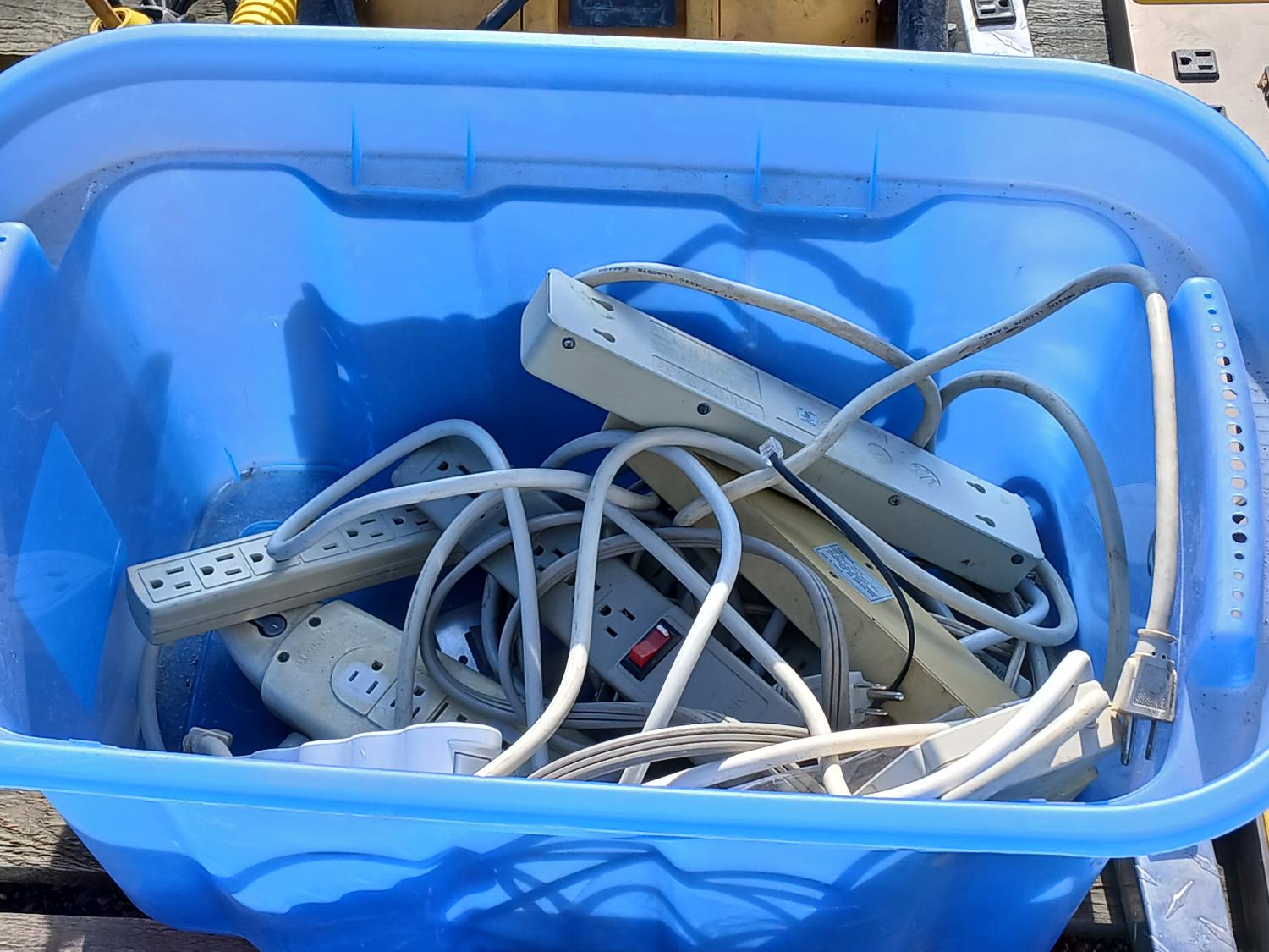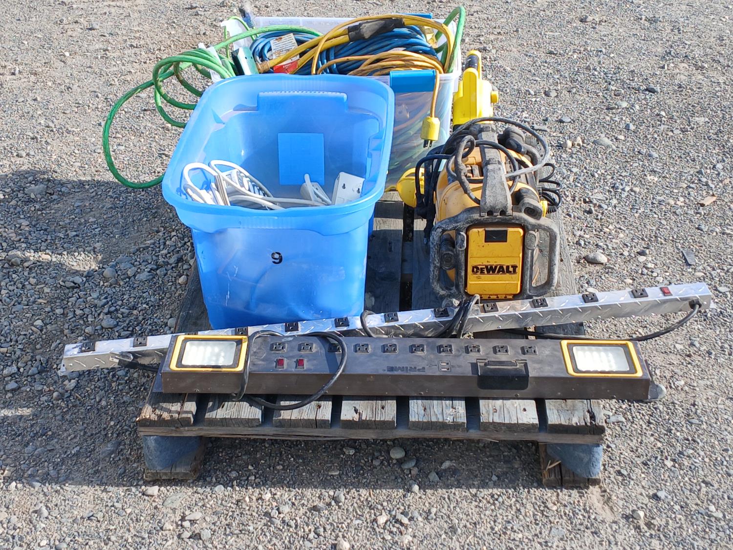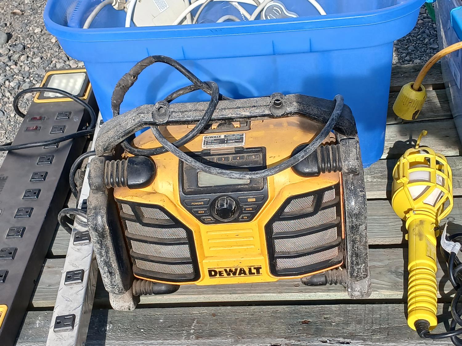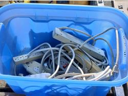 Numerous extension cords, (1) DeWalt shop radio, (1) power bar with LED lights, (1) 3 ft power bar, (1) treble light, (8) household power bars, (1) retractable cord with four outlets.