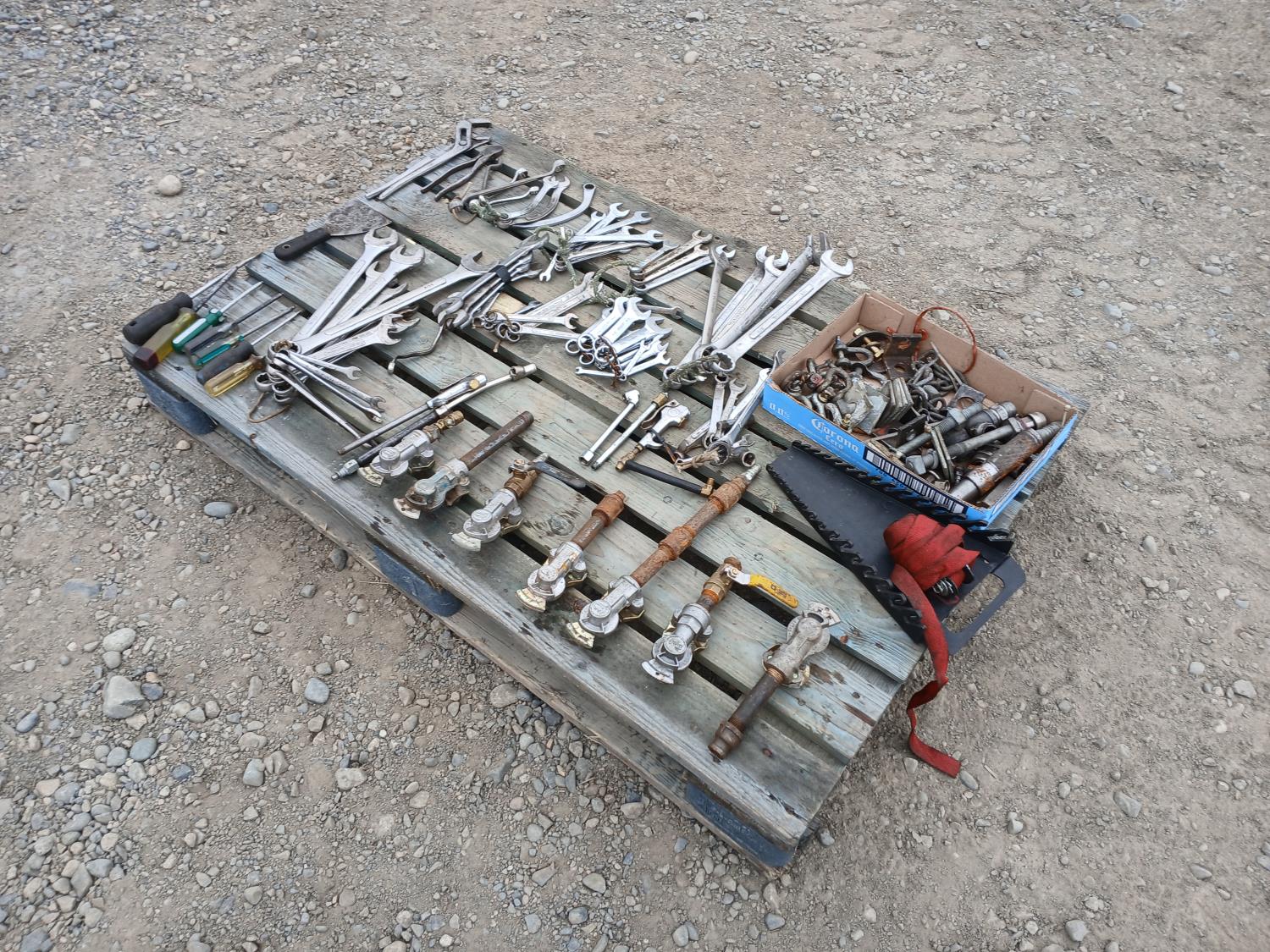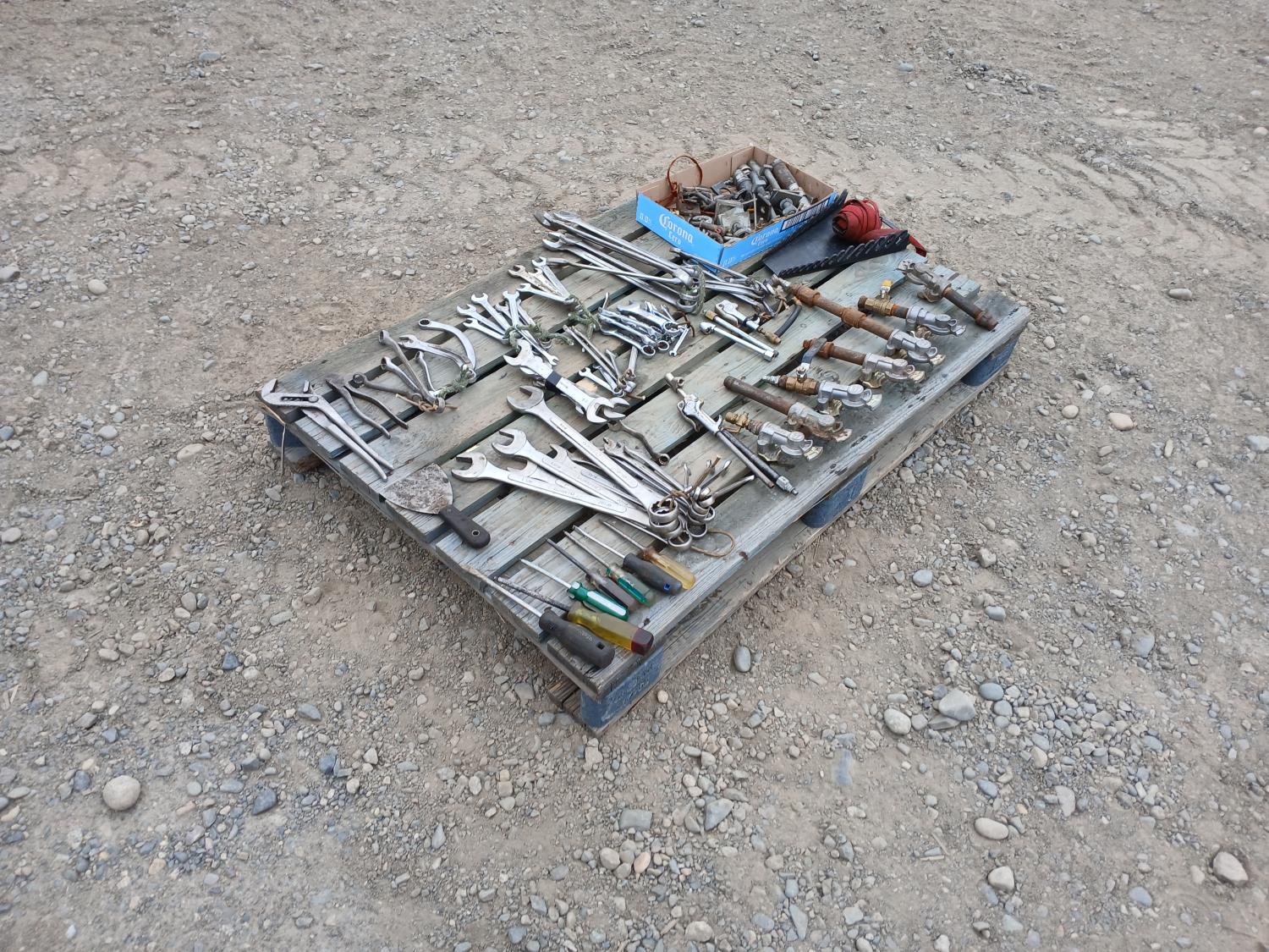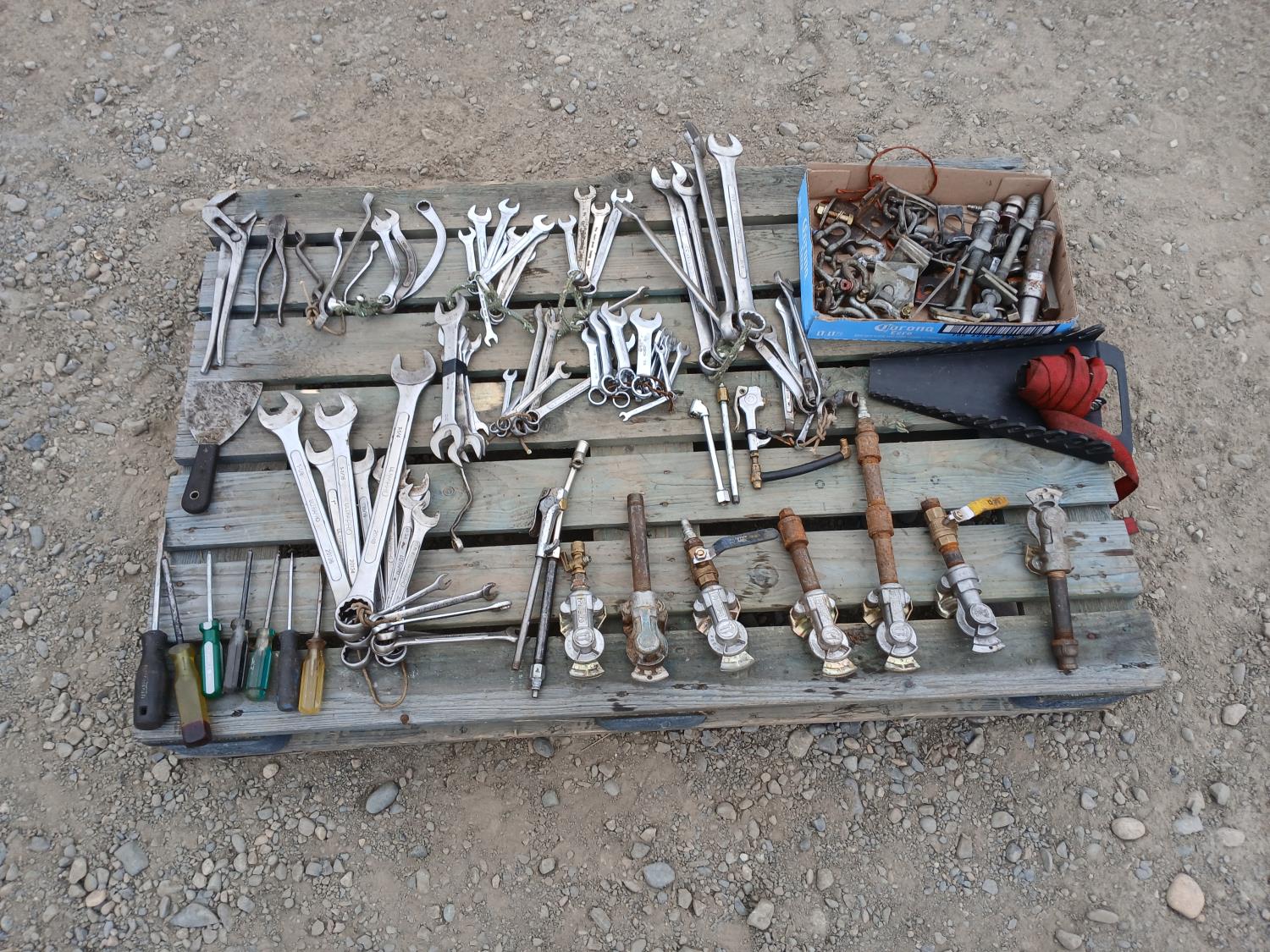 HD wrench set, wire cutters, screw driver set, (2) pressure gauges, multiple hose bibs, small shackles, miscellaneous nuts, bolts, and washers.