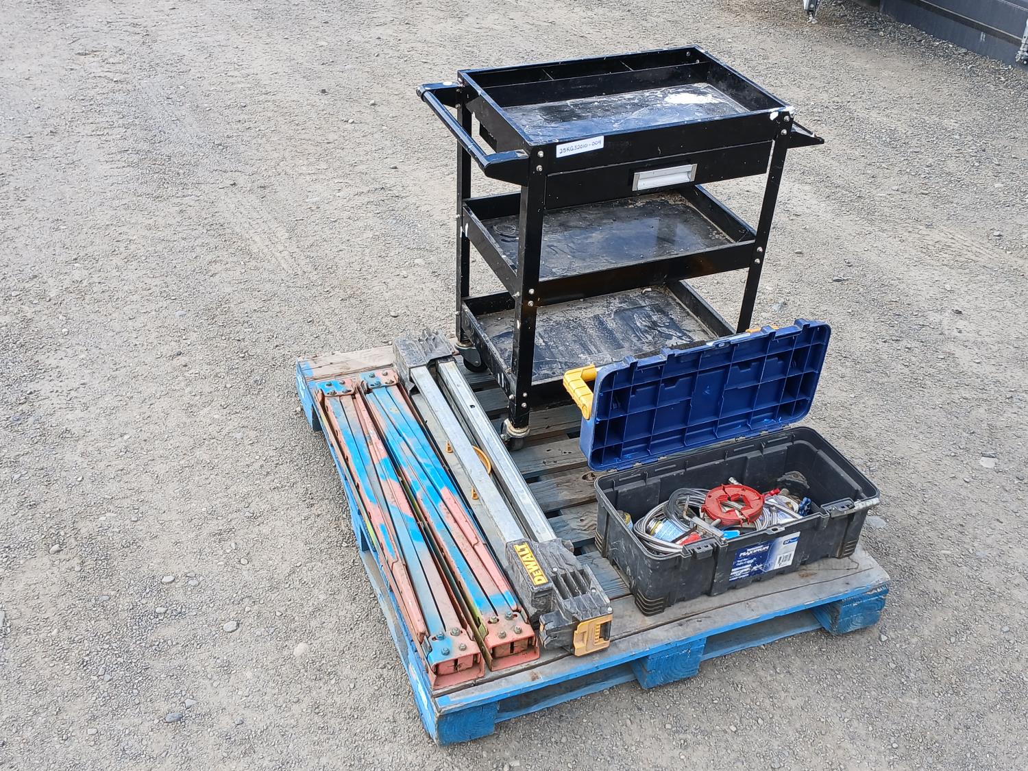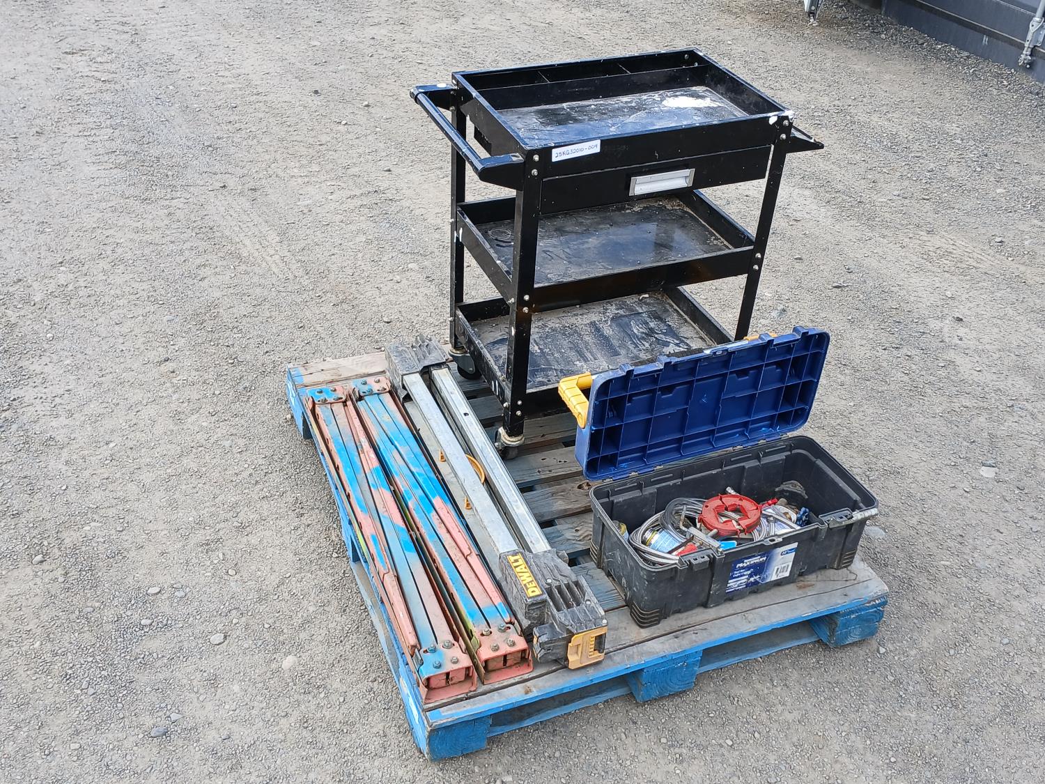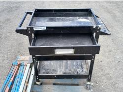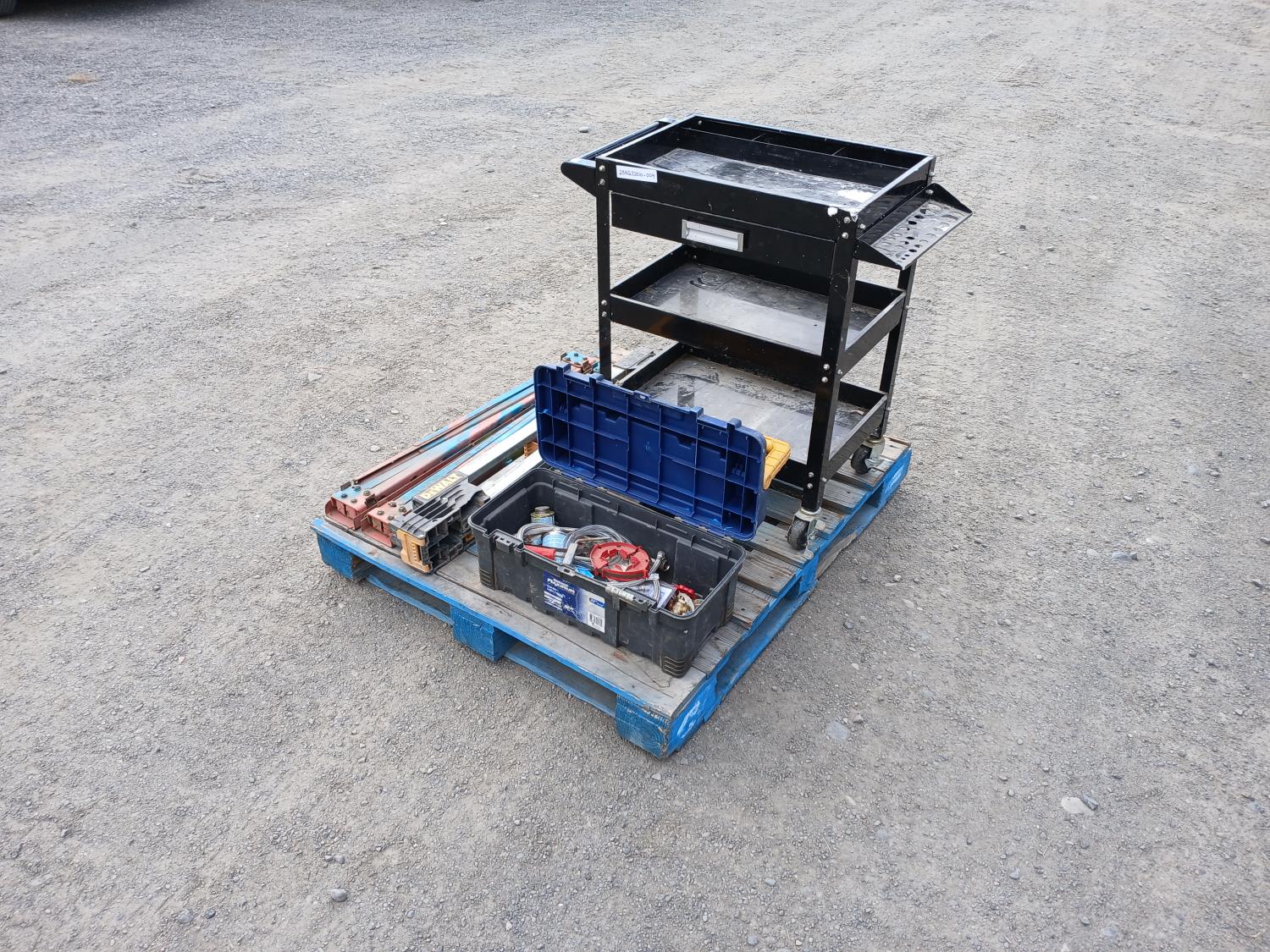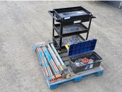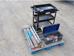 Black metal shop cart, with locking casters, 3 collapsible saw horses, and tool box full of plumbing fixtures and accessories.