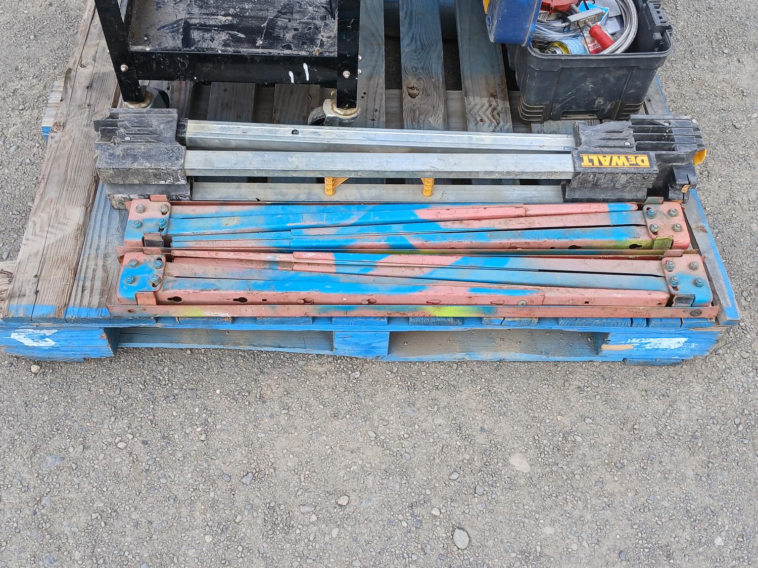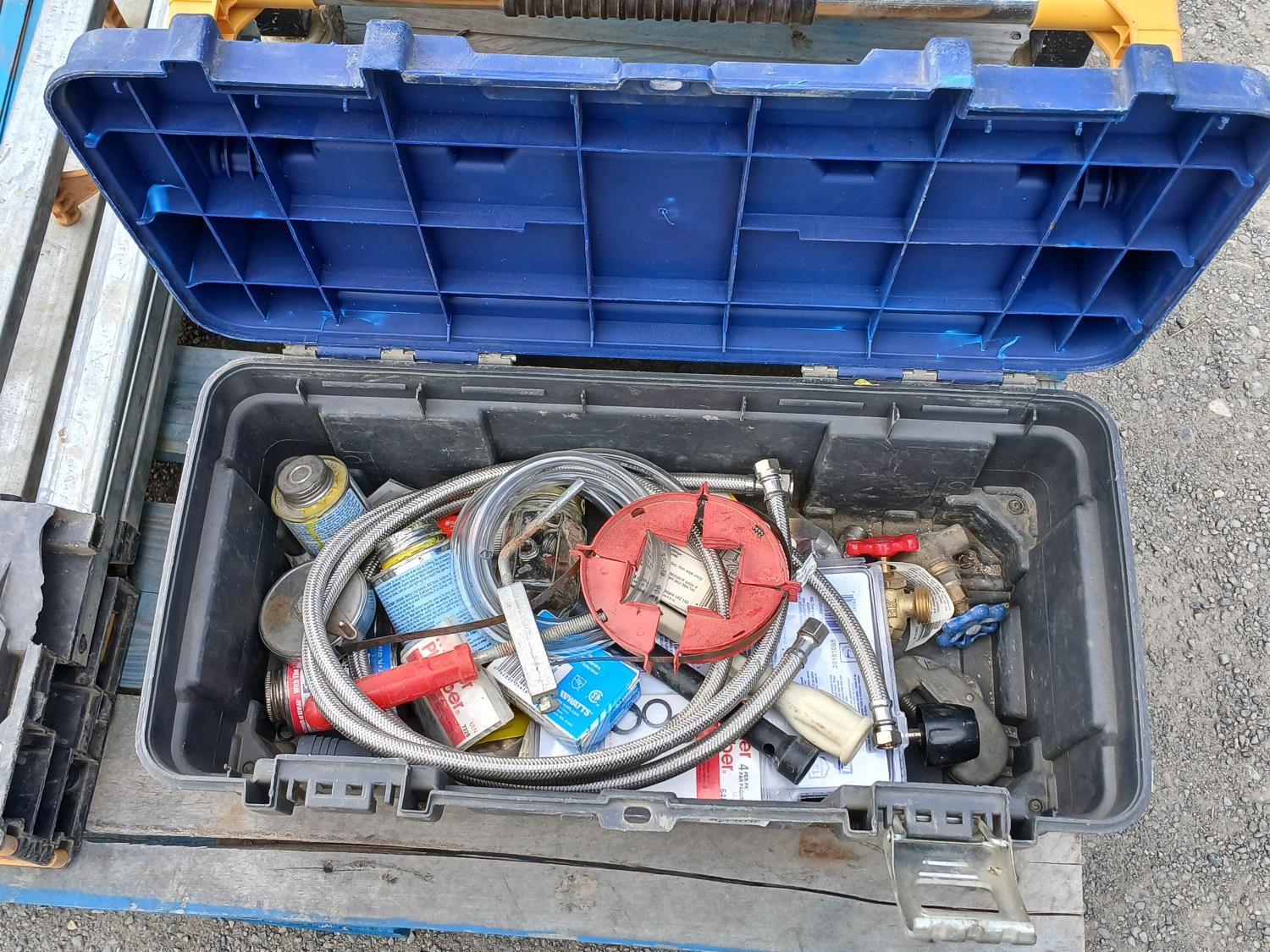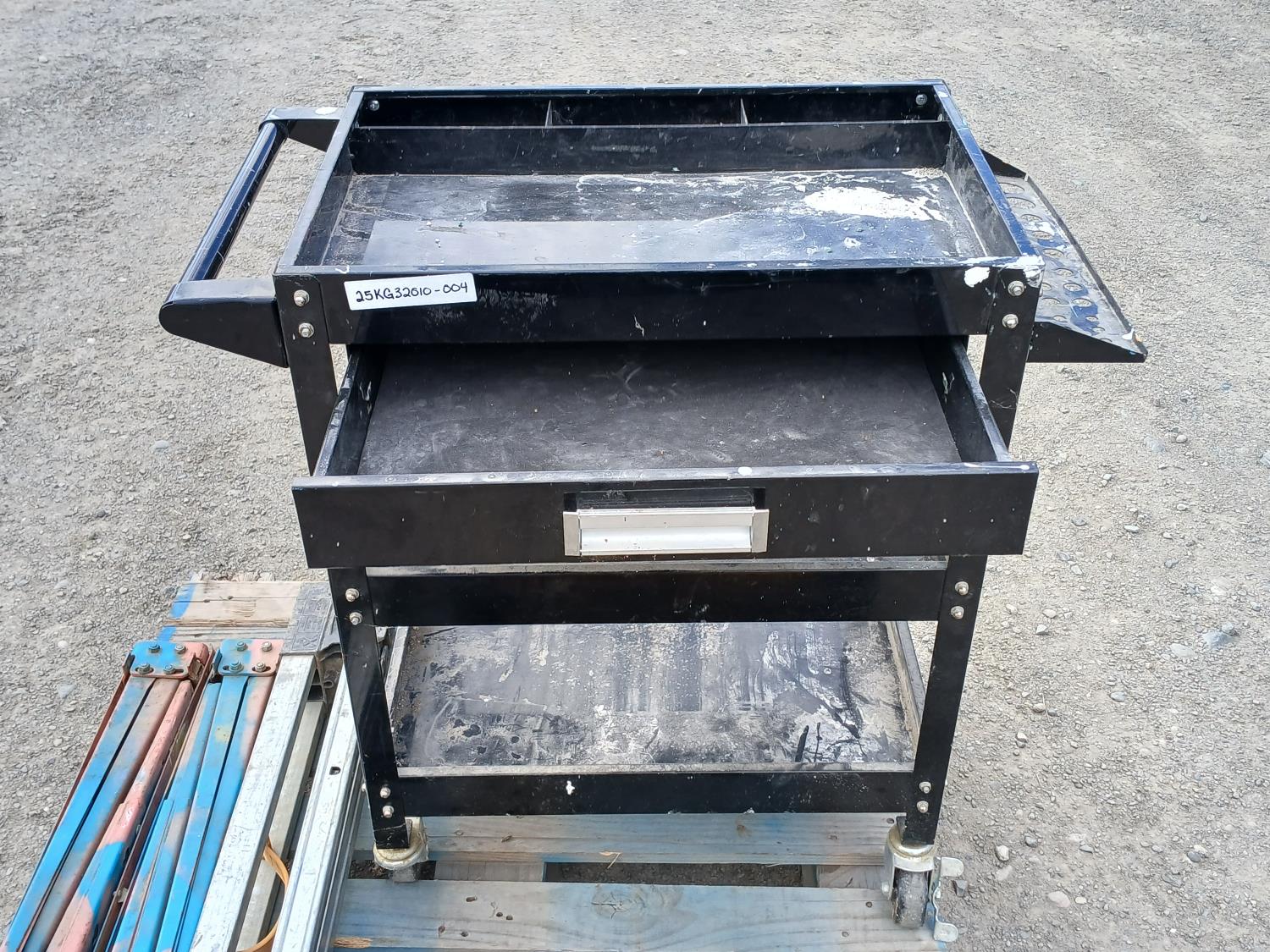 Black metal shop cart, with locking casters, 3 collapsible saw horses, and tool box full of plumbing fixtures and accessories.