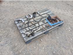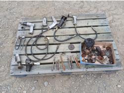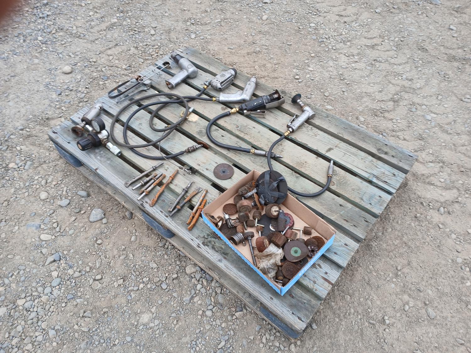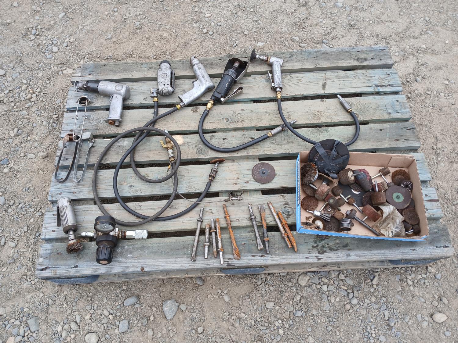 (1) Pneumatic air hammer, (1) Butterfly impact wrench, (1) pneumatic rivet gun, (3) Angle grinder, (1) air pressure regulator, (9) Jack hammer bits, multiple grinder accessories.