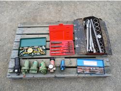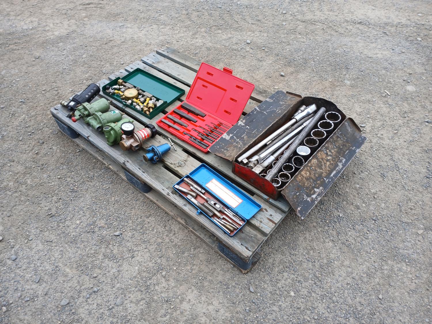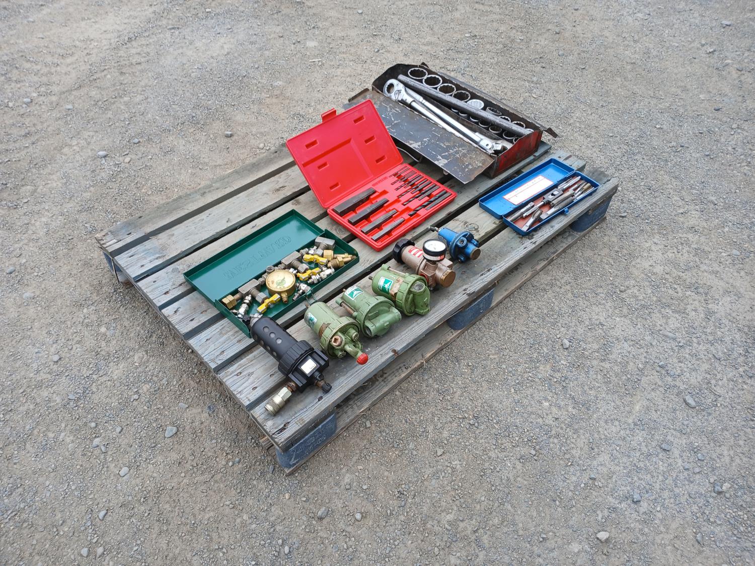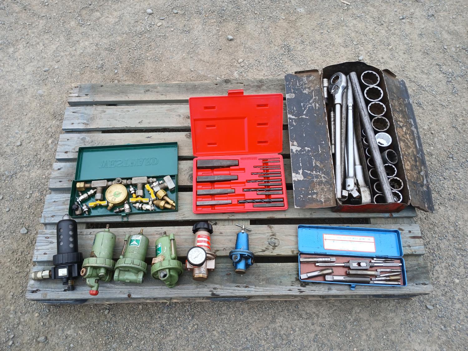 Air pressure regulators and filters, (1) Tap and die set, (1) HD Rachet and socket set, (1) hydraulic pressure test kit with accessories, Proto screw/pipe extraction kit.
