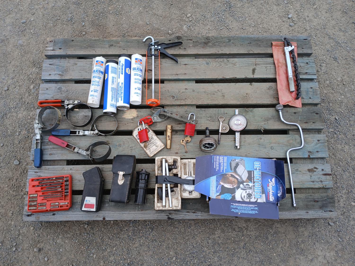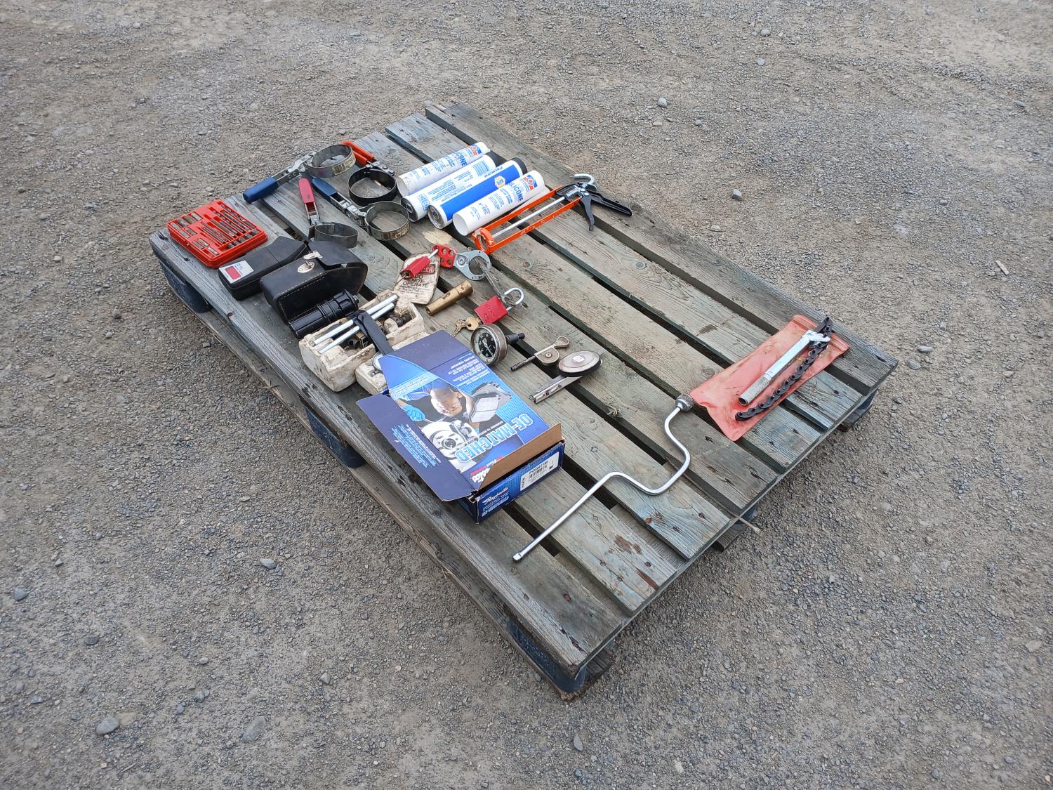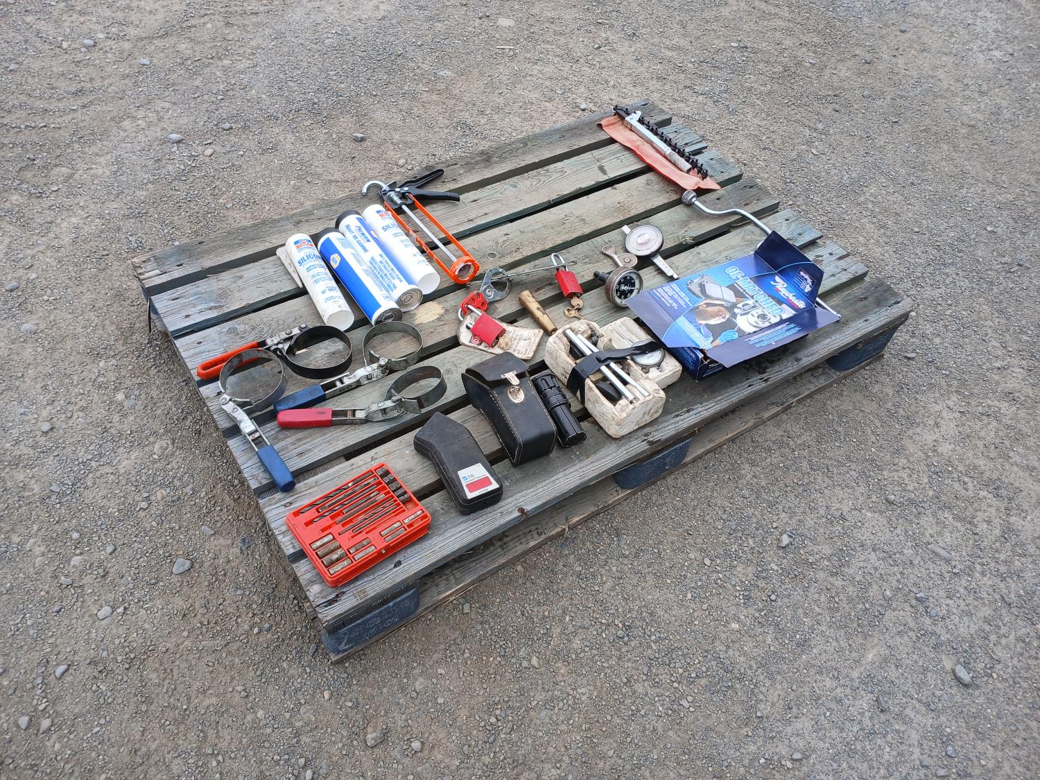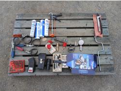 (1) screw extraction kit, (1) photo electric tachometer, (4) oil filter wrenches, (2) tubes silicone, (2) tubes bearing grease with applicator, (1) Cam rotation gauge, (2) portable hand tachometer, (1) dial indicator kit, (1) exhaust tail pipe expander, Socket set, wrench set, (1) chain style pipe cutter.