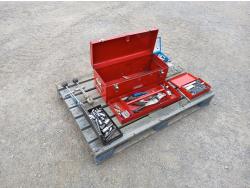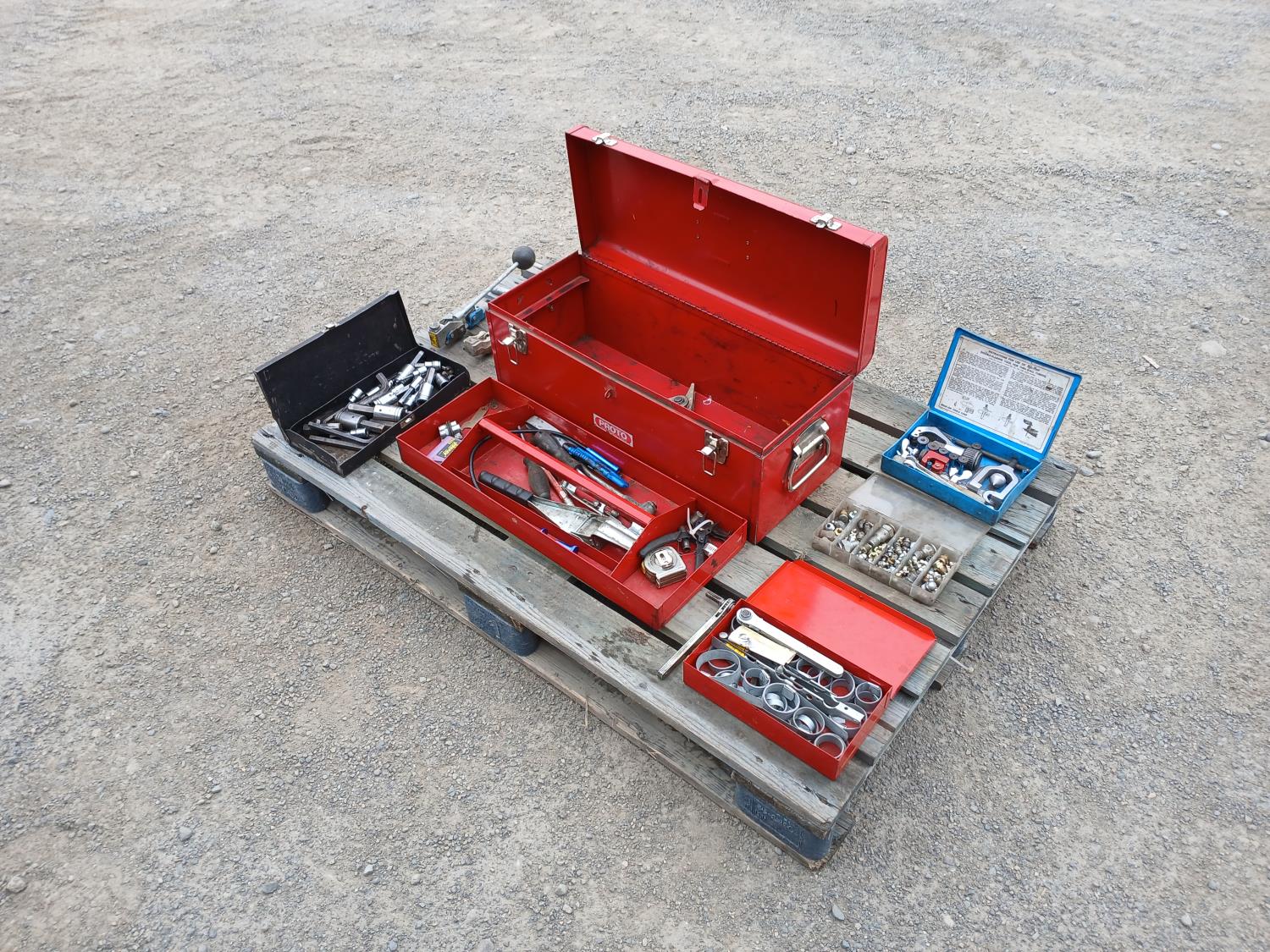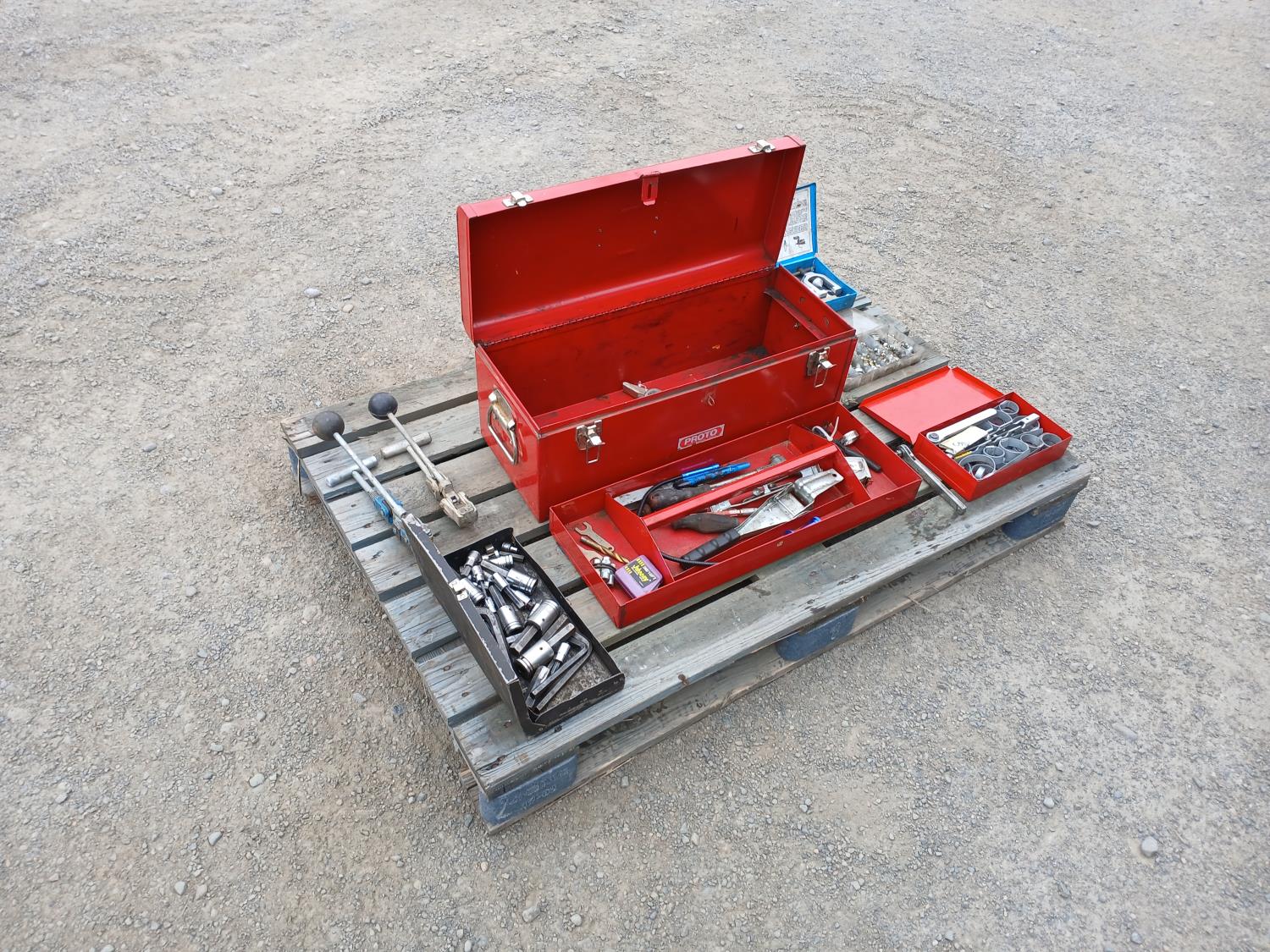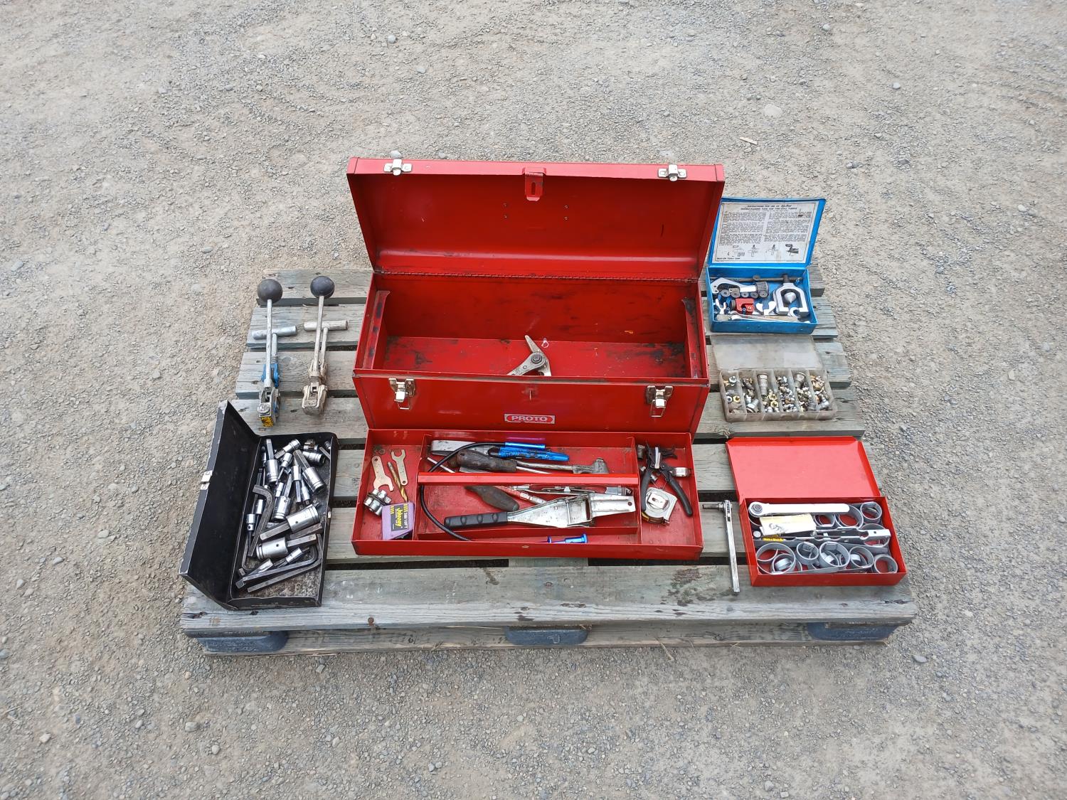 (1) Proto tool box, slip joint pliers, pressure gauge, (2) band clamp applicators, (1) punch lock clamp master kit, (1) grese fiitings set, (1) flaring kit, and various small tools and accessories.