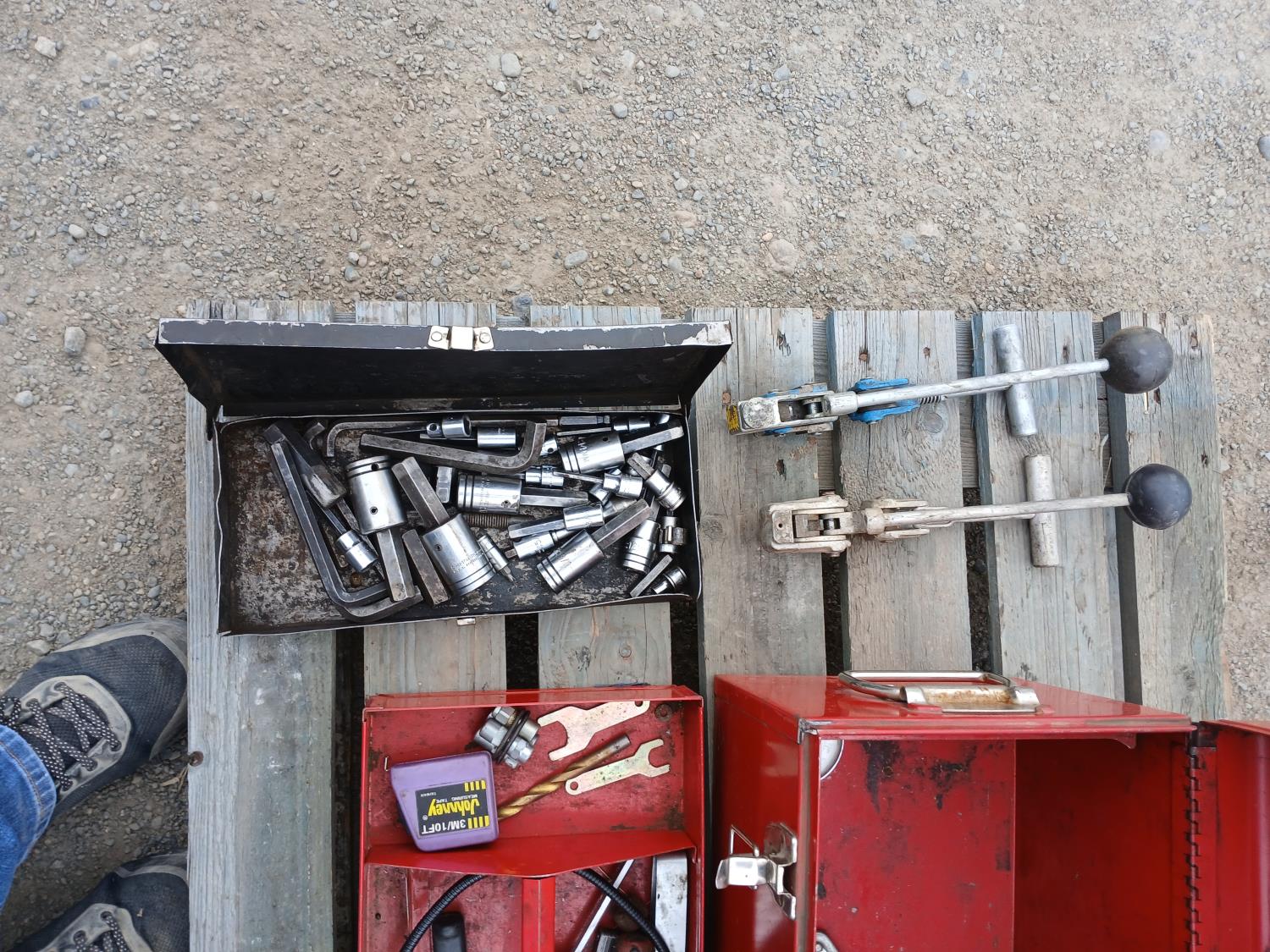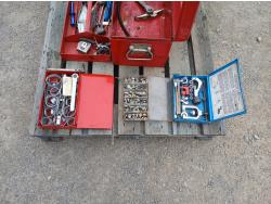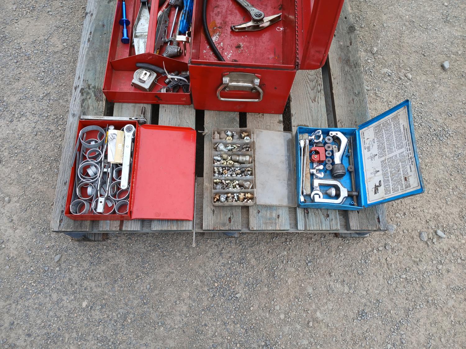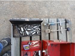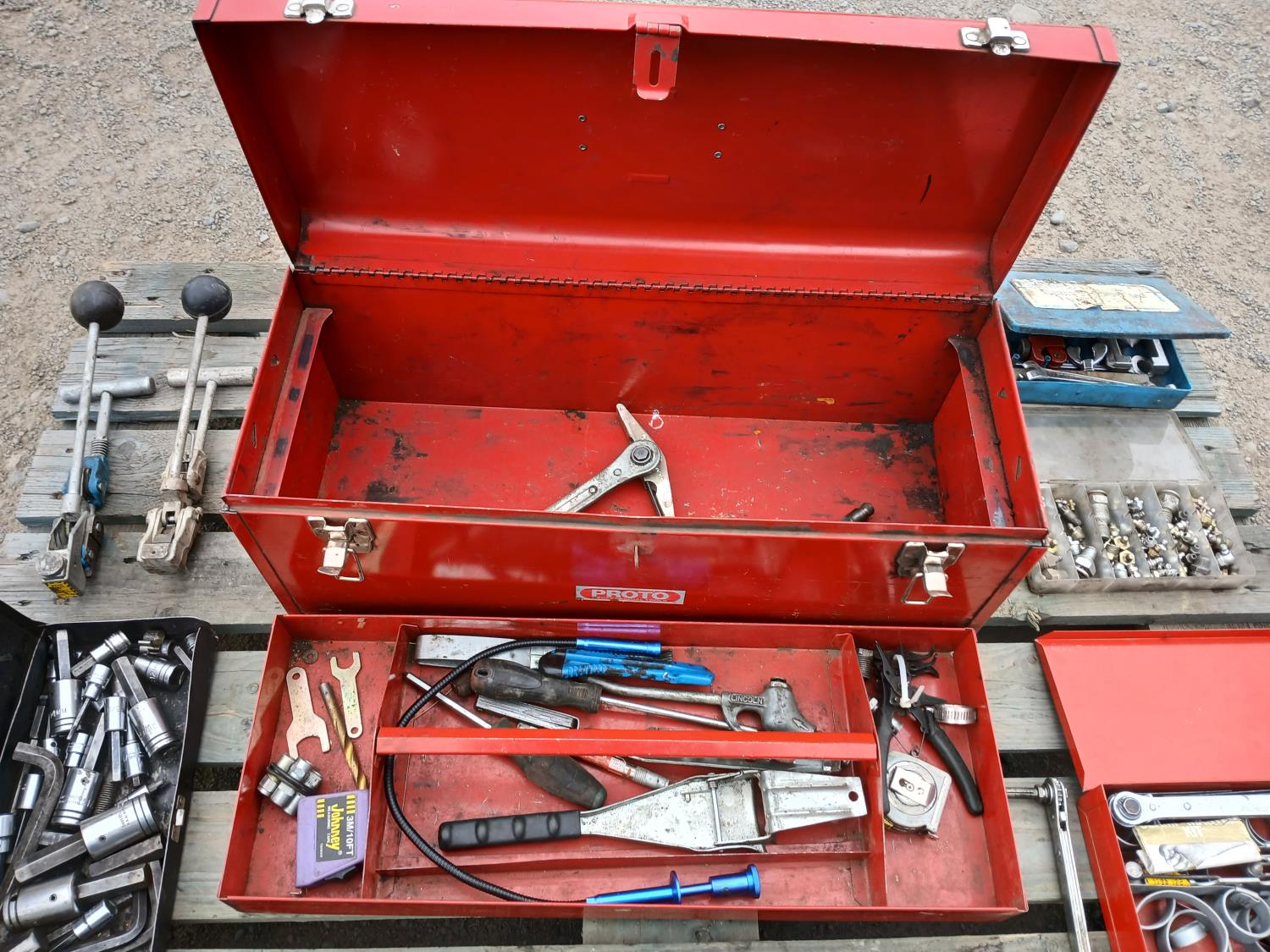 (1) Proto tool box, slip joint pliers, pressure gauge, (2) band clamp applicators, (1) punch lock clamp master kit, (1) grese fiitings set, (1) flaring kit, and various small tools and accessories.