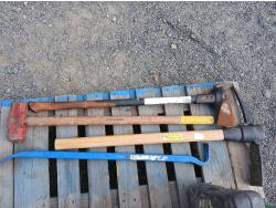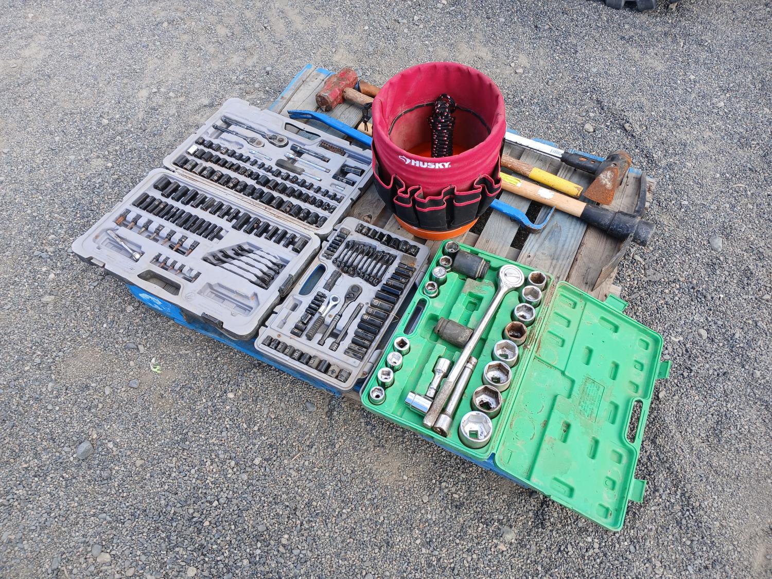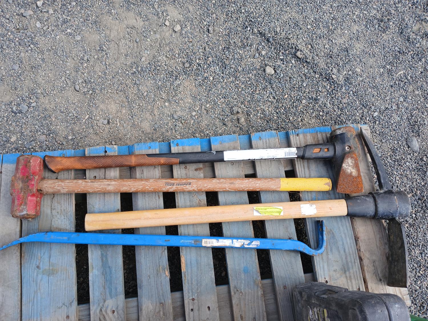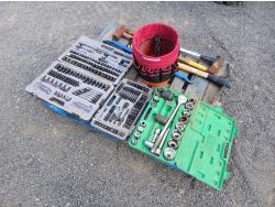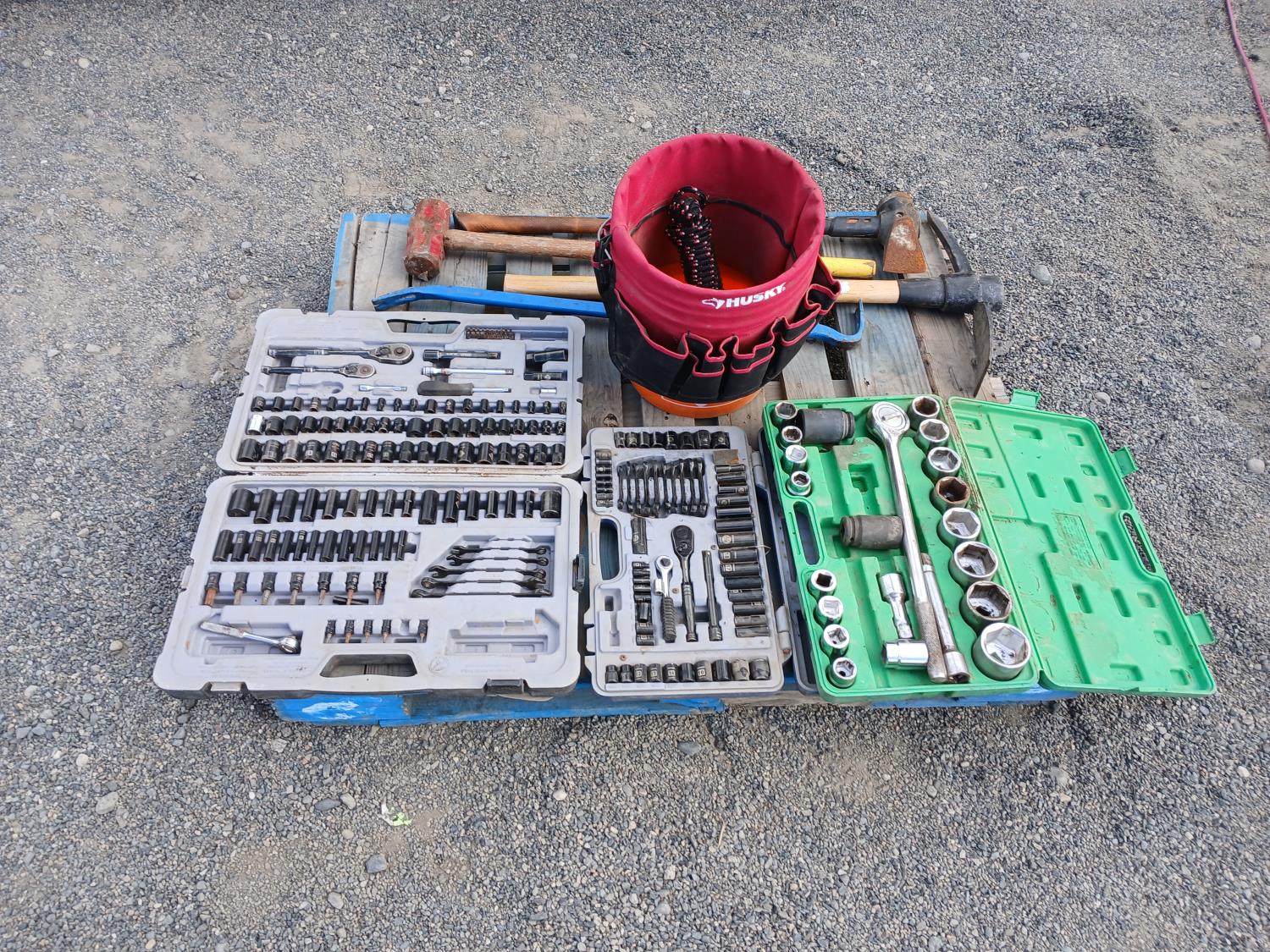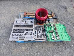 (1) splitting maul, (1) pick axe, (1) pry bar, (3) socket sets (two are black chrome), (1)tool pail, 50 foot nylon rope.