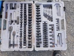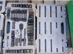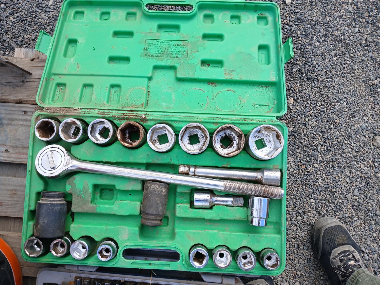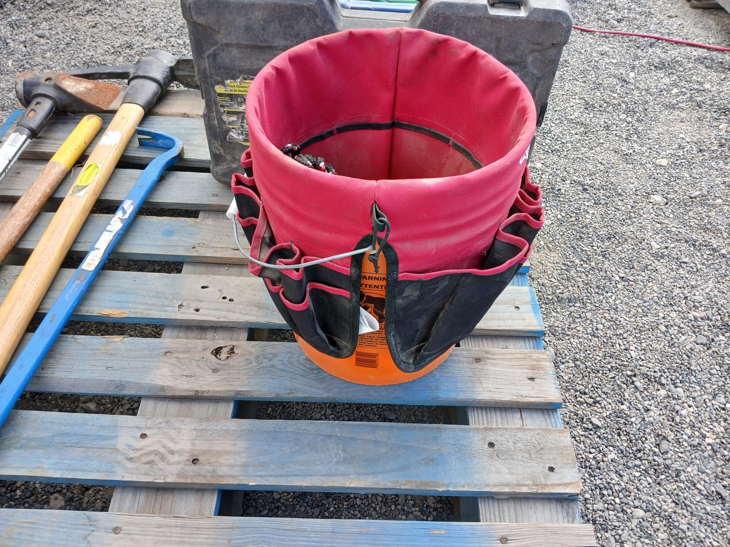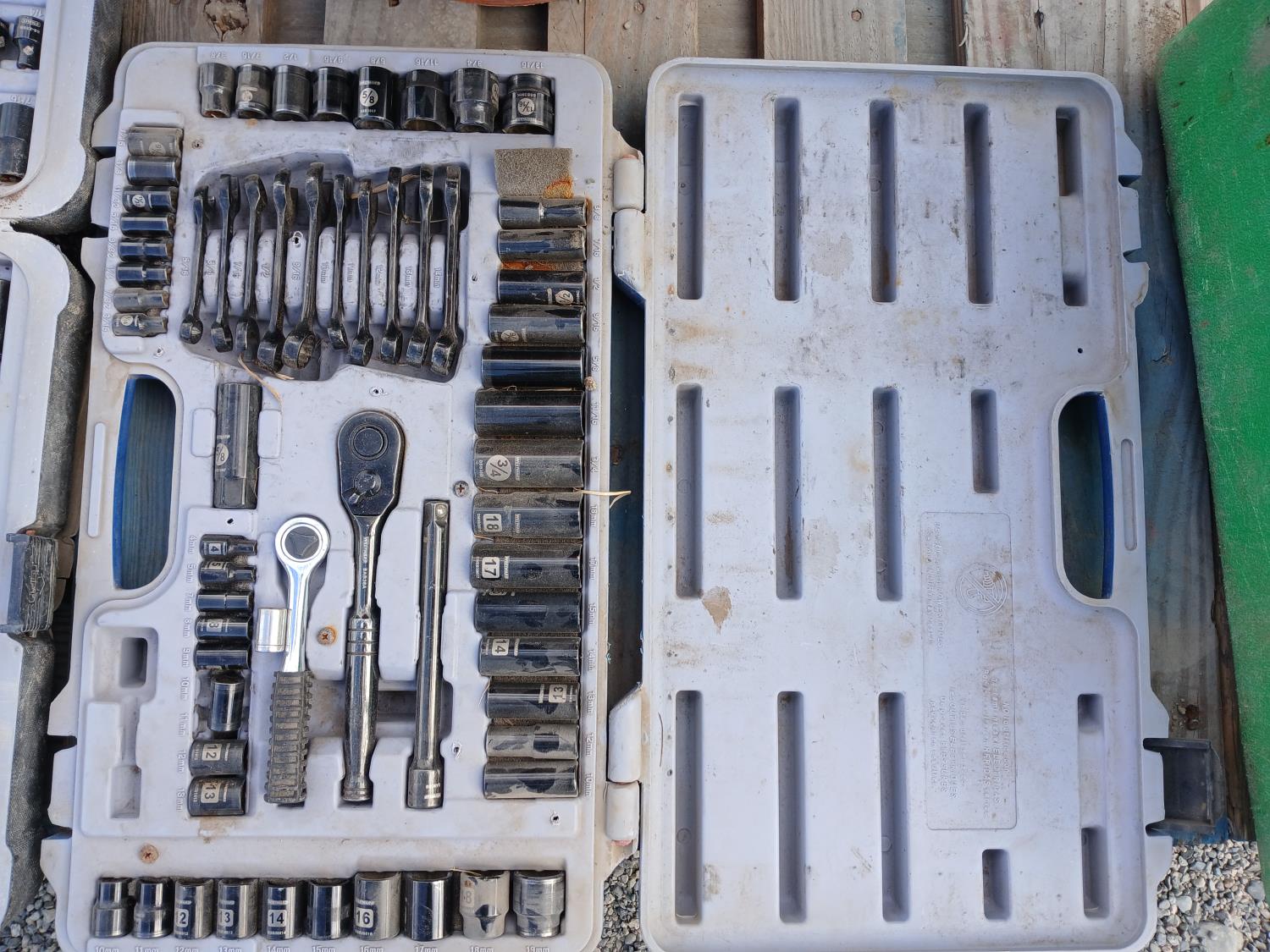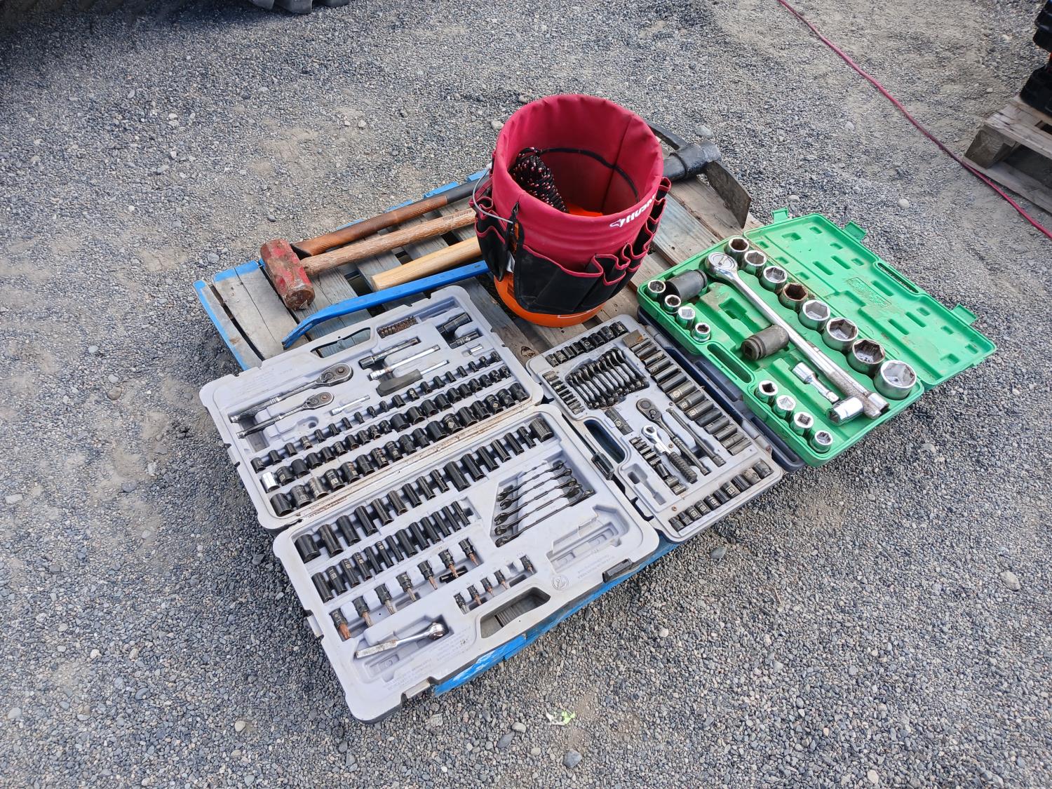 (1) splitting maul, (1) pick axe, (1) pry bar, (3) socket sets (two are black chrome), (1)tool pail, 50 foot nylon rope.