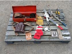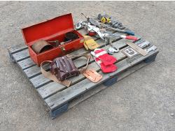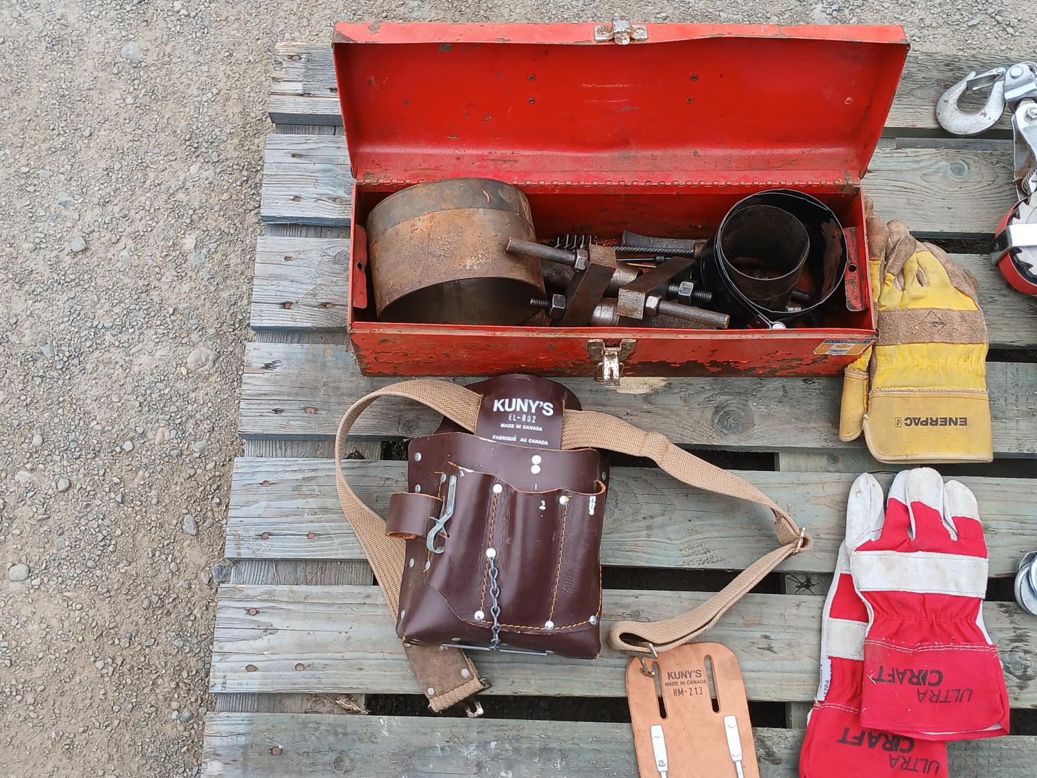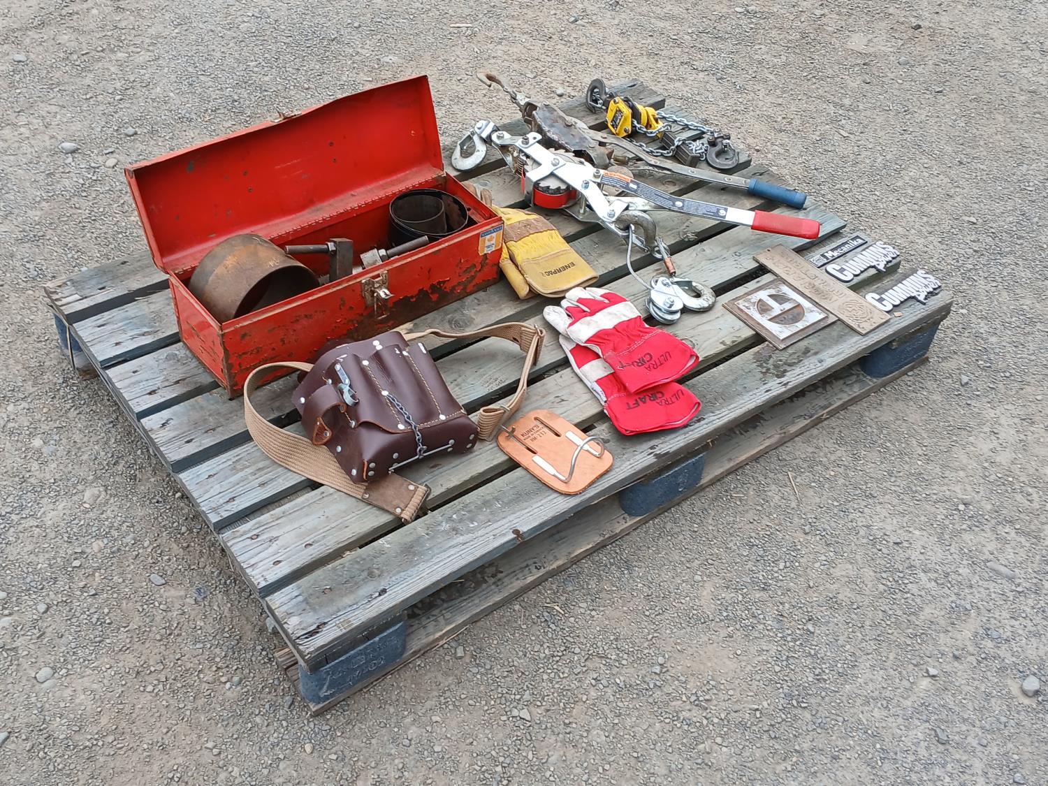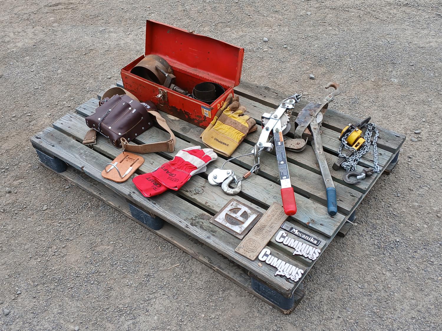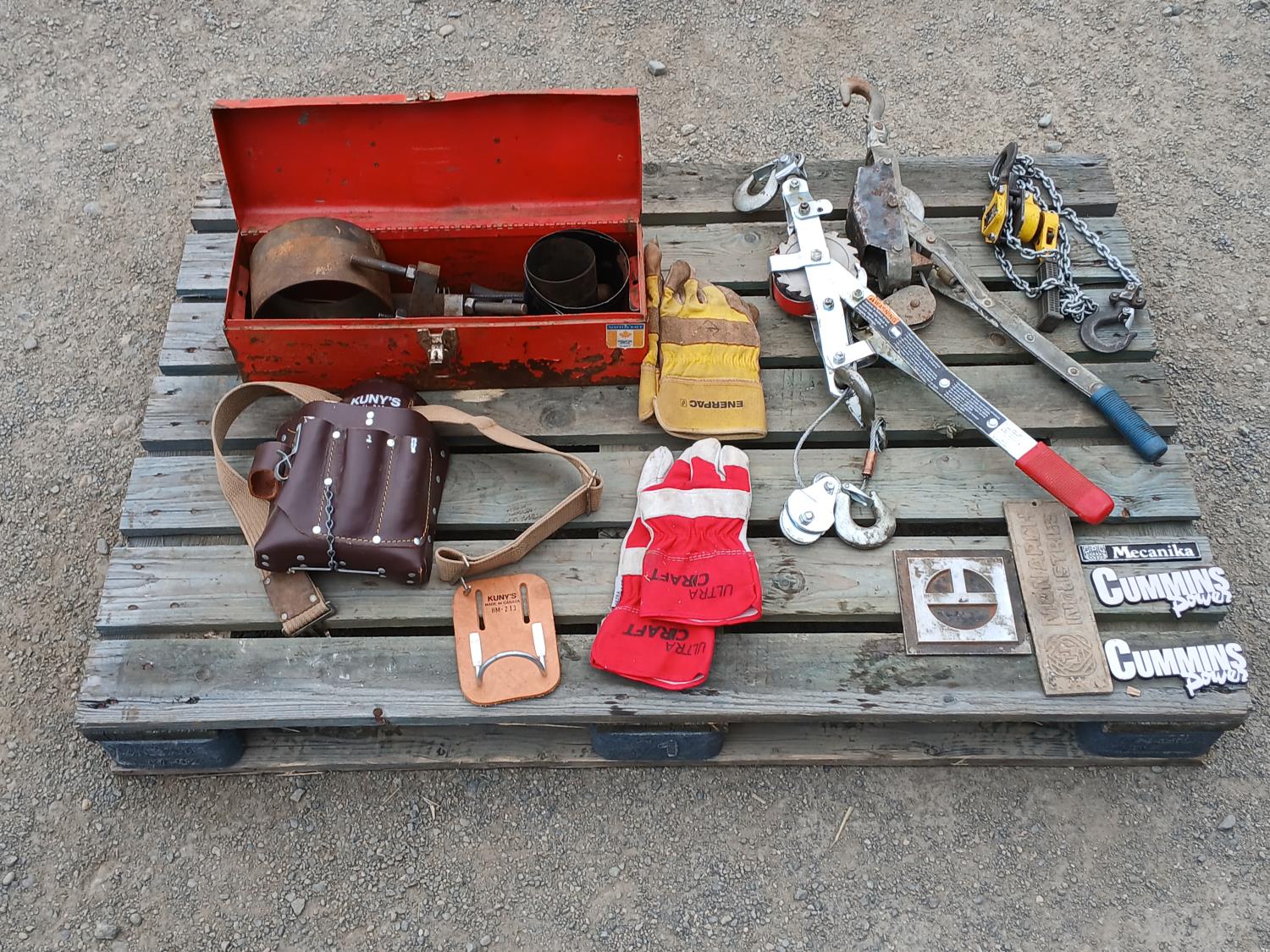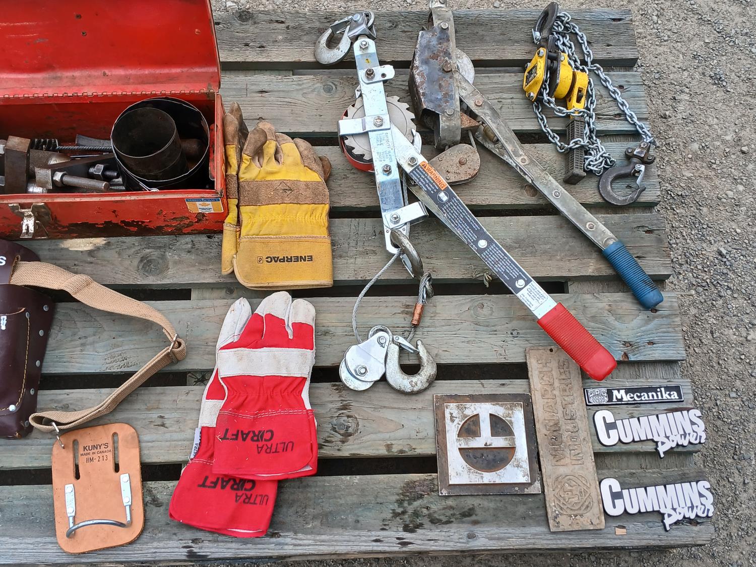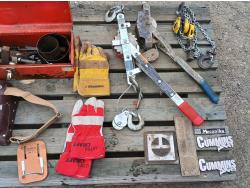 (1) small tool box, (2) bearing/bushing removal tools, (2) pairs work gloves, (1) tool belt, (5) Brand placards, (1)lever chain hoist, (2)Lever hoist.
