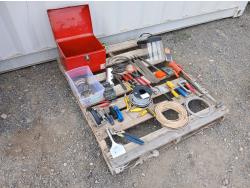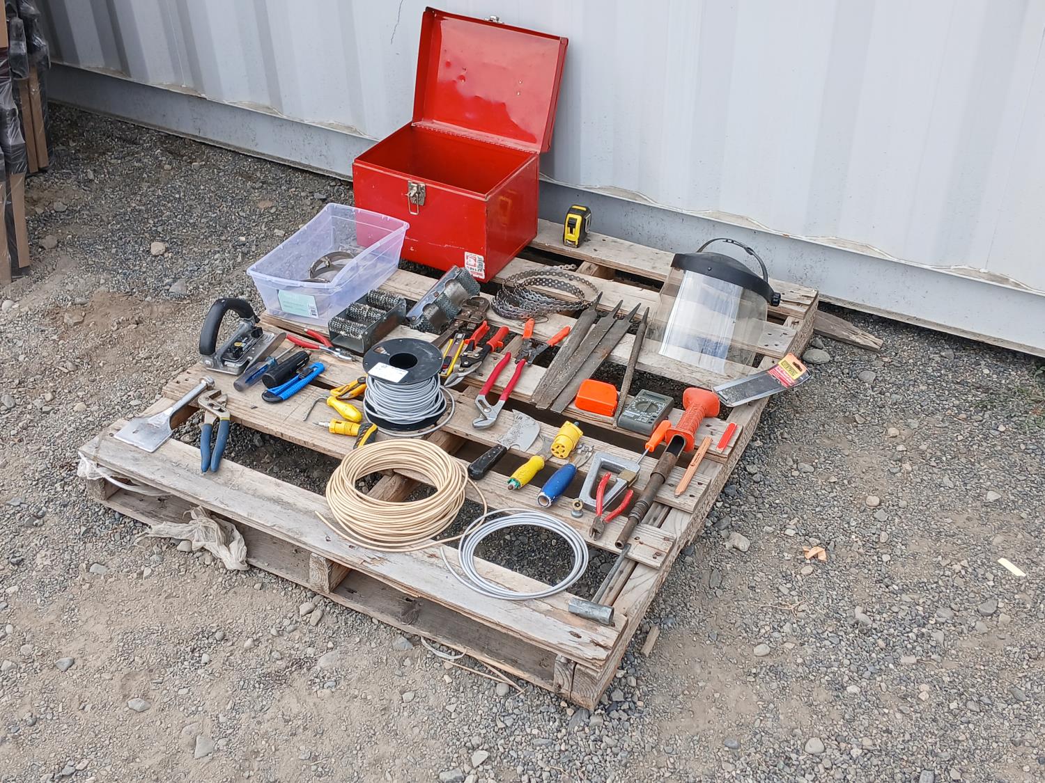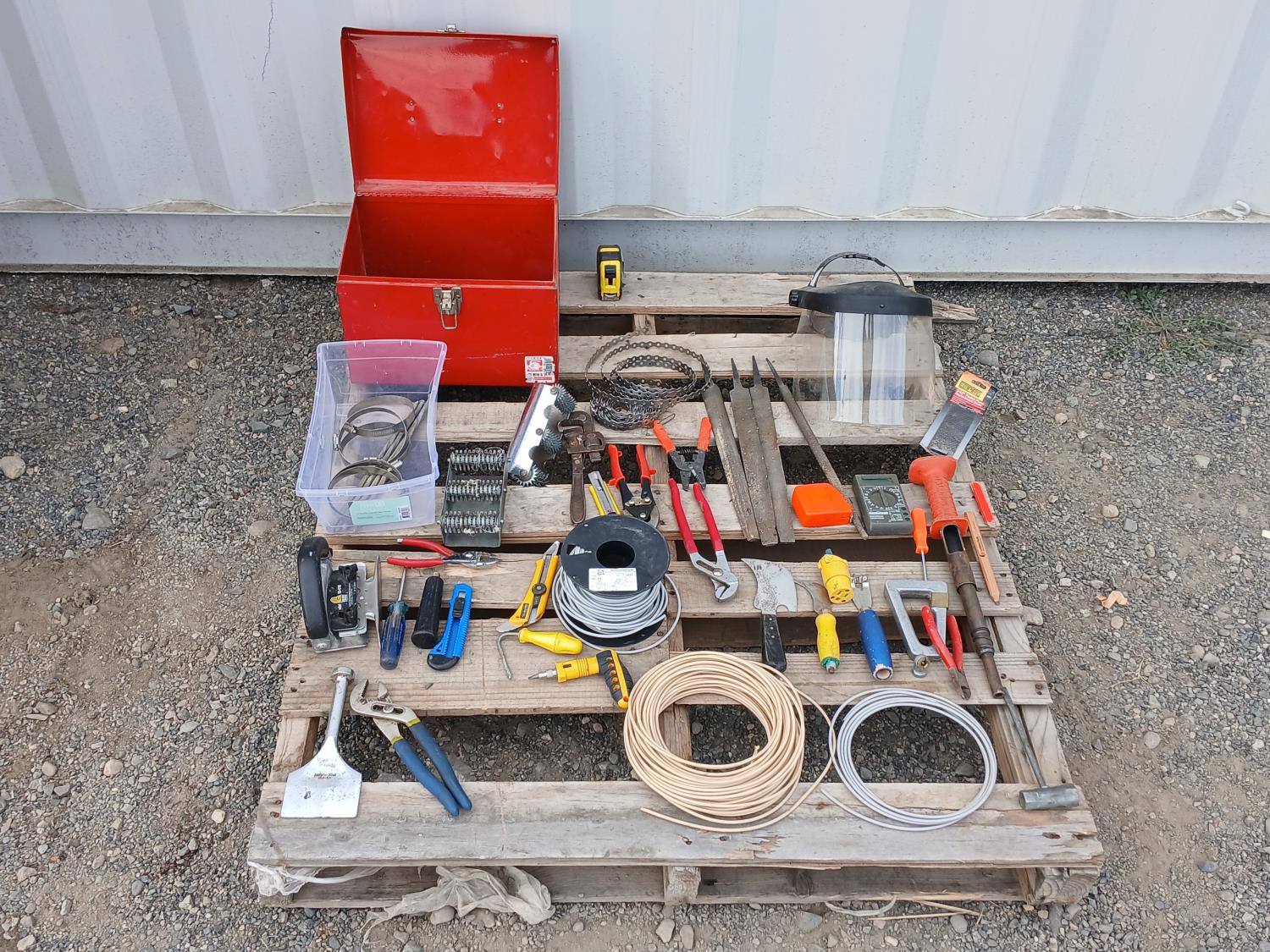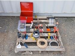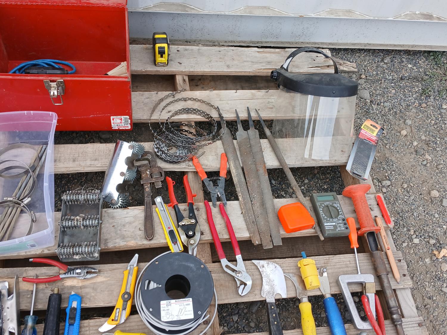 Shop safety face shield, (2) carpet tractors, spool of wire, wrenches, box cutters, multiple pliers, and various other tools and accessories.