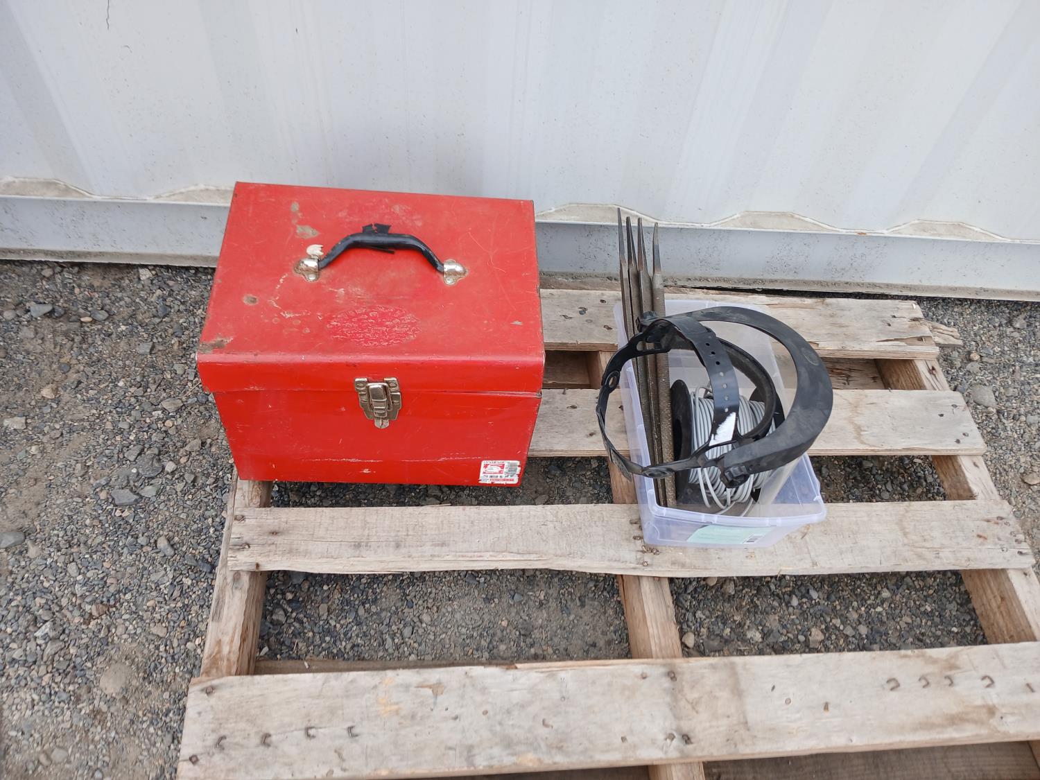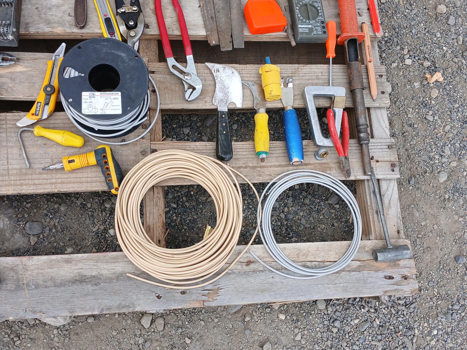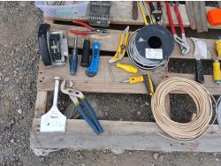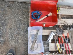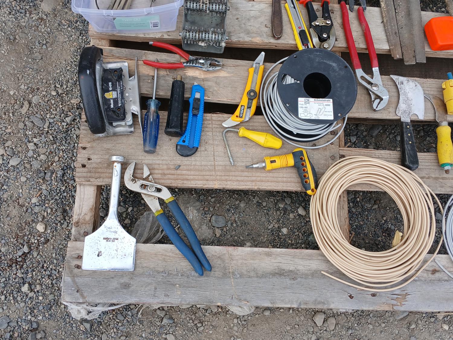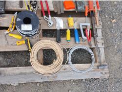 Shop safety face shield, (2) carpet tractors, spool of wire, wrenches, box cutters, multiple pliers, and various other tools and accessories.
