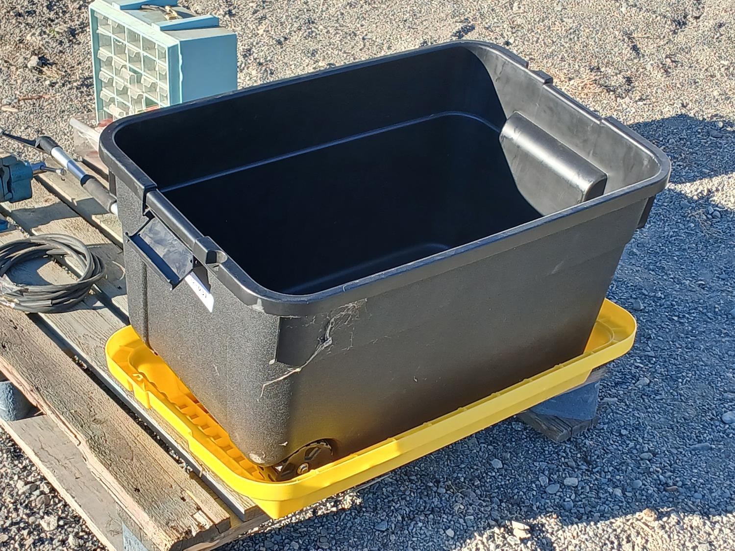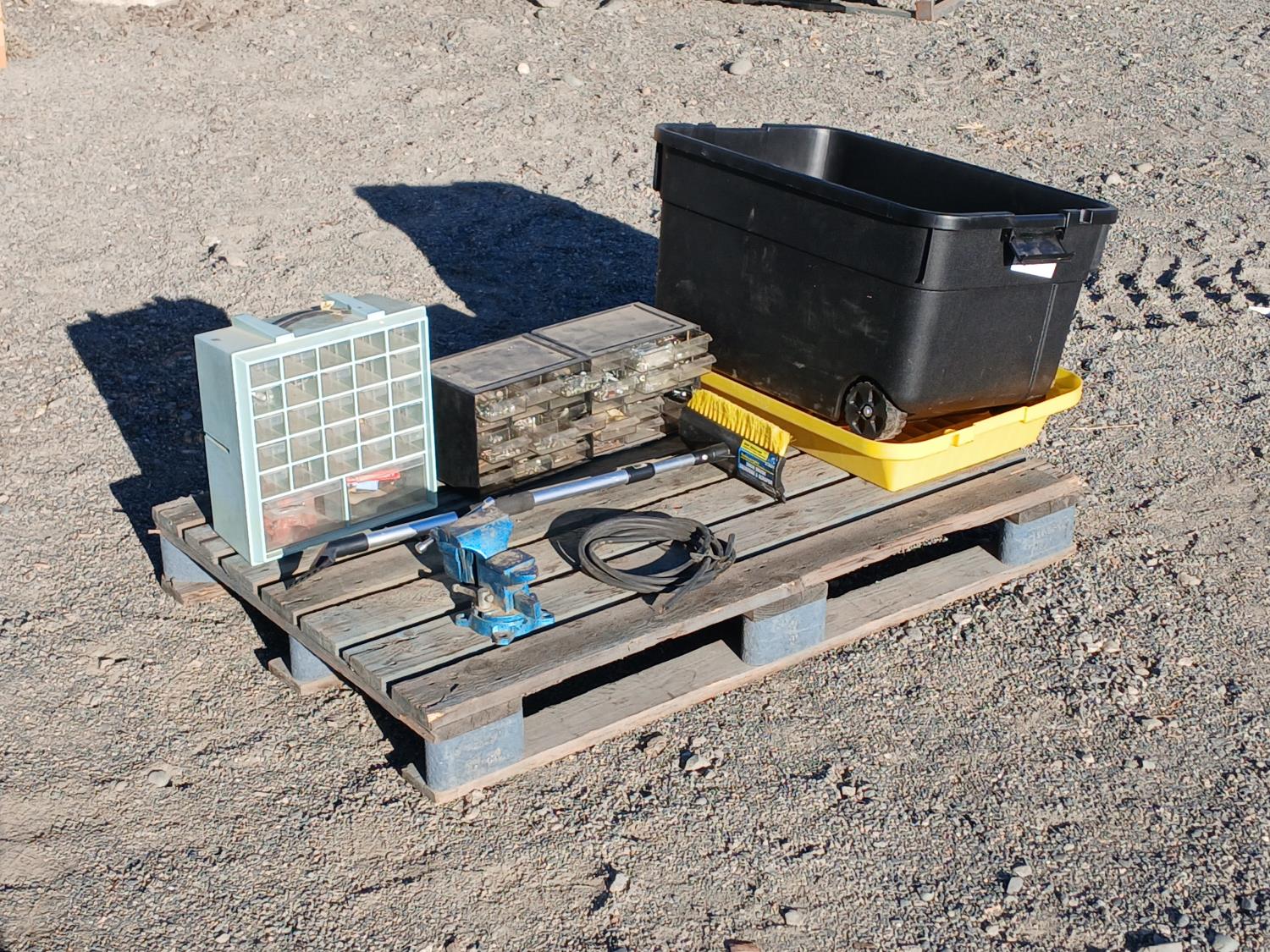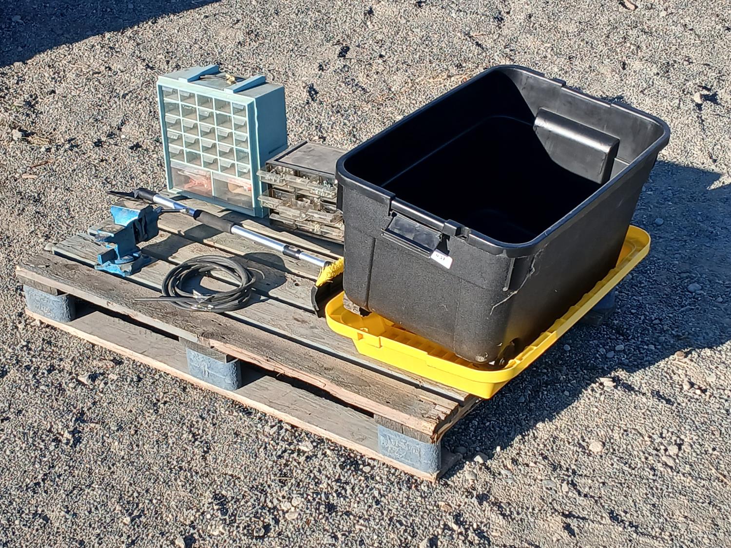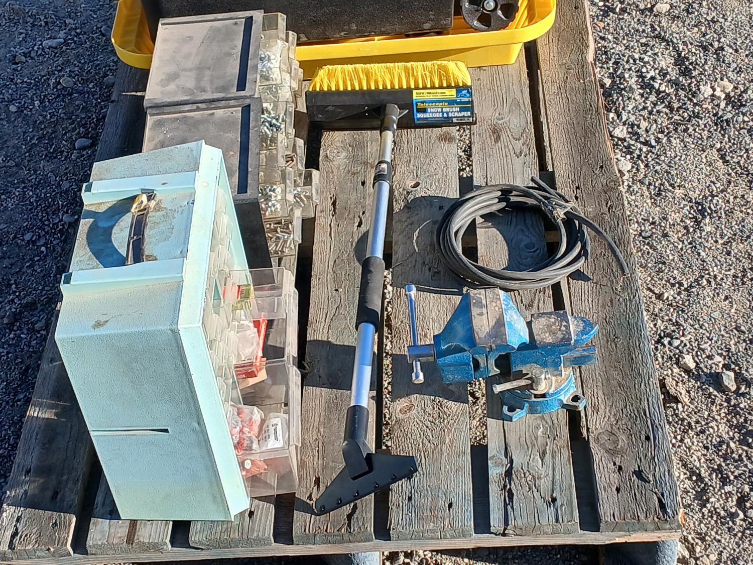 (3) Full multiple drawer small storage cases, rubber tubing, (1) mountable vice, (1) telescope snow brush, large tote on wheels with handle.