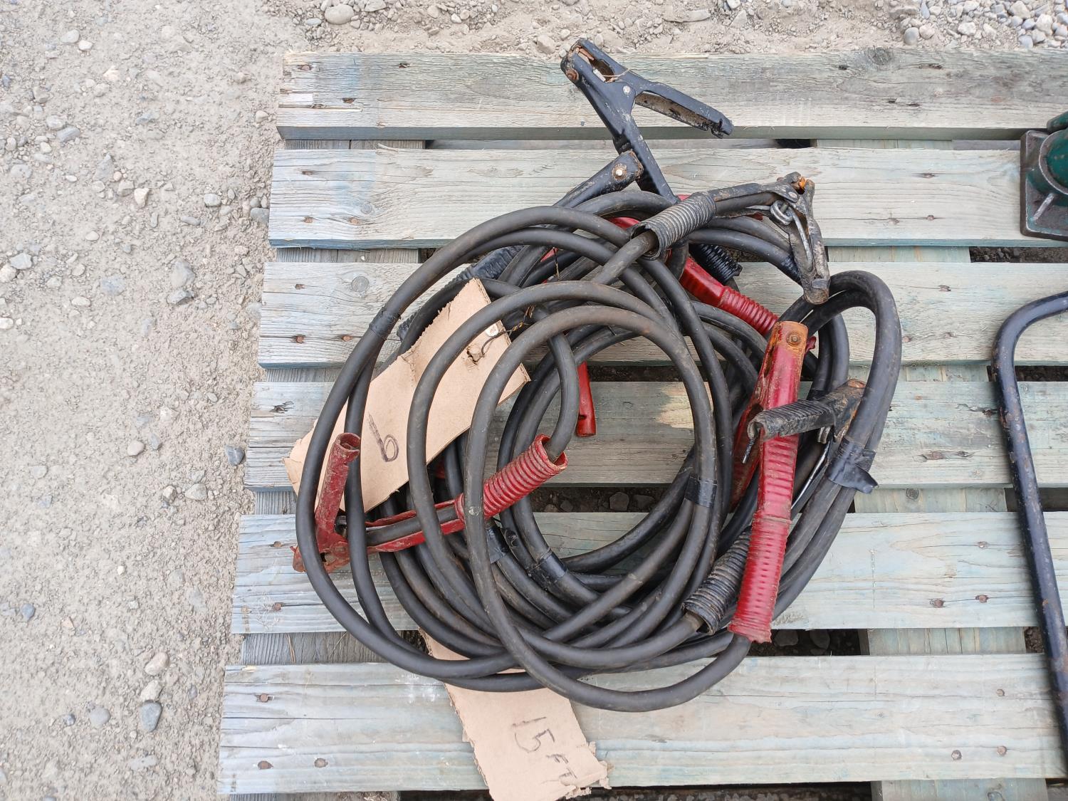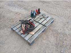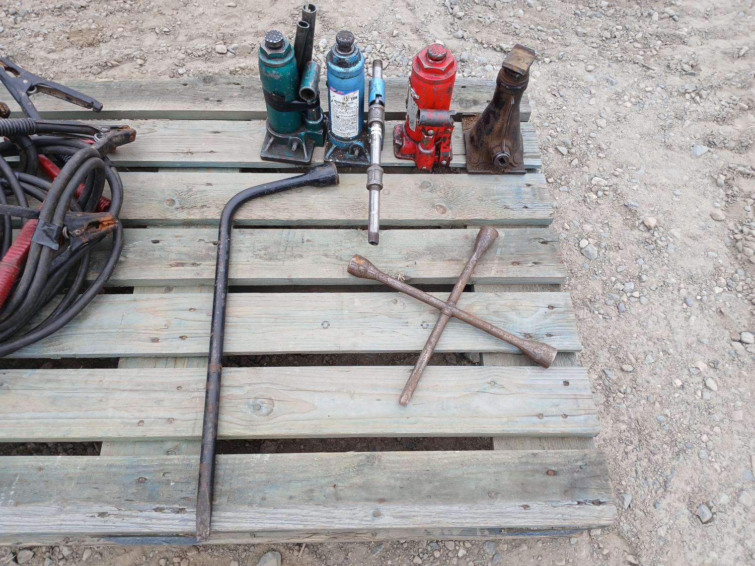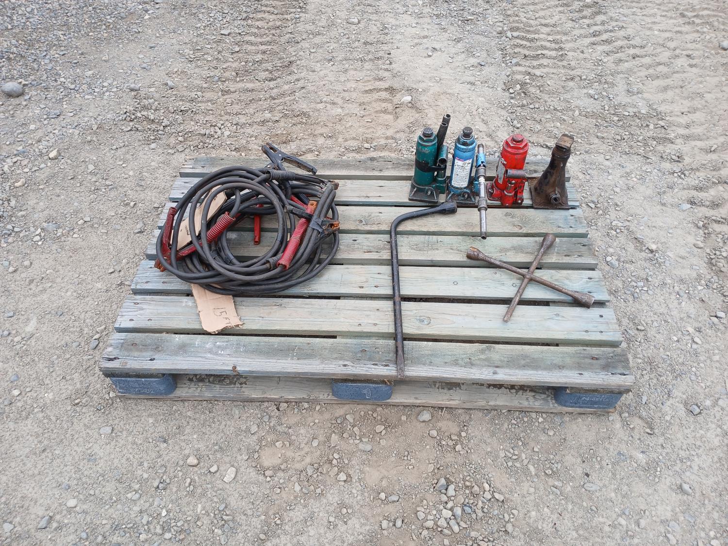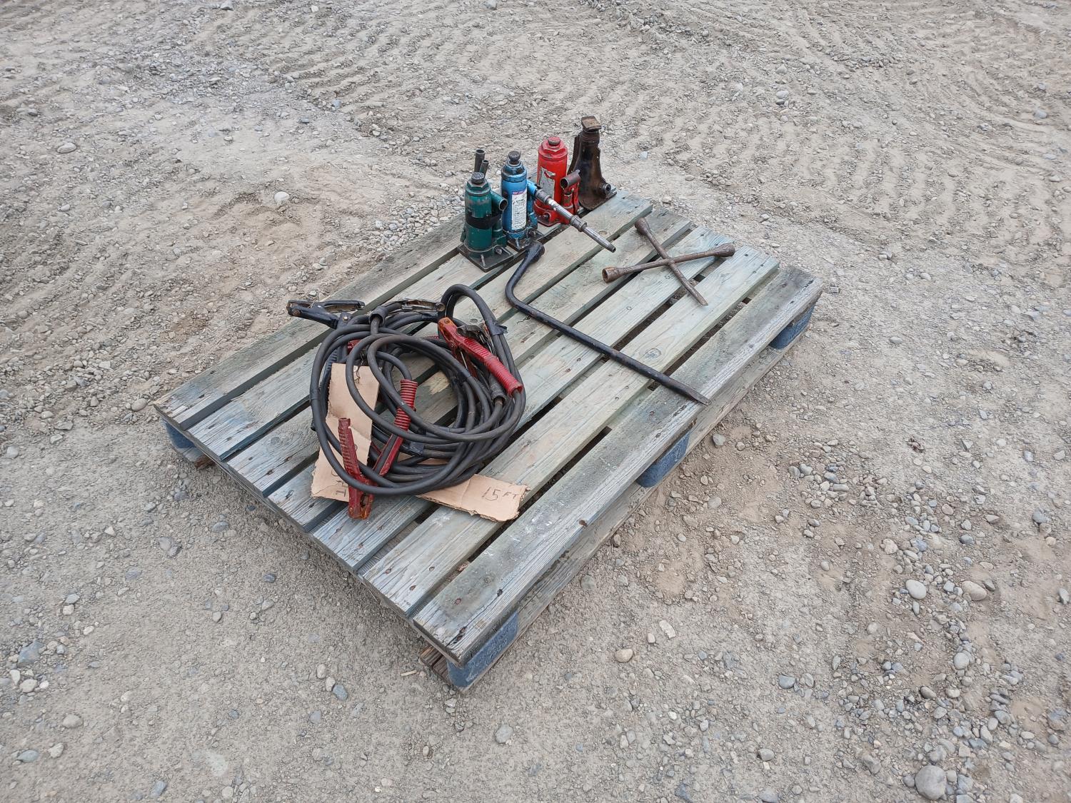 (3) bottle jacks, (1) stand jack, (2) tire irons, (2) sets 15 ft jumper cables.