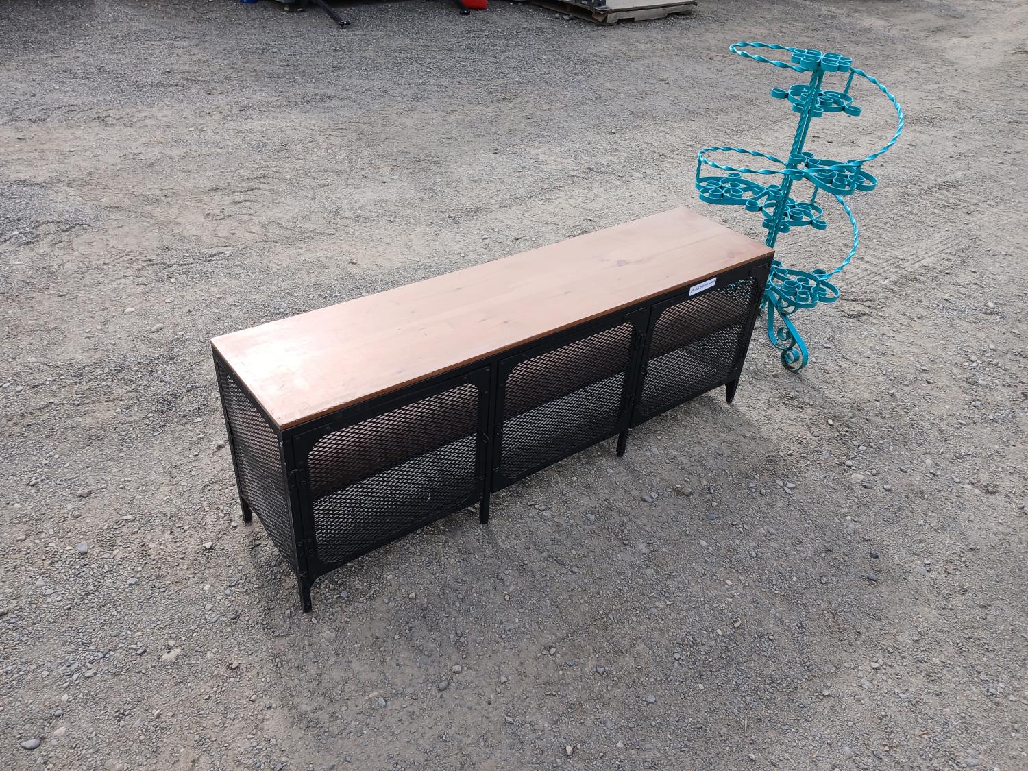 Black metal framed cabinet with wood accent top and shelving, and magnetic doors. Teal colored metal ornate plant stand.