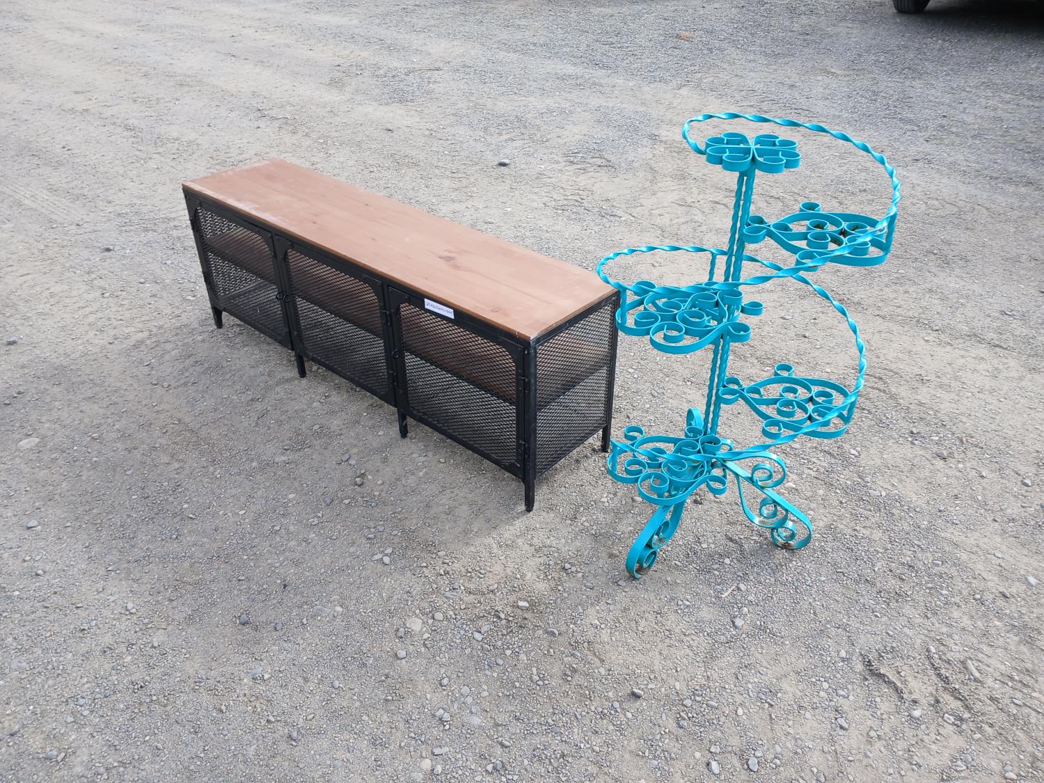 Black metal framed cabinet with wood accent top and shelving, and magnetic doors. Teal colored metal ornate plant stand.