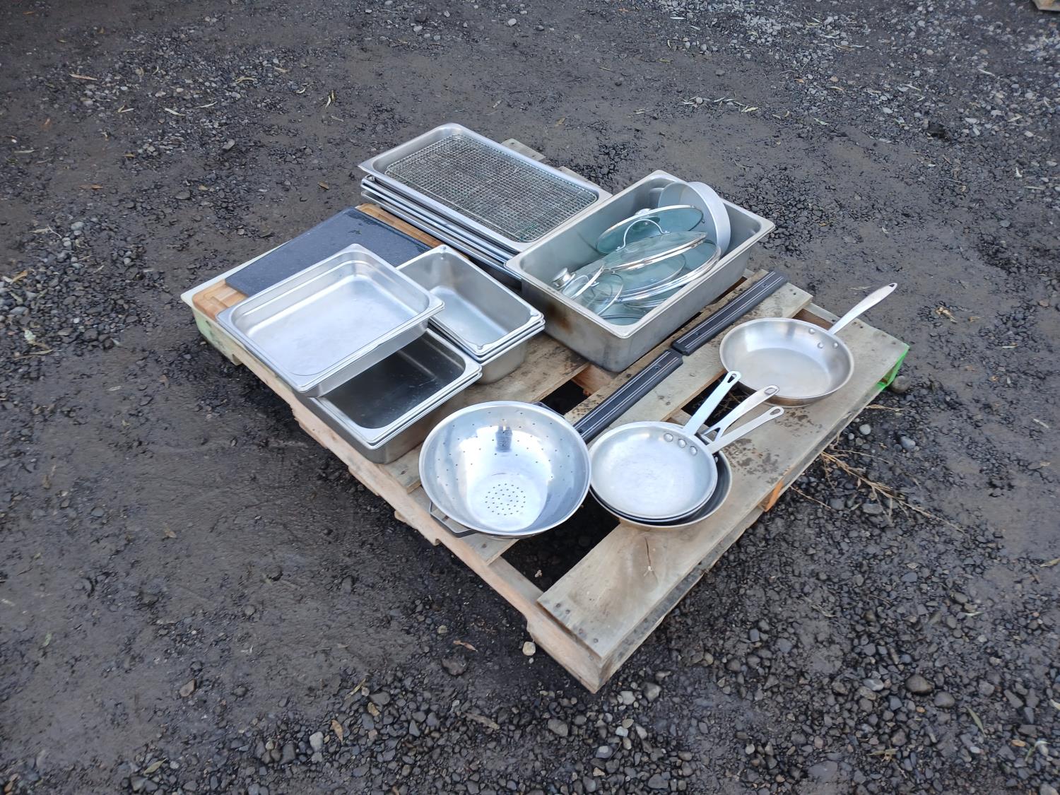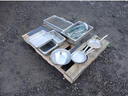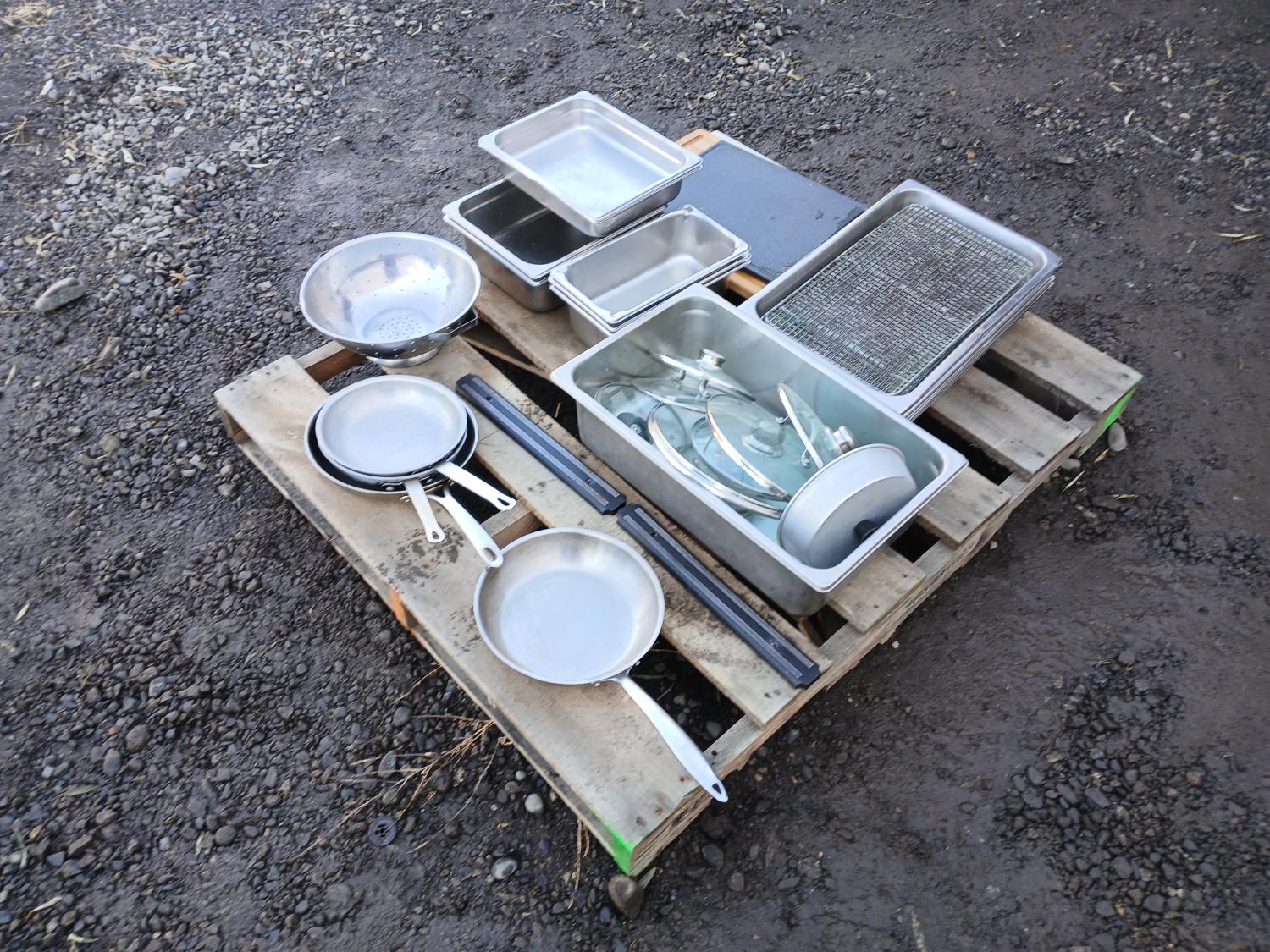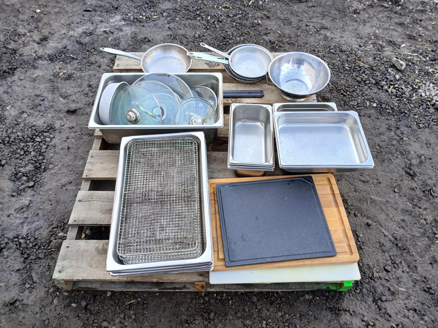 (5) Full length insets, (4) half length inserts, various small inserts, (1) colander, (3) Cutting boards (4) insert racks, (4) sauce pans (7) various sized lids.