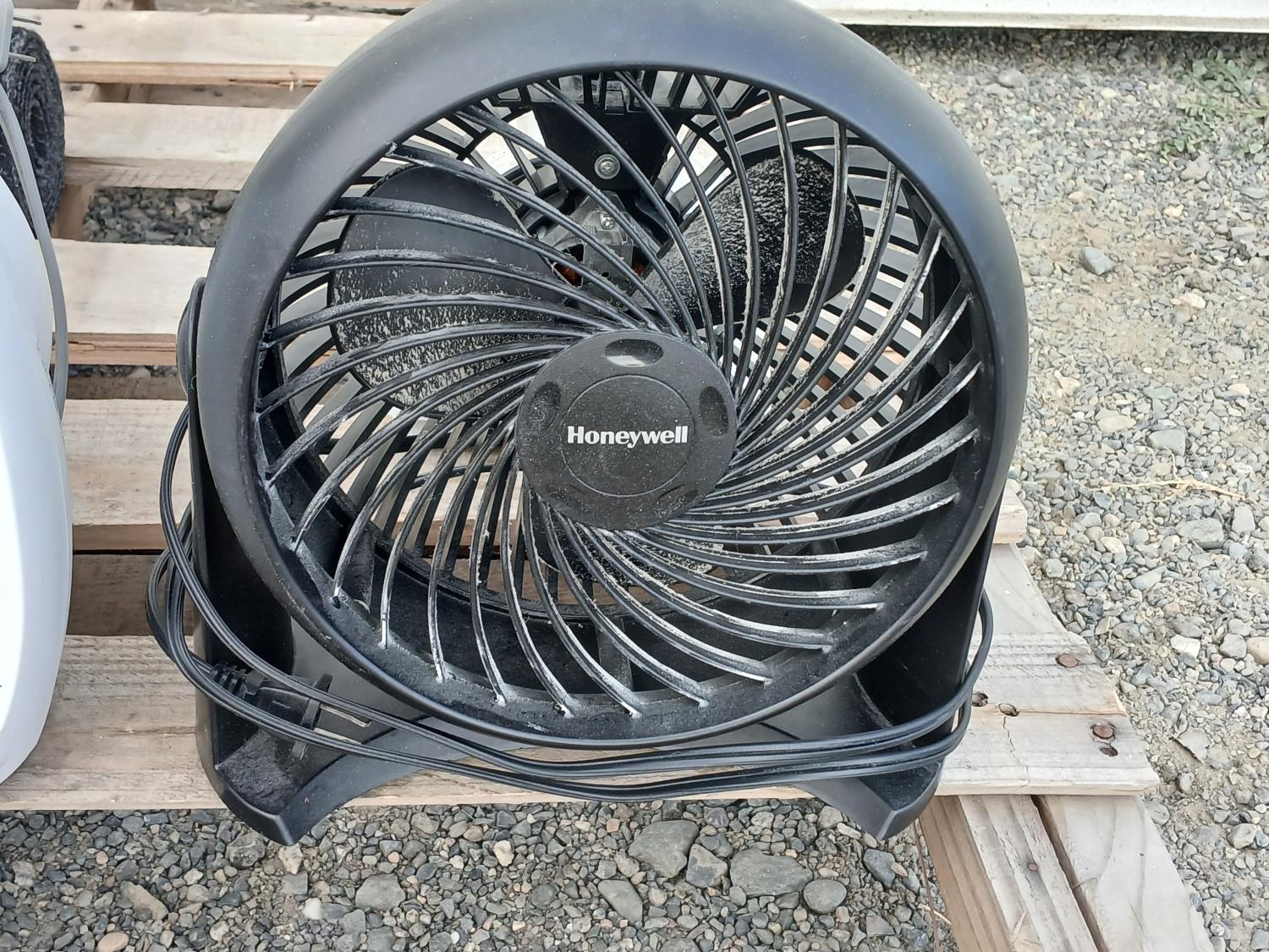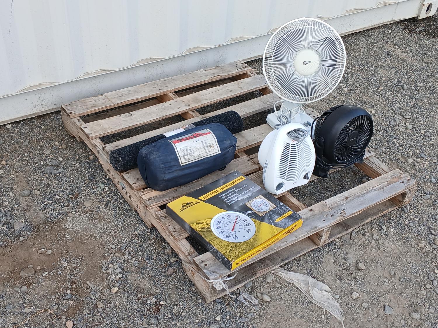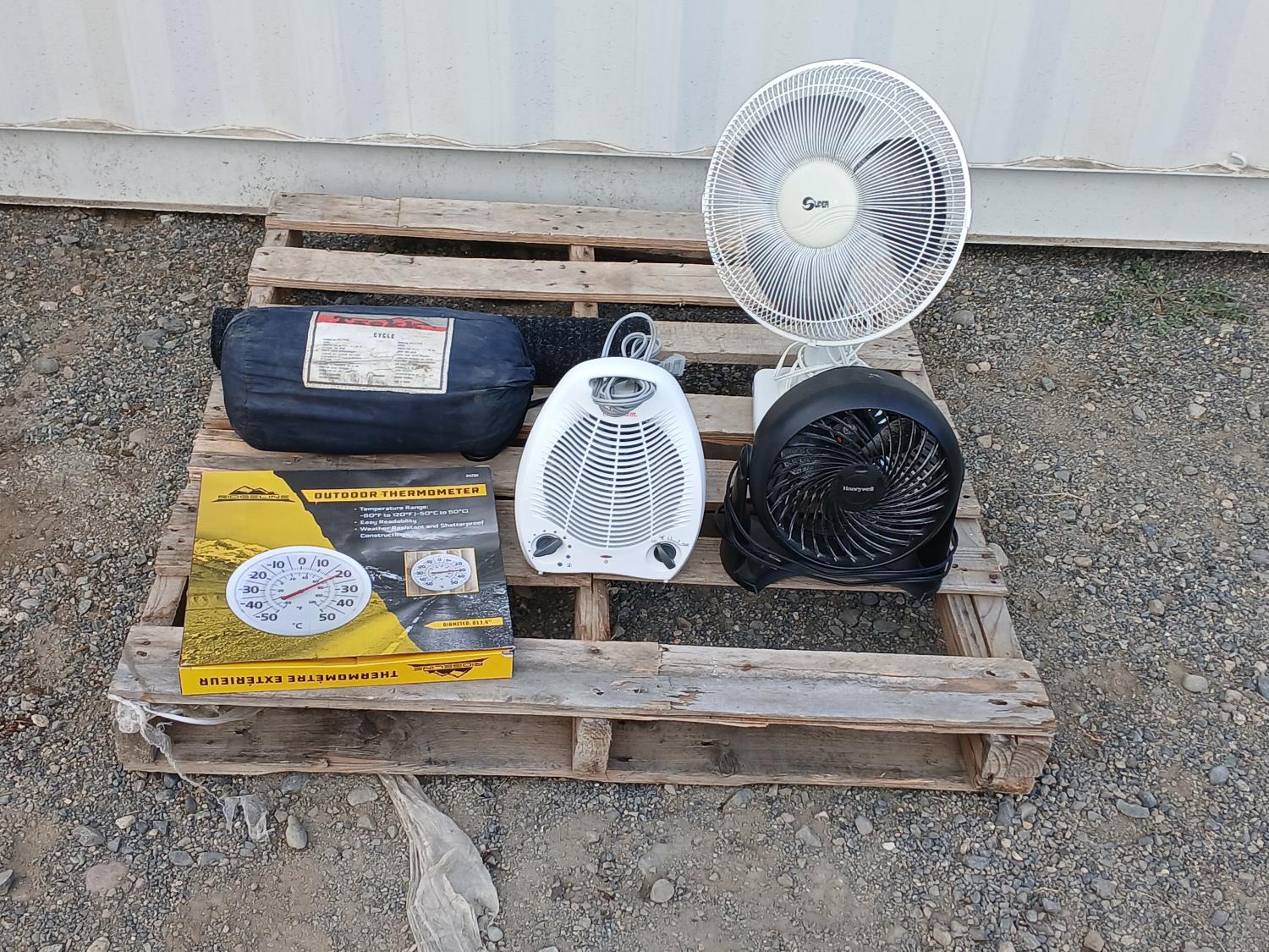 (1) Trekk cycle sleeping bag, (1) Maison ribbed indoor/outdoor carpet runner, (2) Honeywell/Super household fans, (1) Sunbeam space heater, (1) outdoor thermometer.