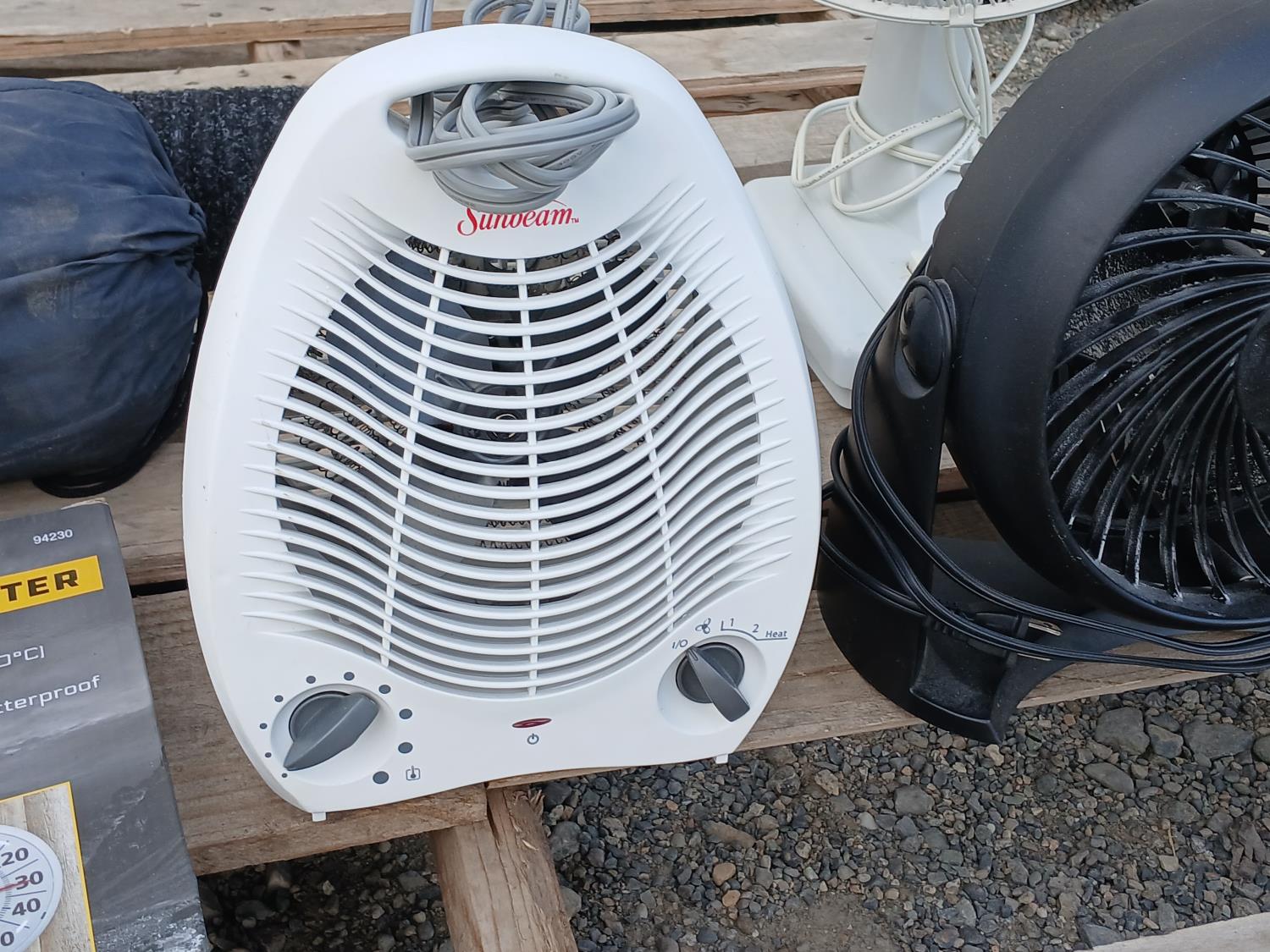 (1) Trekk cycle sleeping bag, (1) Maison ribbed indoor/outdoor carpet runner, (2) Honeywell/Super household fans, (1) Sunbeam space heater, (1) outdoor thermometer.